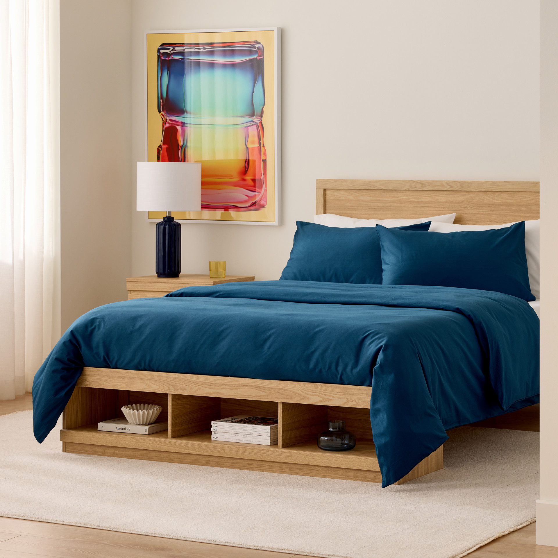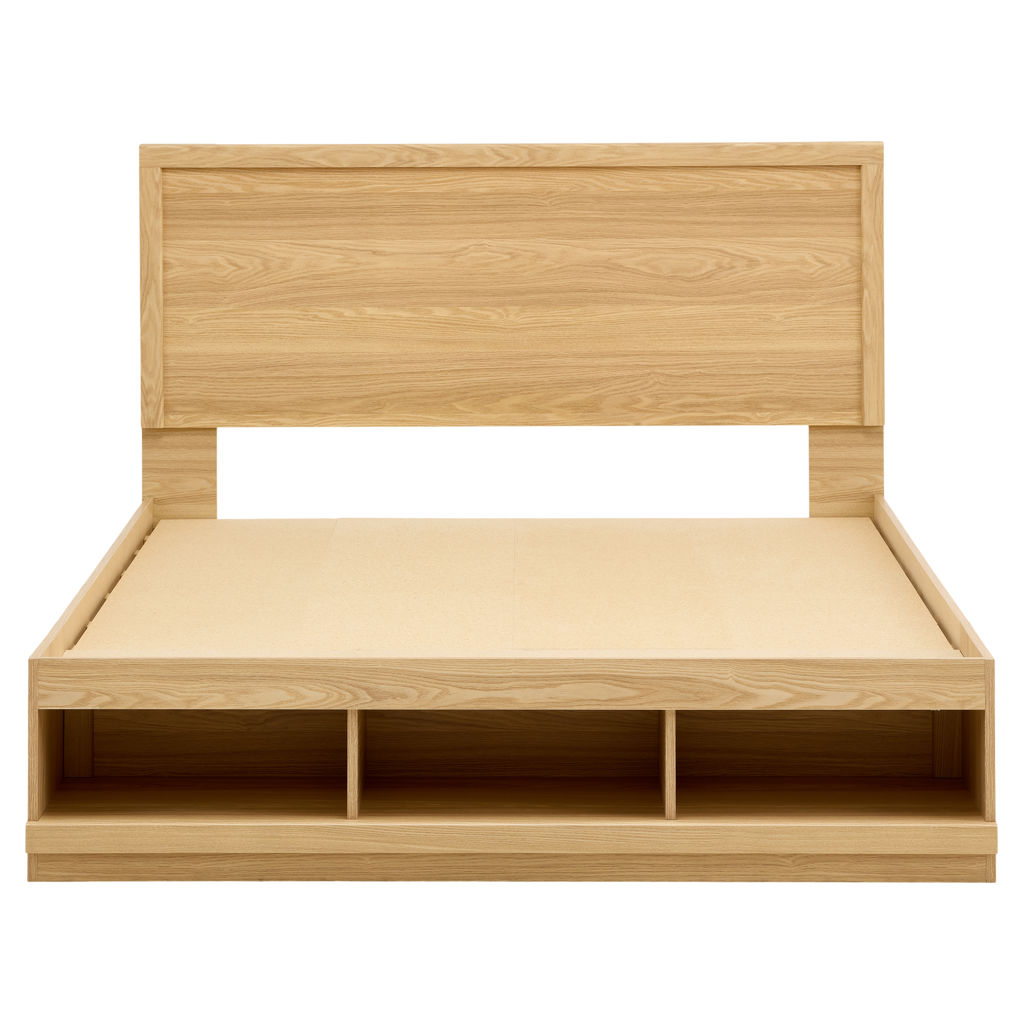 Featuring open storage integrated into the base, the platform bed offers functional space for your books, decorative objects or everyday essentials, while keeping your bedroom tidy. The understated headboard with matching frame completes the look with elegance.