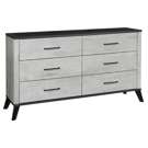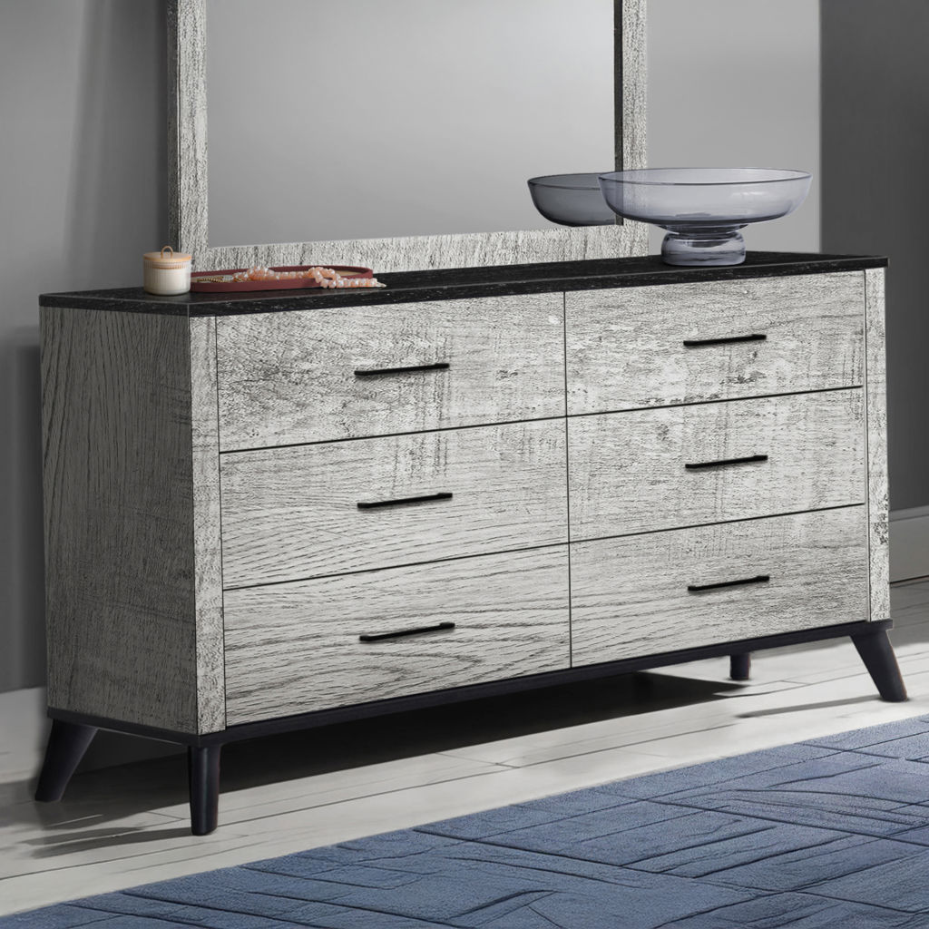 The elegant dresser features a grey reclaimed wood-look laminate finish paired with a sophisticated black top, effortlessly blending rustic warmth with modern elegance.