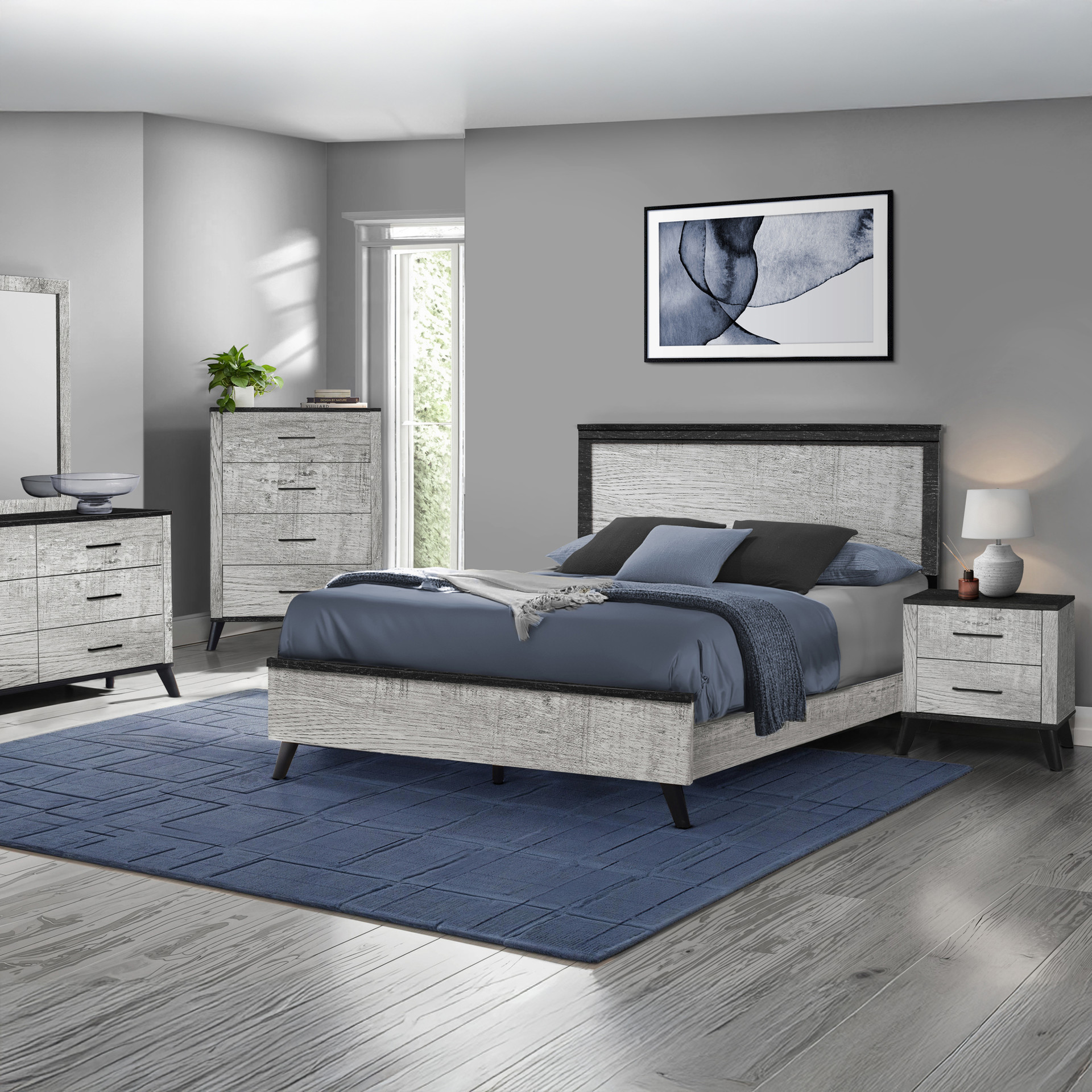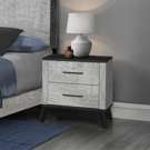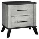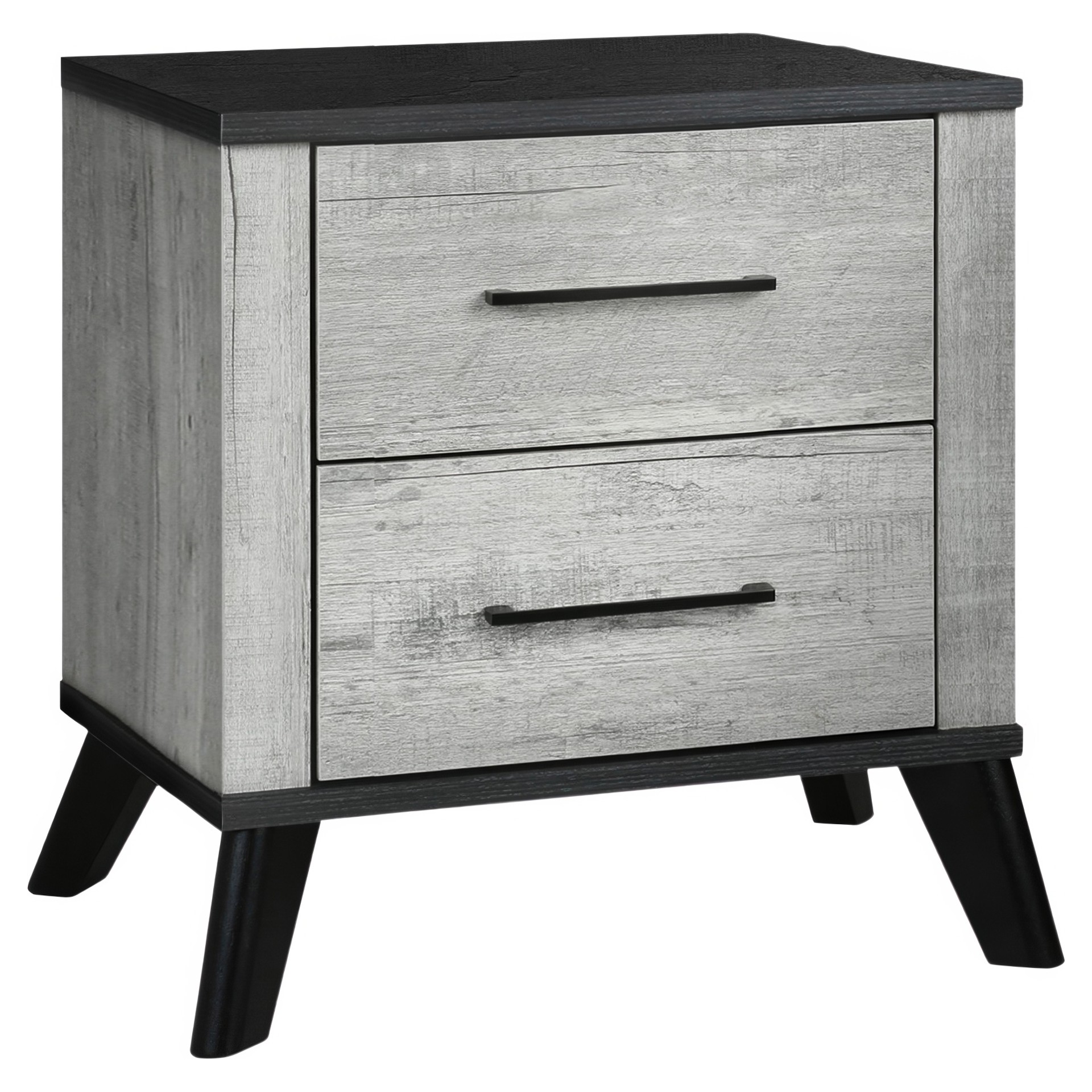 Finished in the same grey reclaimed wood-look laminate with a rich black top, the nightstand embodies sleek sophistication and lasting durability.