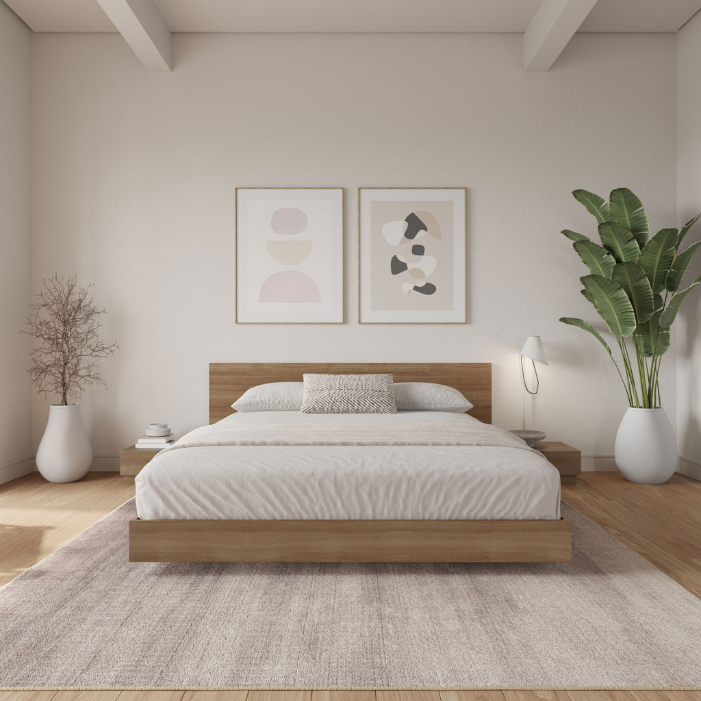 • Satori Brown Oak Platform Bed with Headboard - Queen : 84 X 6 X 22