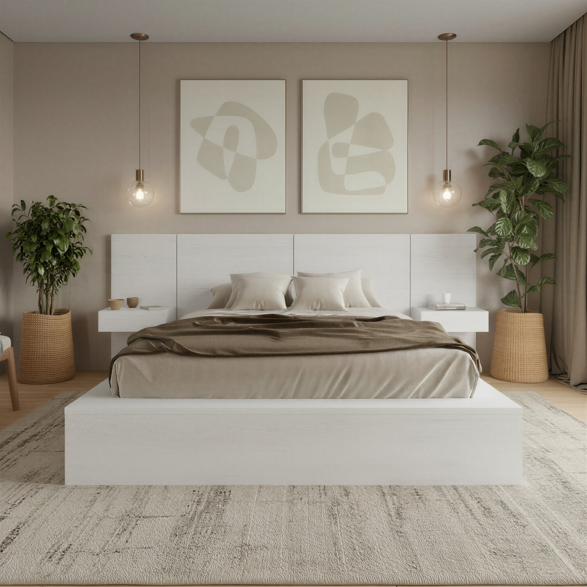Bring a modern and harmonious look to your bedroom with the Napa bedroom set, featuring a platform bed, headboard, and two matching nightstands. Its clean design and balanced lines create a space that is both stylish and functional.