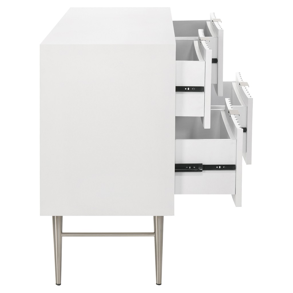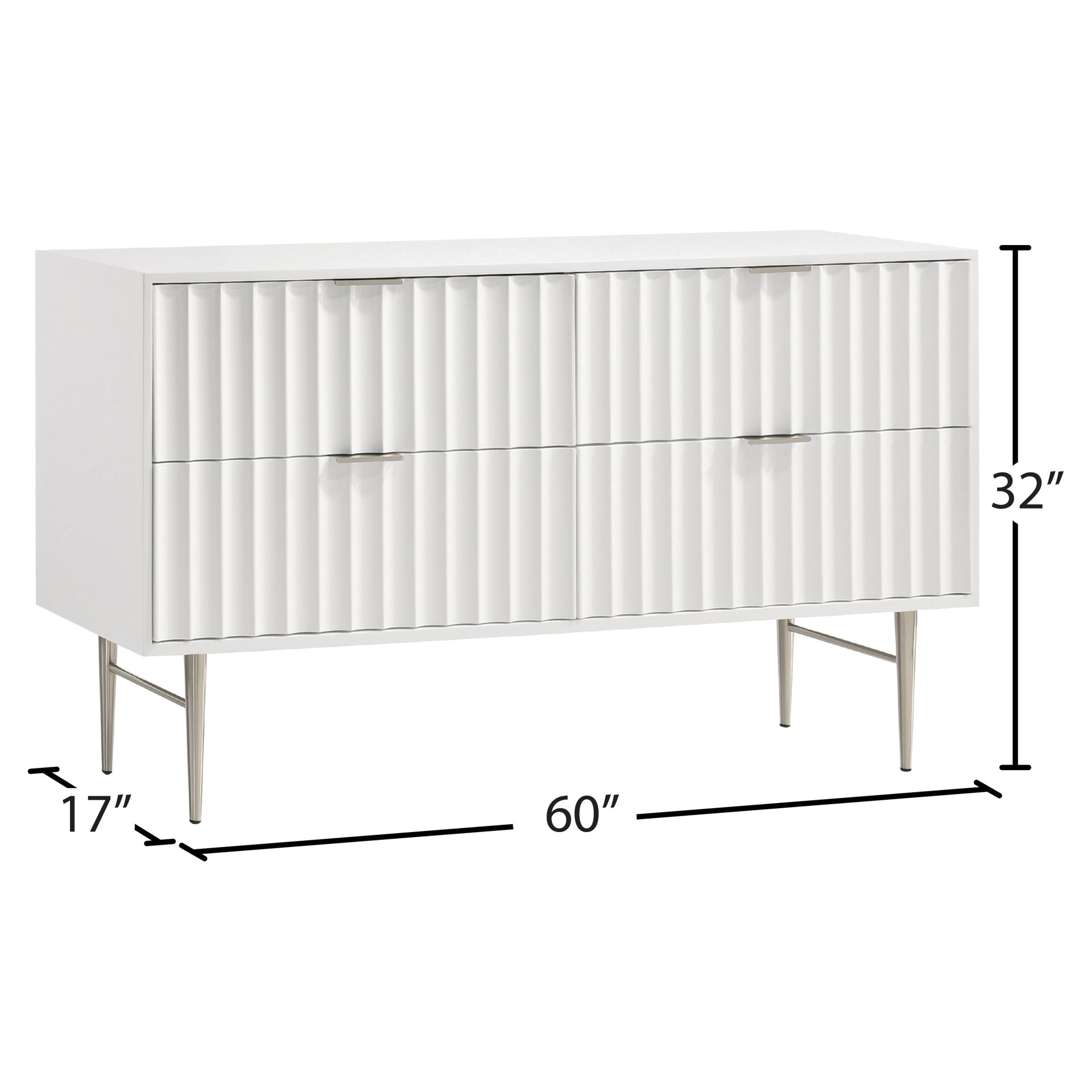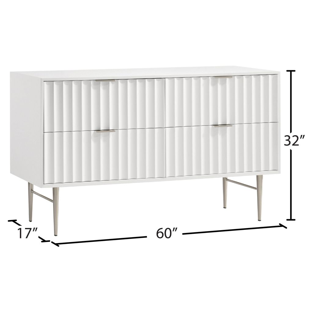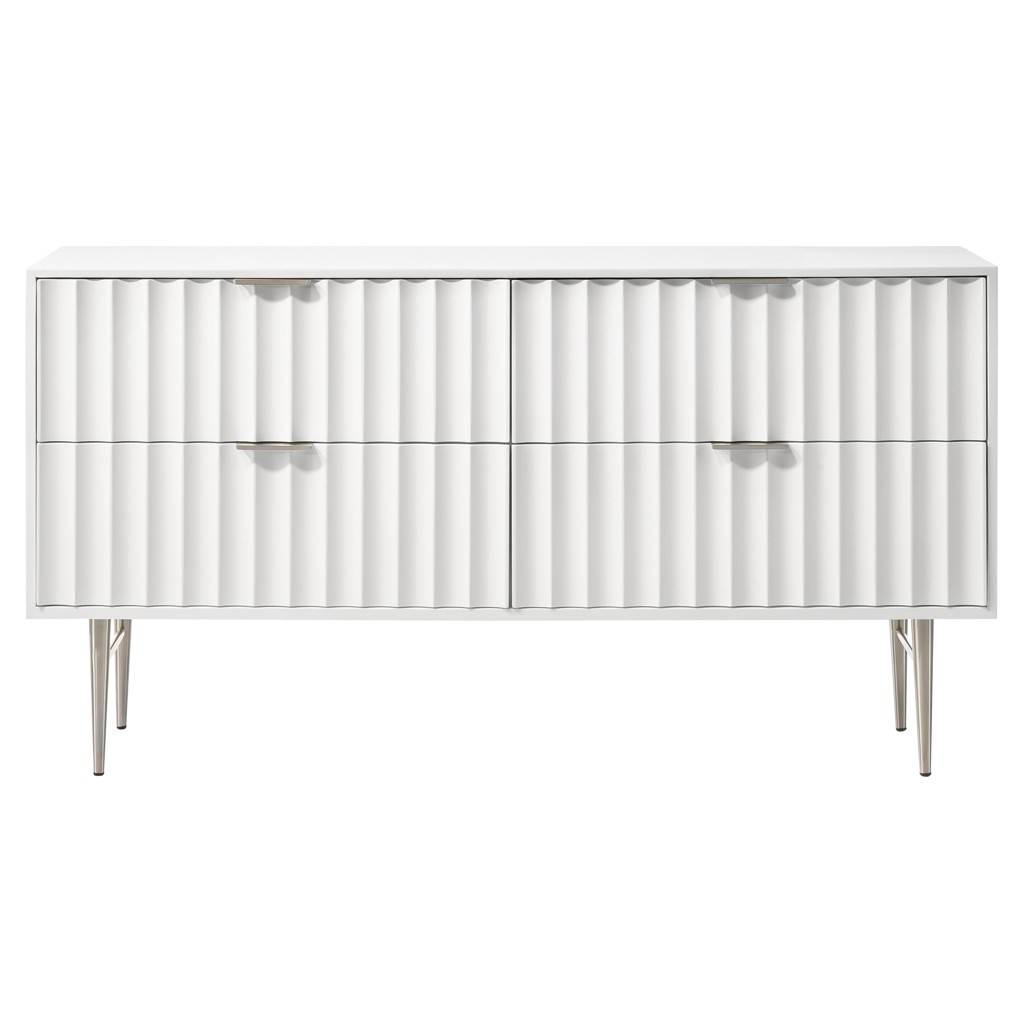 Embody industrialist style with this Modernist dresser in a white medium gloss finish. Utilitarian but sculptural in design, this piece features a ridged, textured look that is chic but sleek.