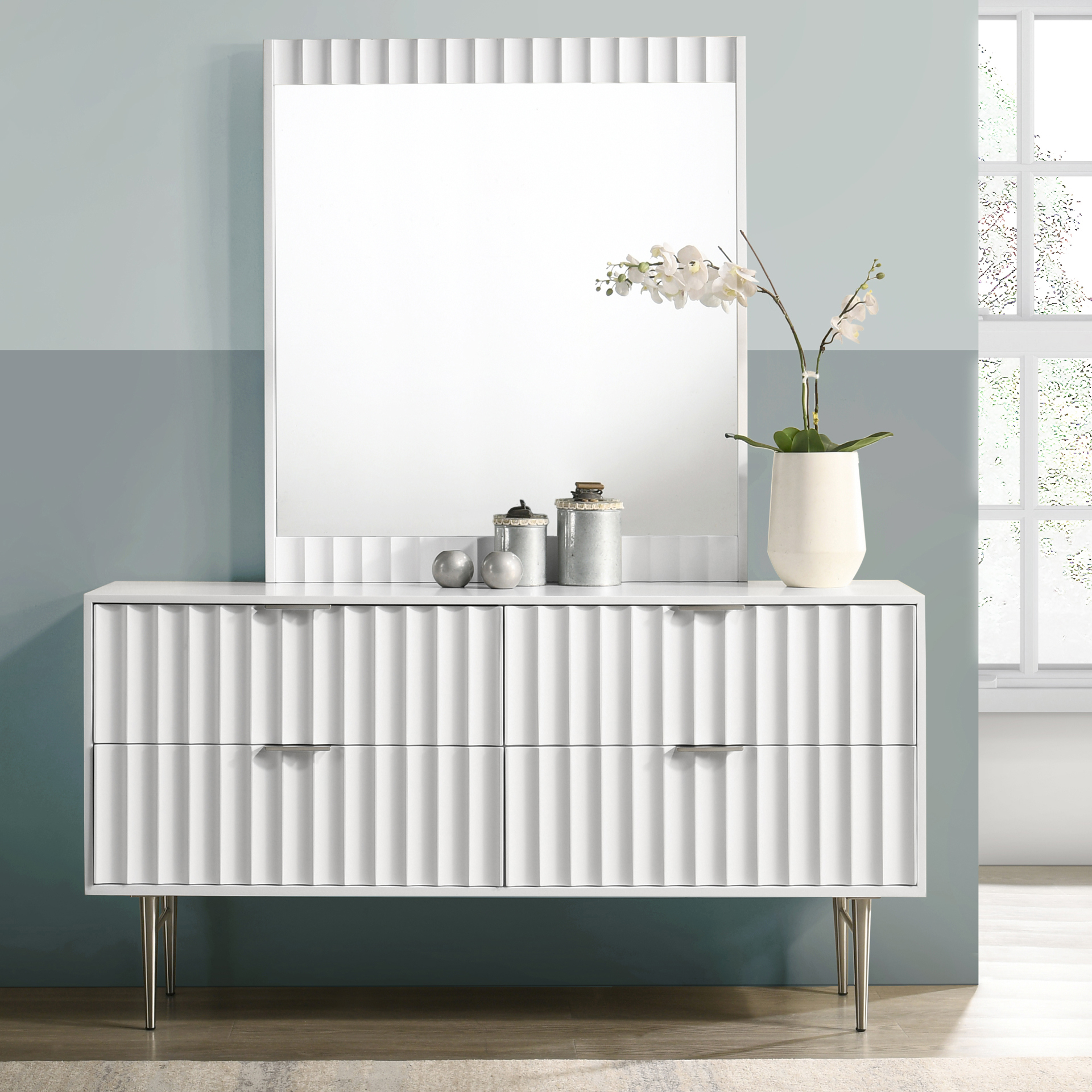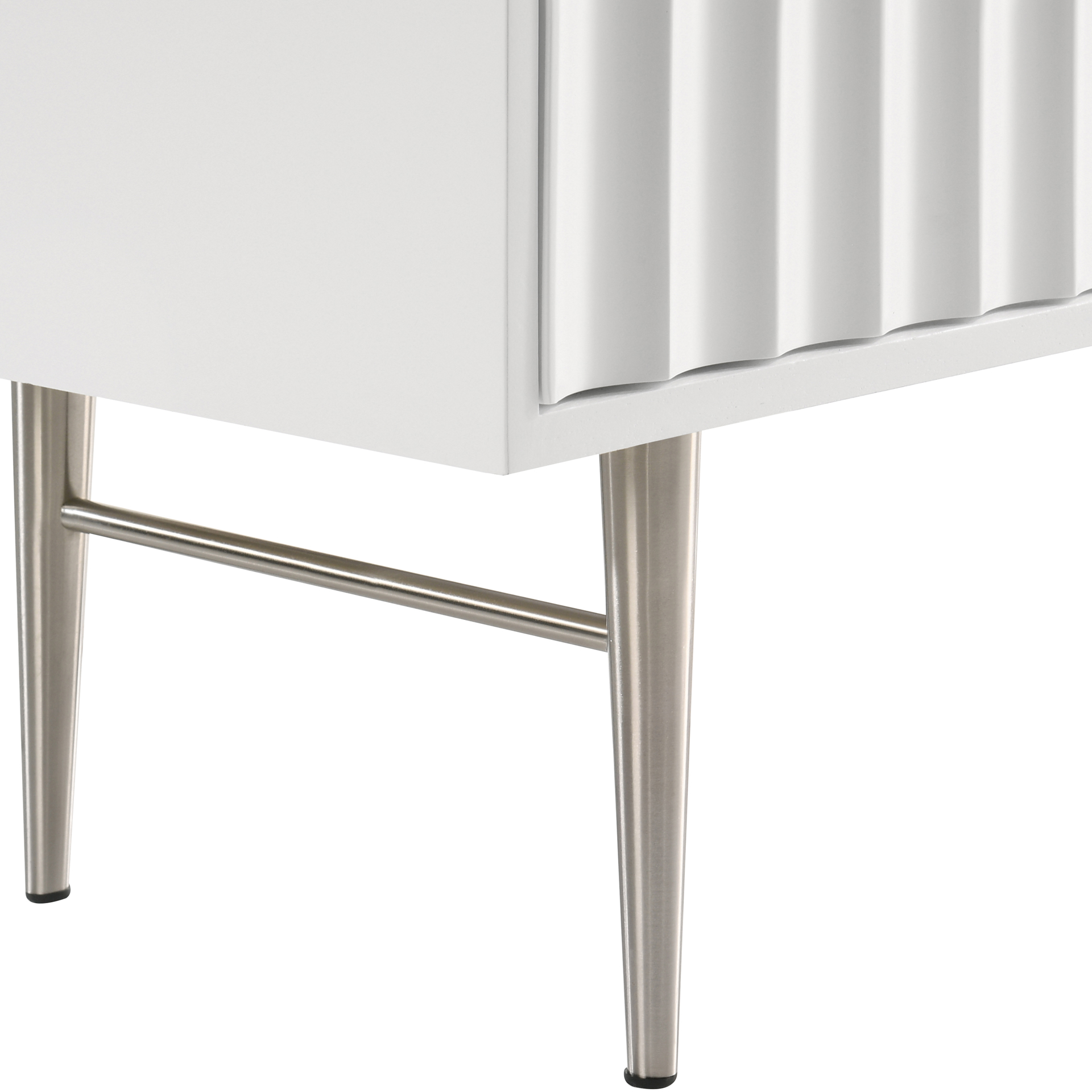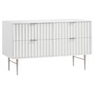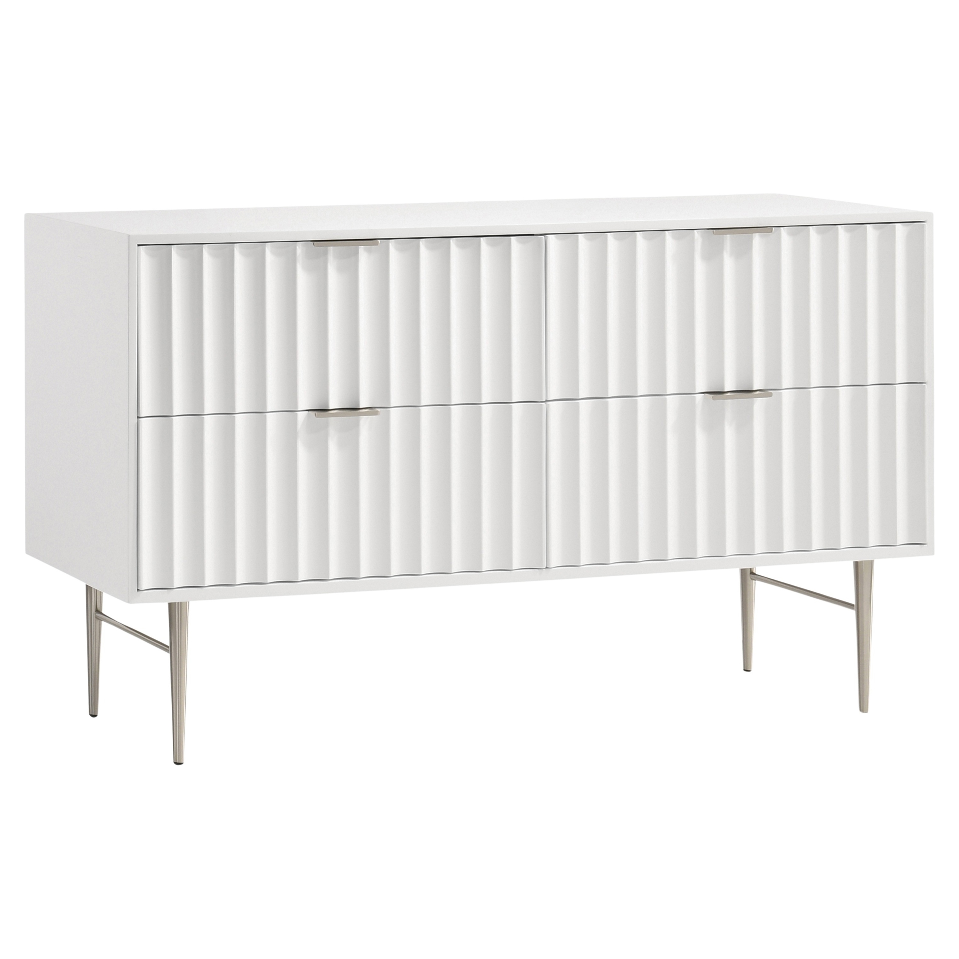 Embody industrialist style with this Modernist dresser in a white medium gloss finish. Utilitarian but sculptural in design, this piece features a ridged, textured look that is chic but sleek.