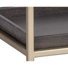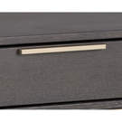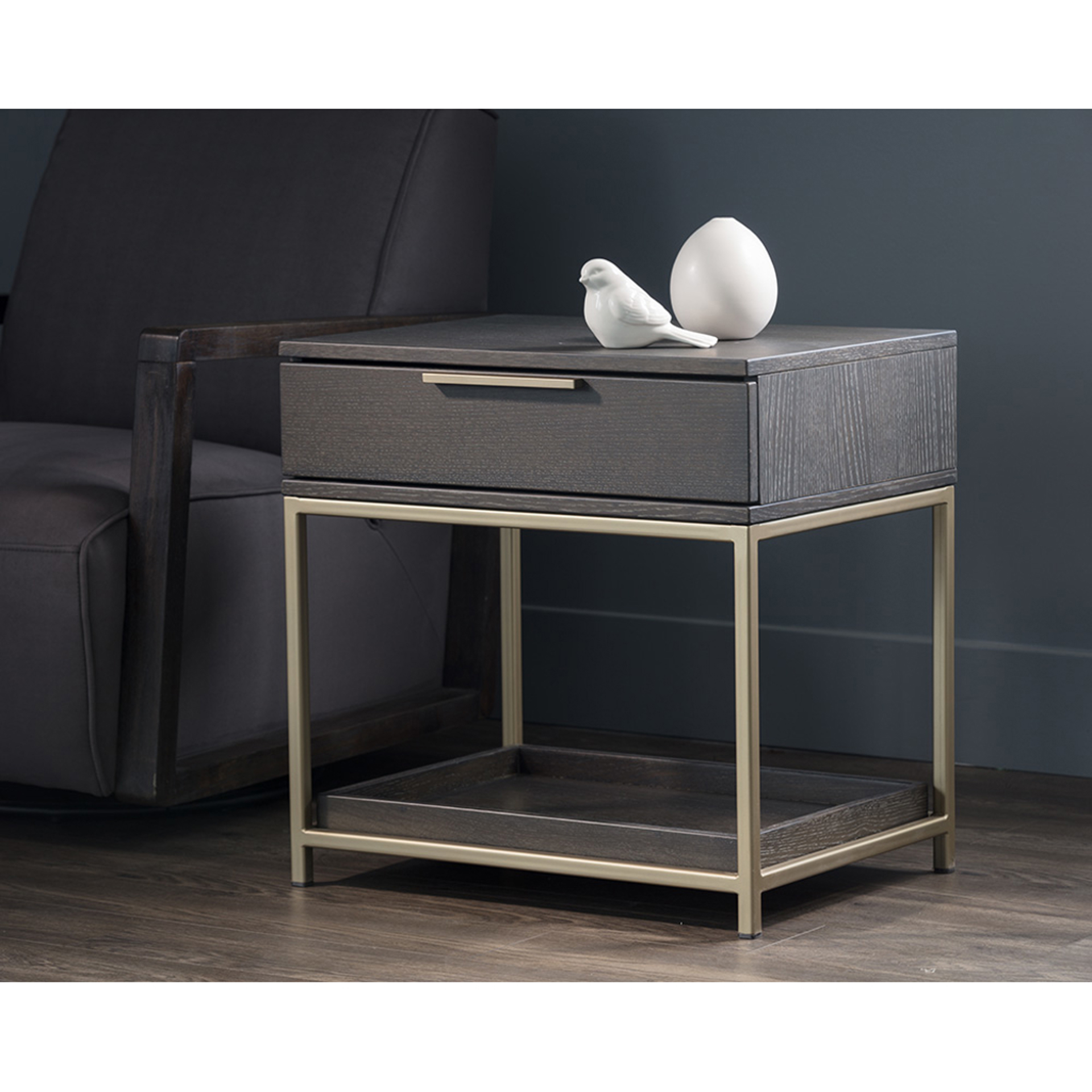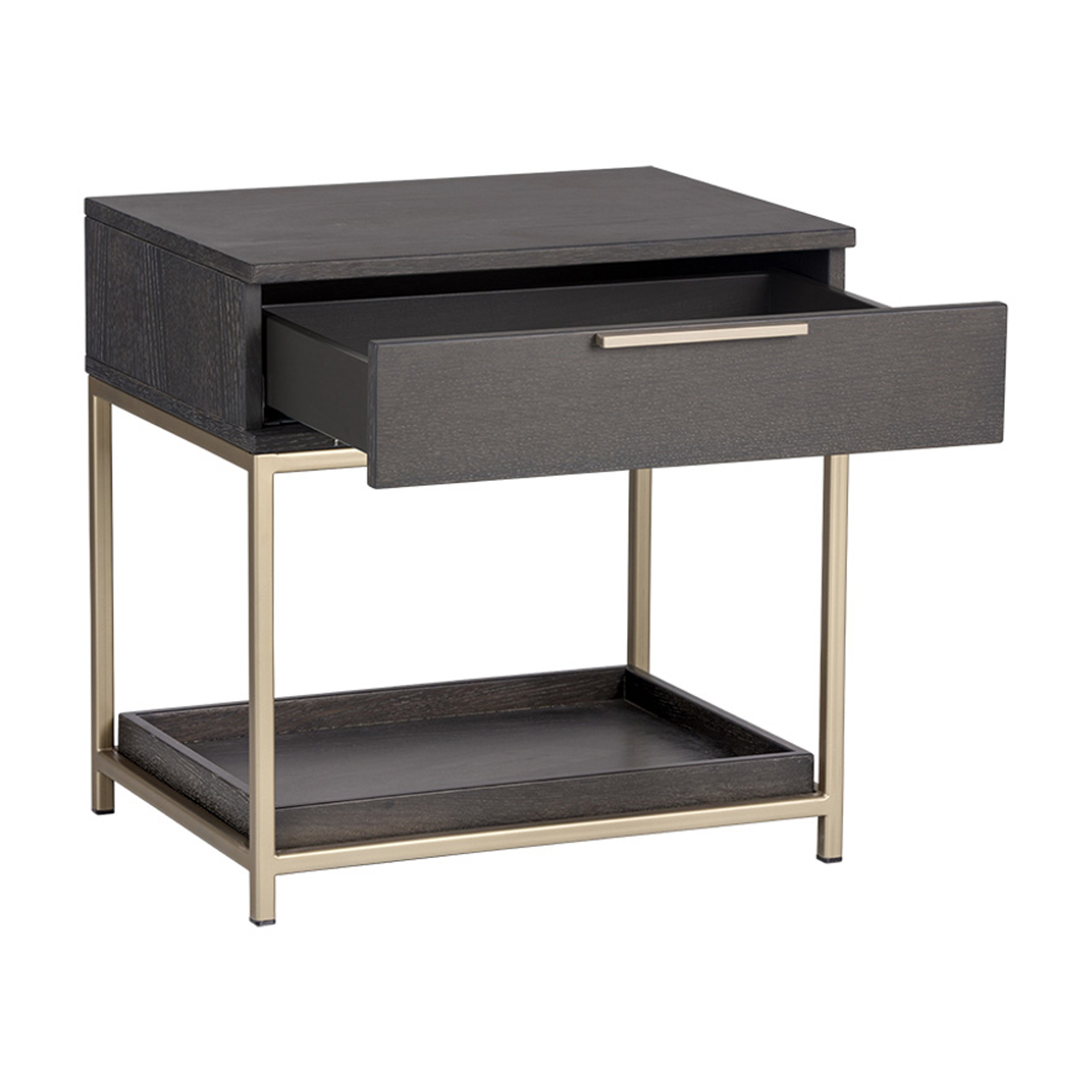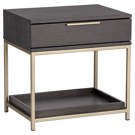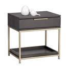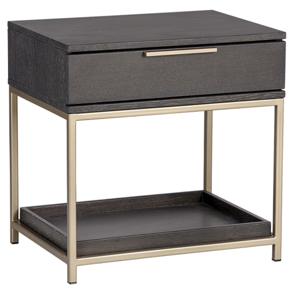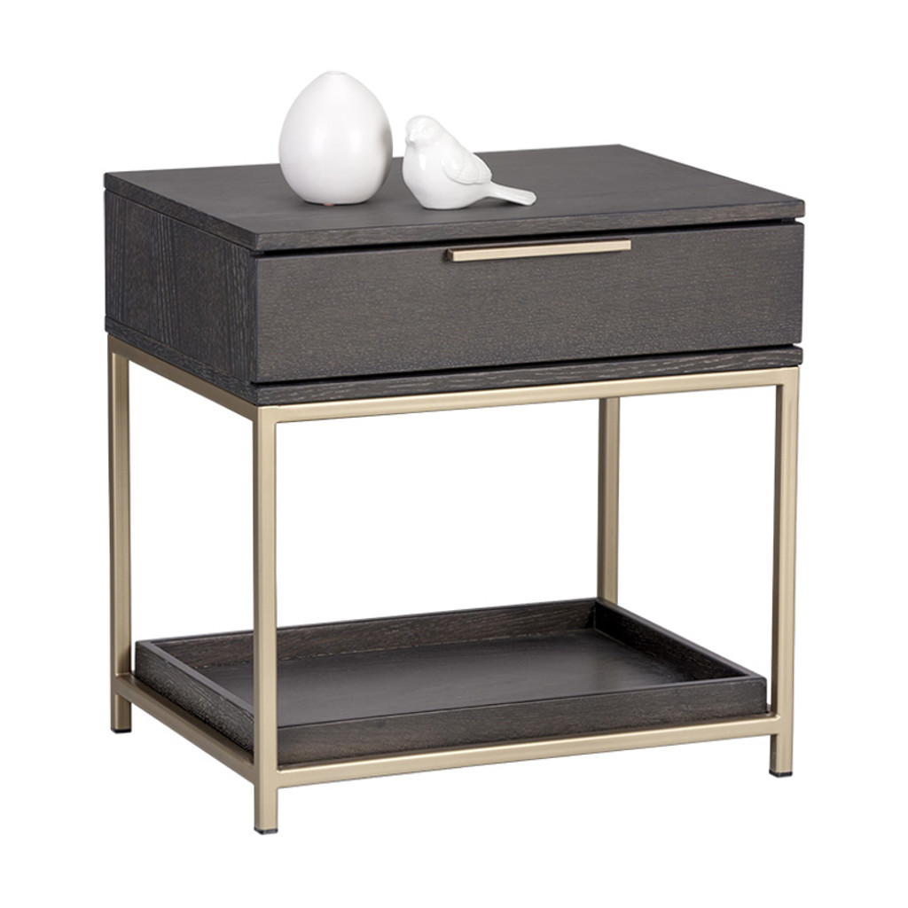 A contemporary nightstand from our Artezia collection designed to add a beautiful touch to any bedroom. It is finished in charcoal gray oak veneer. A drawer and shelf provide extra storage. Brushed gold metal hardware completes the look. It can be paired with a matching dresser.