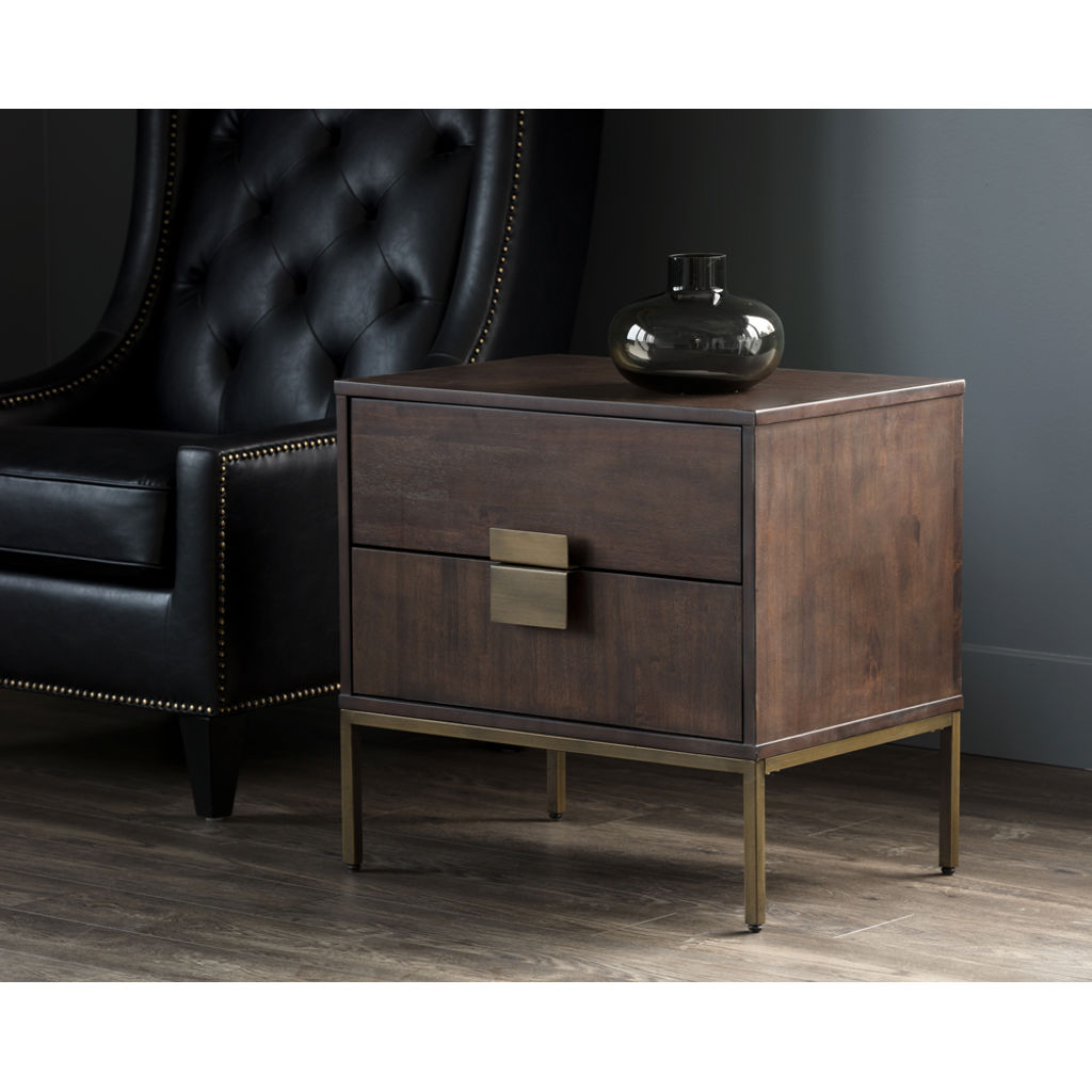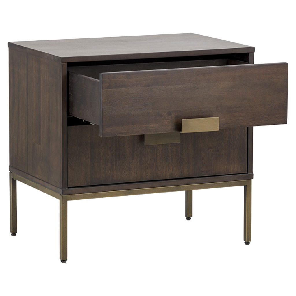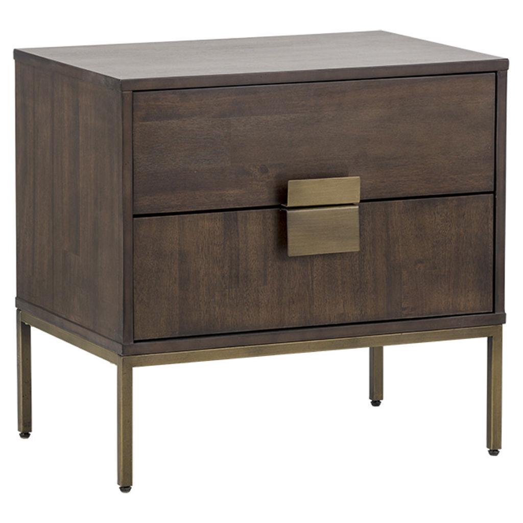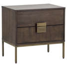 This uniquely crafted nightstand from our MIXT collection will add a transitional look to any room. Two drawers are finished with acacia wood veneer. Alternating wood grain patterns on the drawer fronts and antique brass hardware complete the look. Suitable for residential and commercial environments.