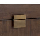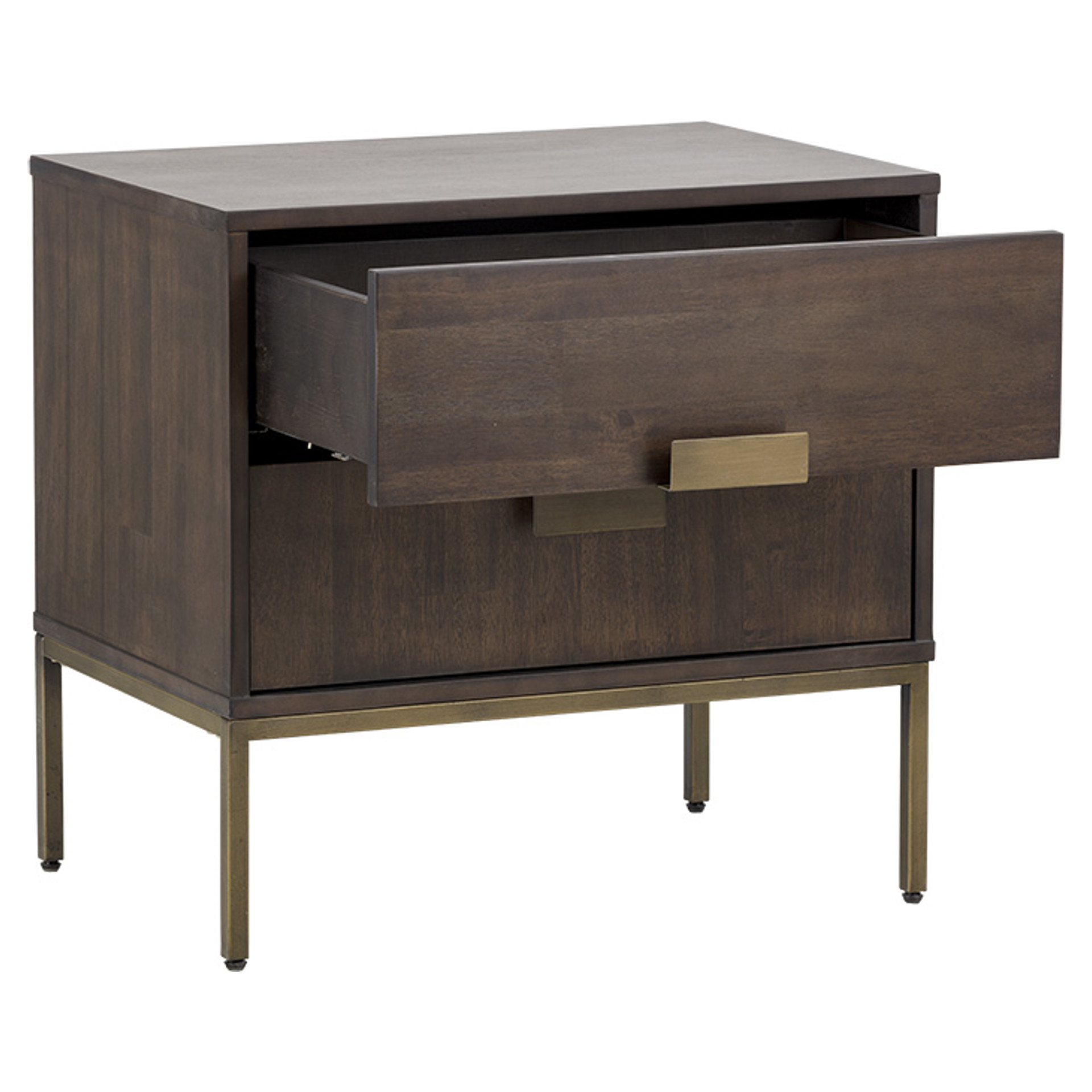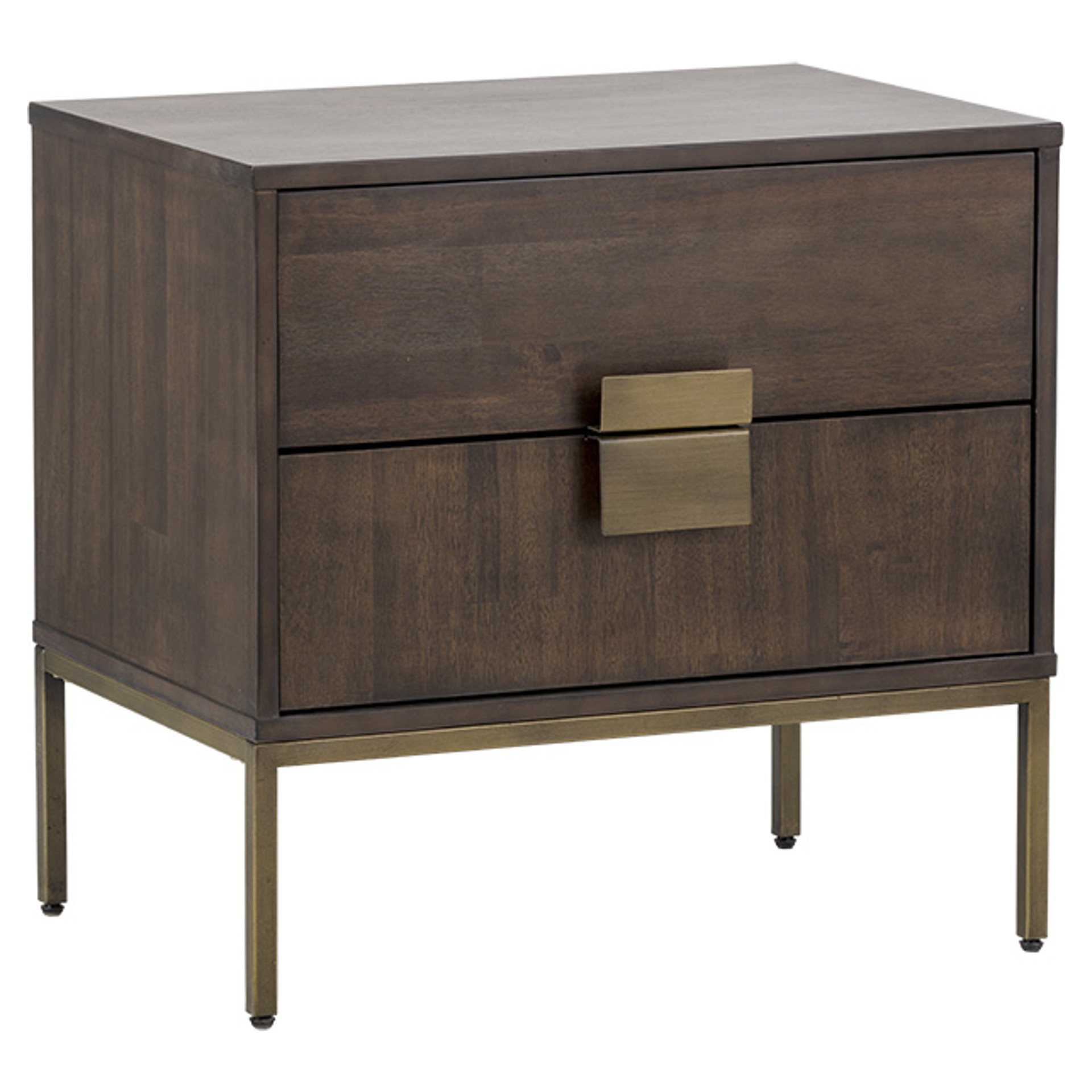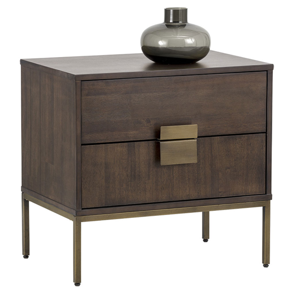 This uniquely crafted nightstand from our MIXT collection will add a transitional look to any room. Two drawers are finished with acacia wood veneer. Alternating wood grain patterns on the drawer fronts and antique brass hardware complete the look. Suitable for residential and commercial environments.