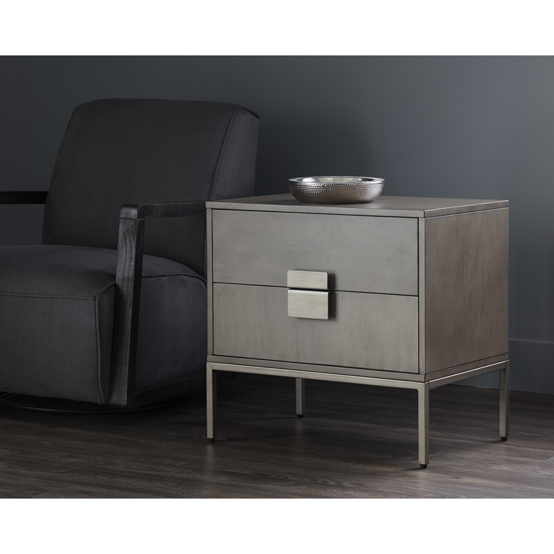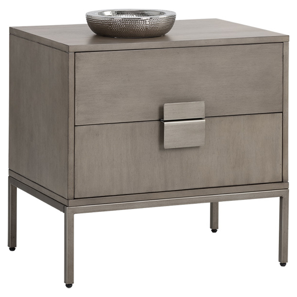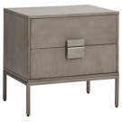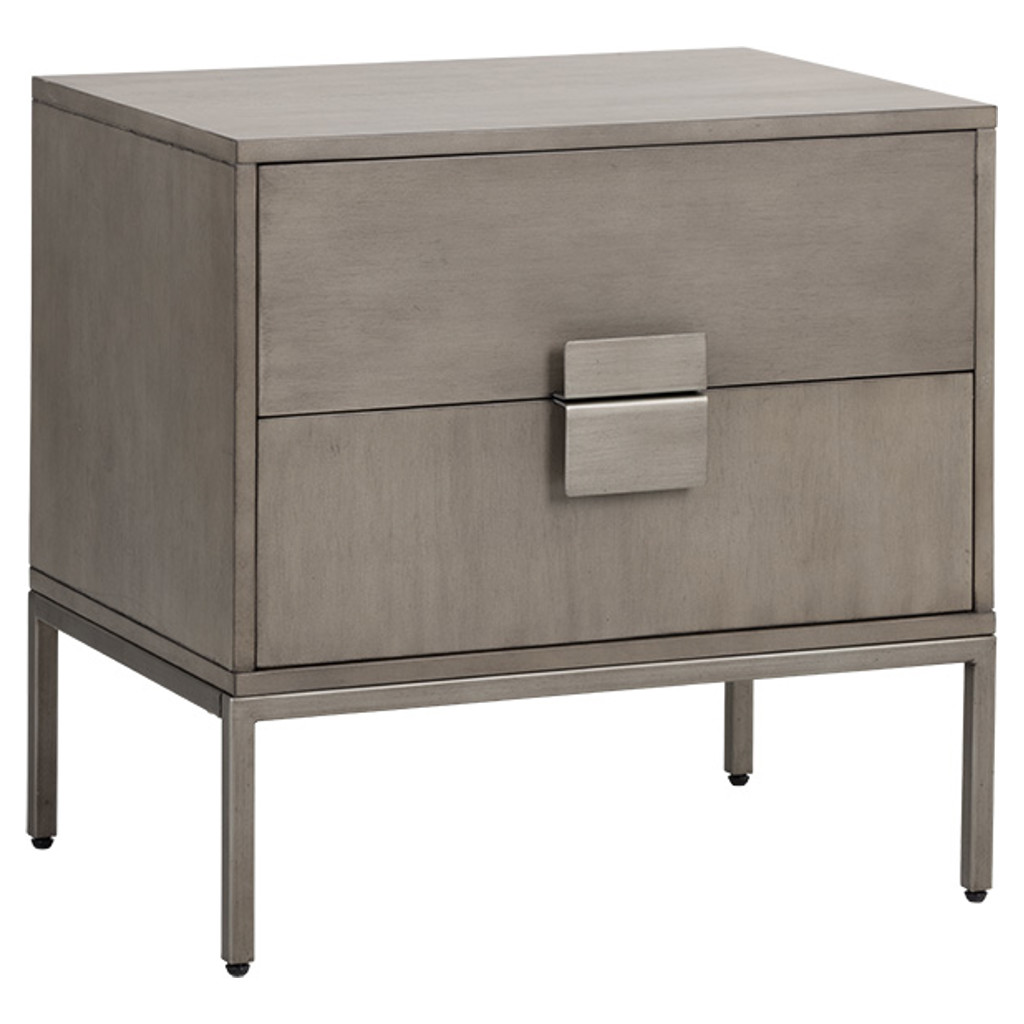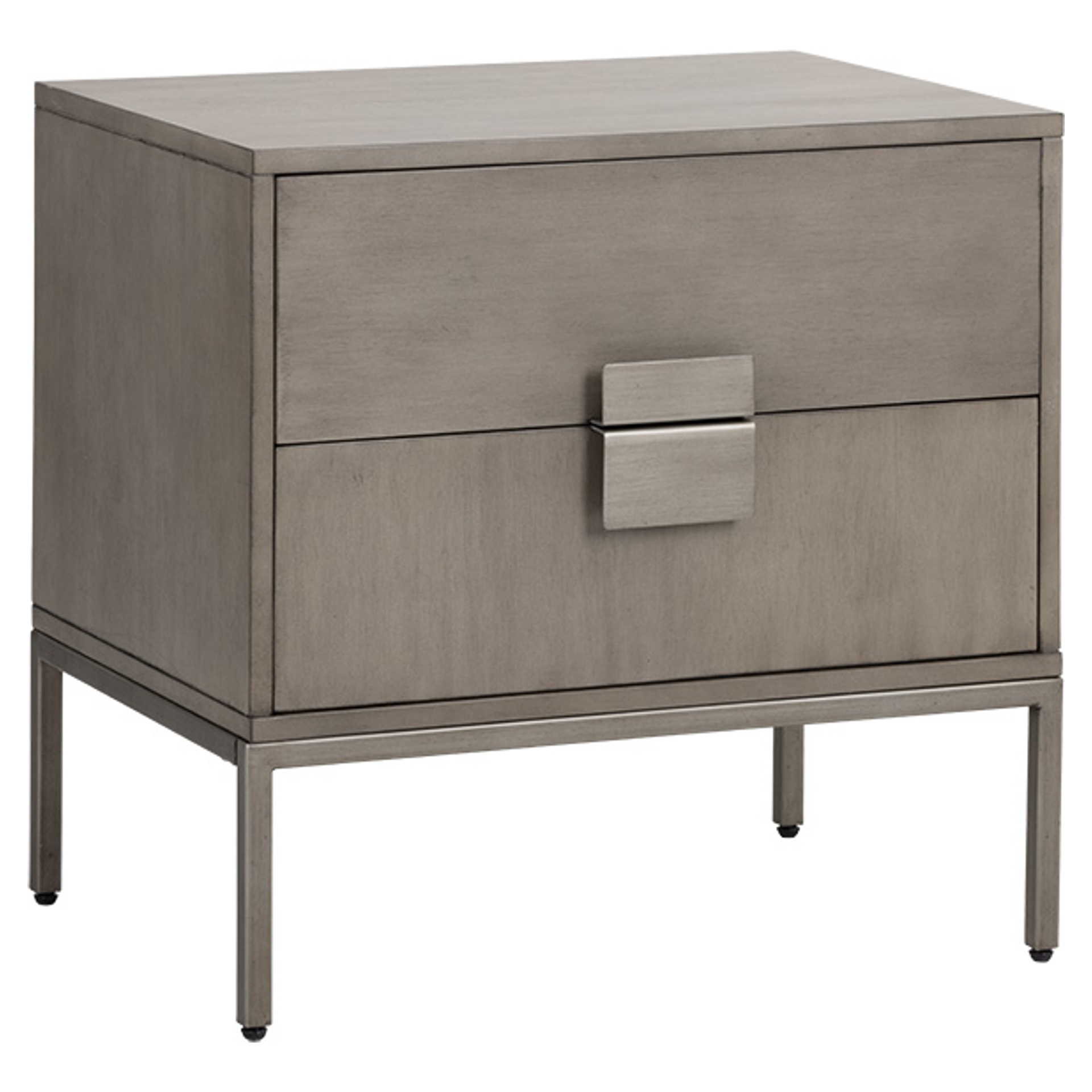 This uniquely crafted nightstand from our MIXT collection will add transitional allure to any bedroom. Made from ash grey acacia wood veneer with two soft closing drawers. Alternating wood grain patterns on the drawer fronts and antique silver hardware complete the look. Suitable for residential and contract settings.