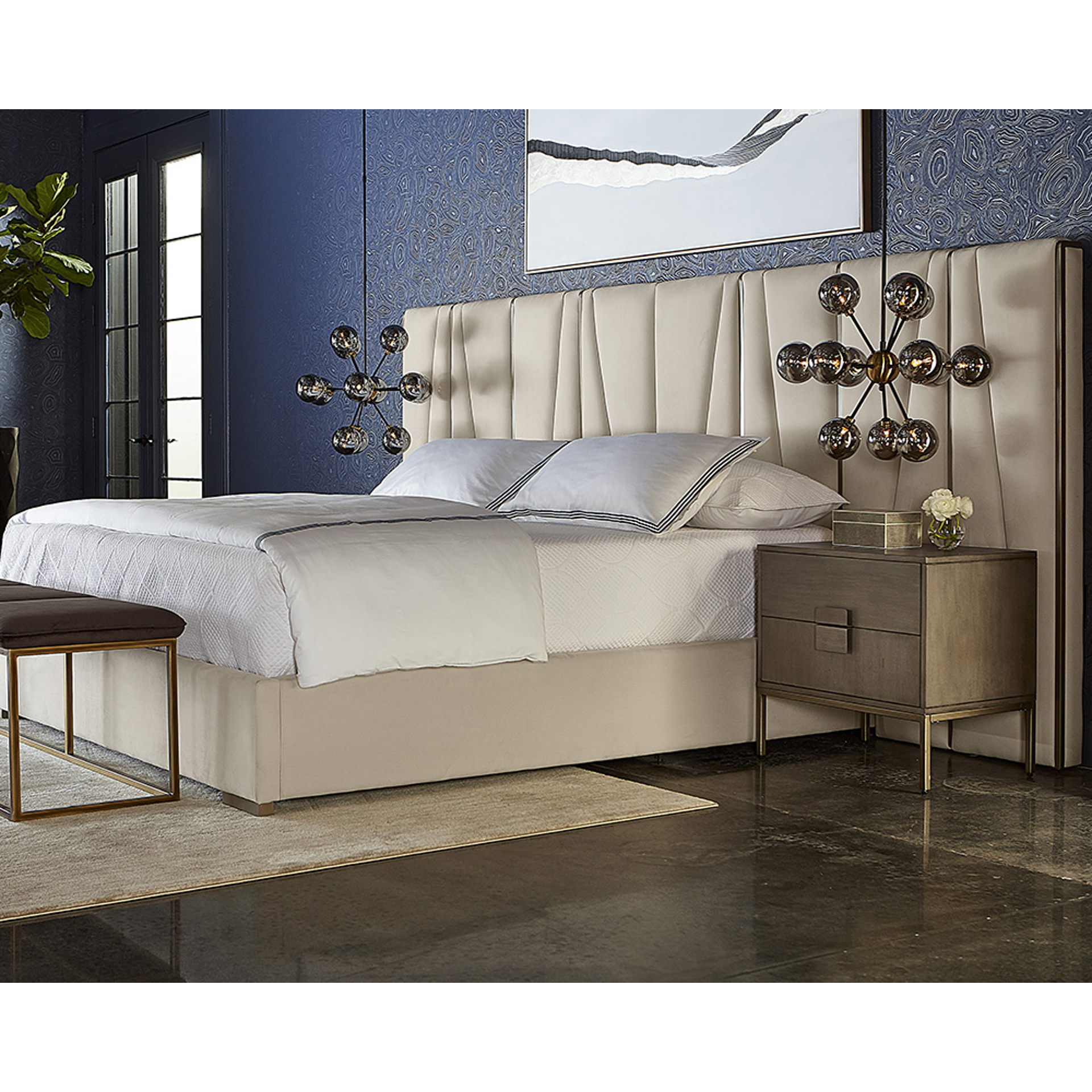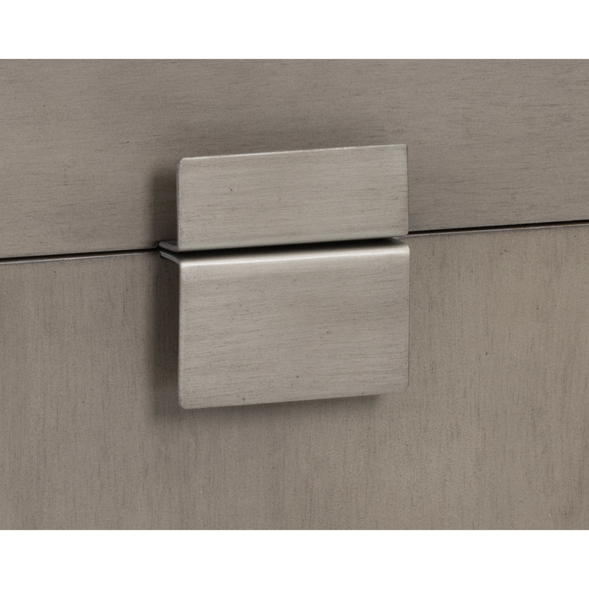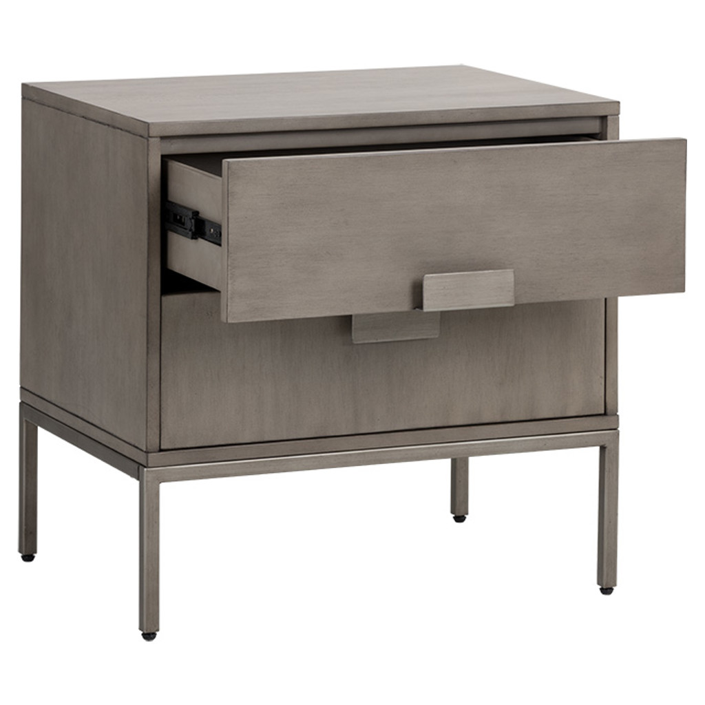 This uniquely crafted nightstand from our MIXT collection will add transitional allure to any bedroom. Made from ash grey acacia wood veneer with two soft closing drawers. Alternating wood grain patterns on the drawer fronts and antique silver hardware complete the look. Suitable for residential and contract settings.