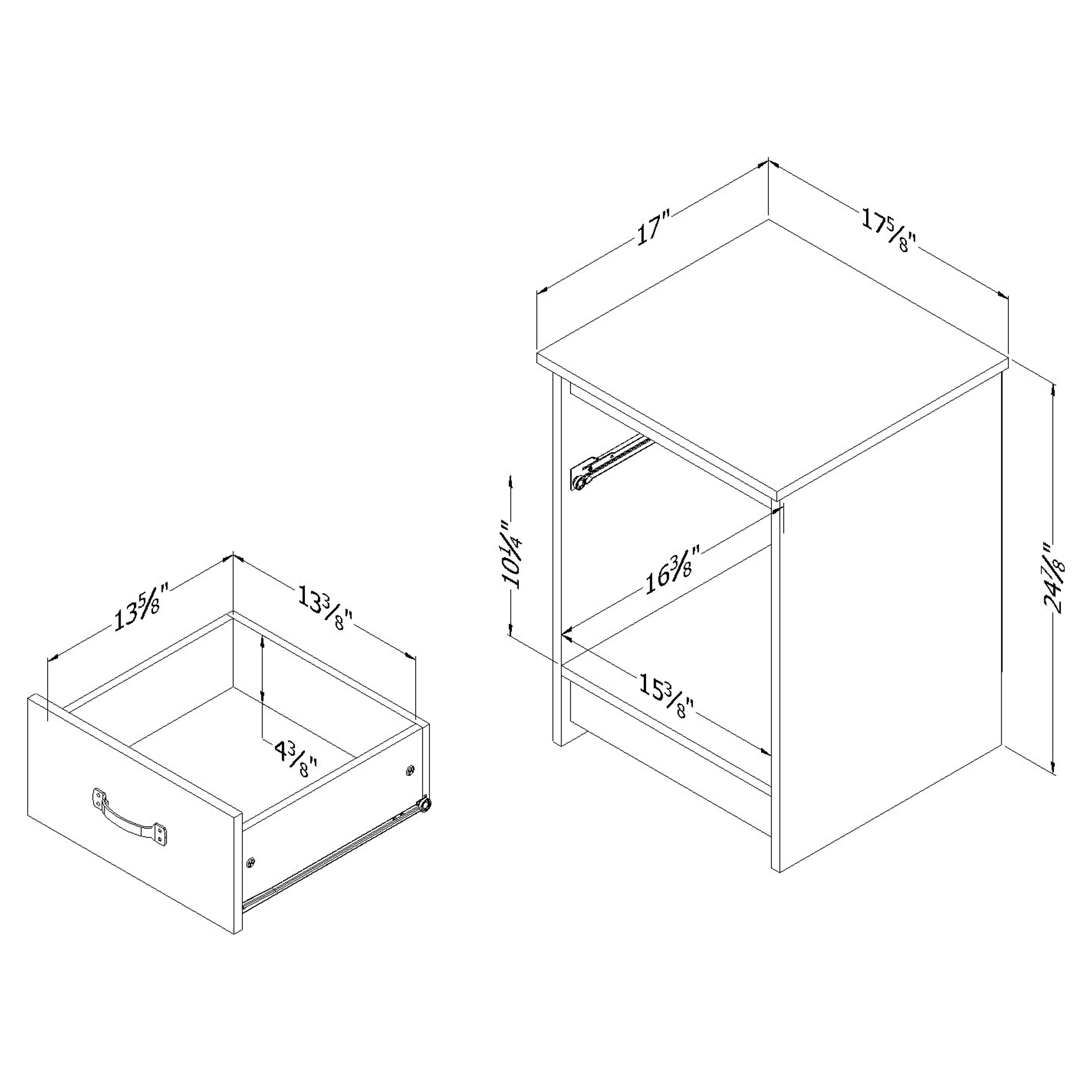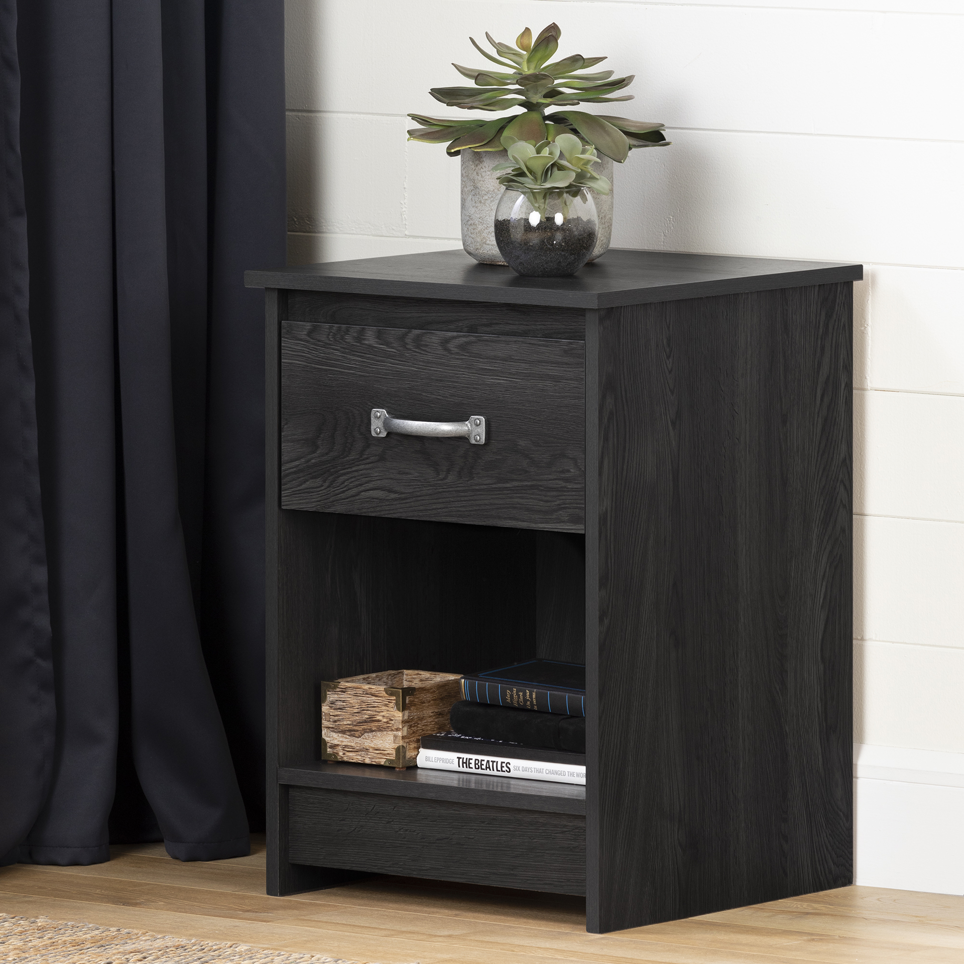 Access all you need close to the bed with the open space of this nightstand. Enjoy easy access to your favourite books and magazines for a relaxing moment in bed. The top drawer I perfect for storing your glasses and electronics. The top itself is large enough to hold a bedside lamp and other decorative items. Recreate the warm and cozy feel of a country cottage with this nightstand adorned with an attractive antique-style metal handle. It will easily fit into a monochromatic or pastel decor. The drawer will never stick as it's mounted on metal runners.