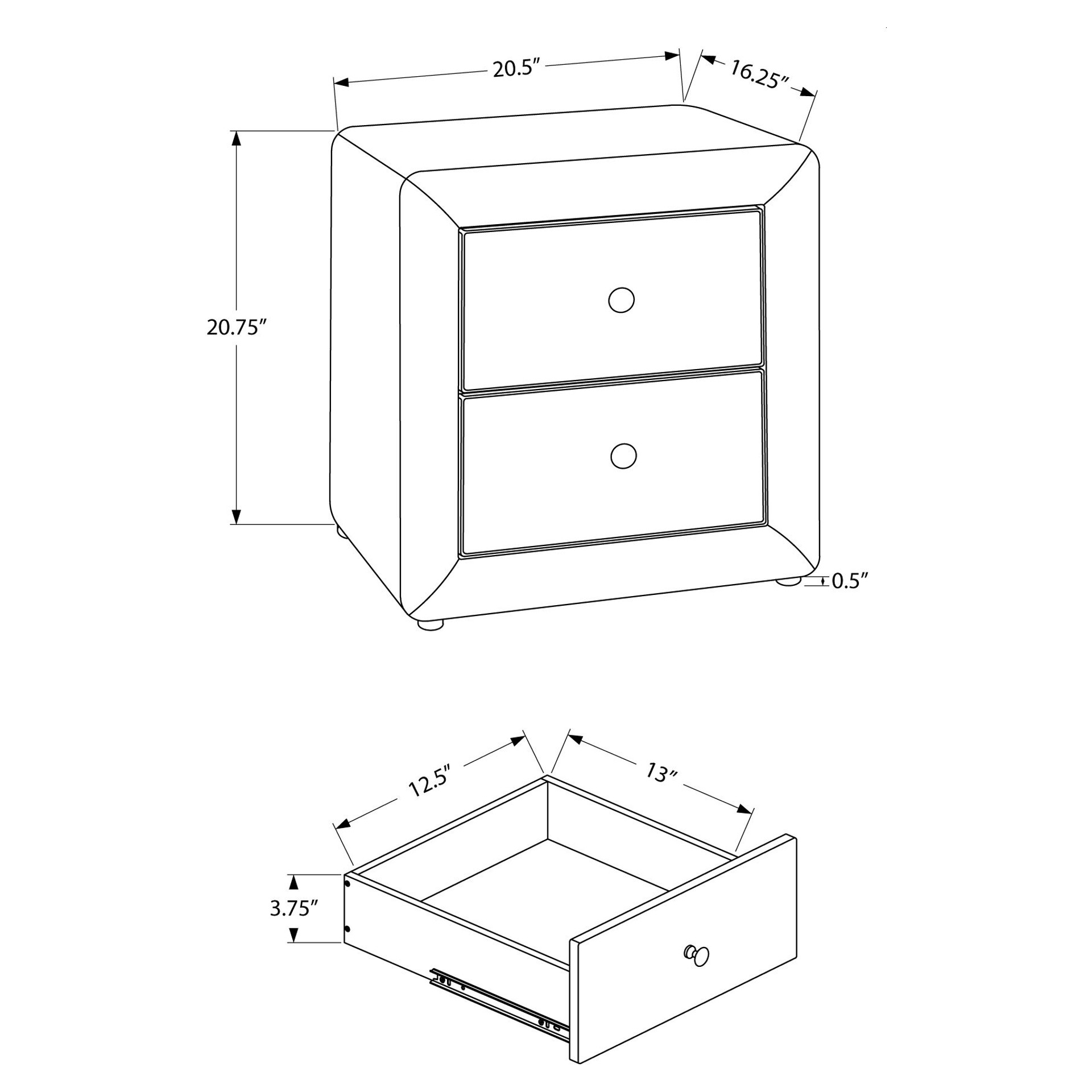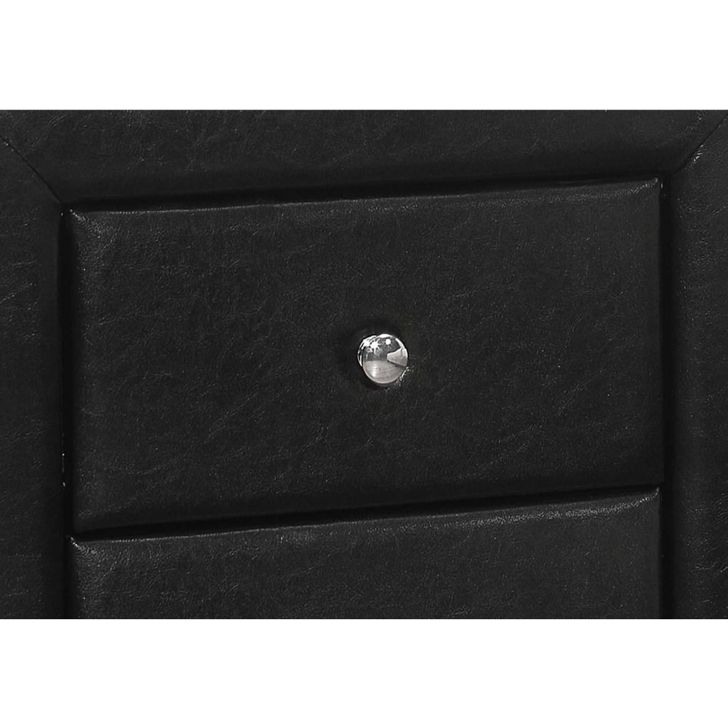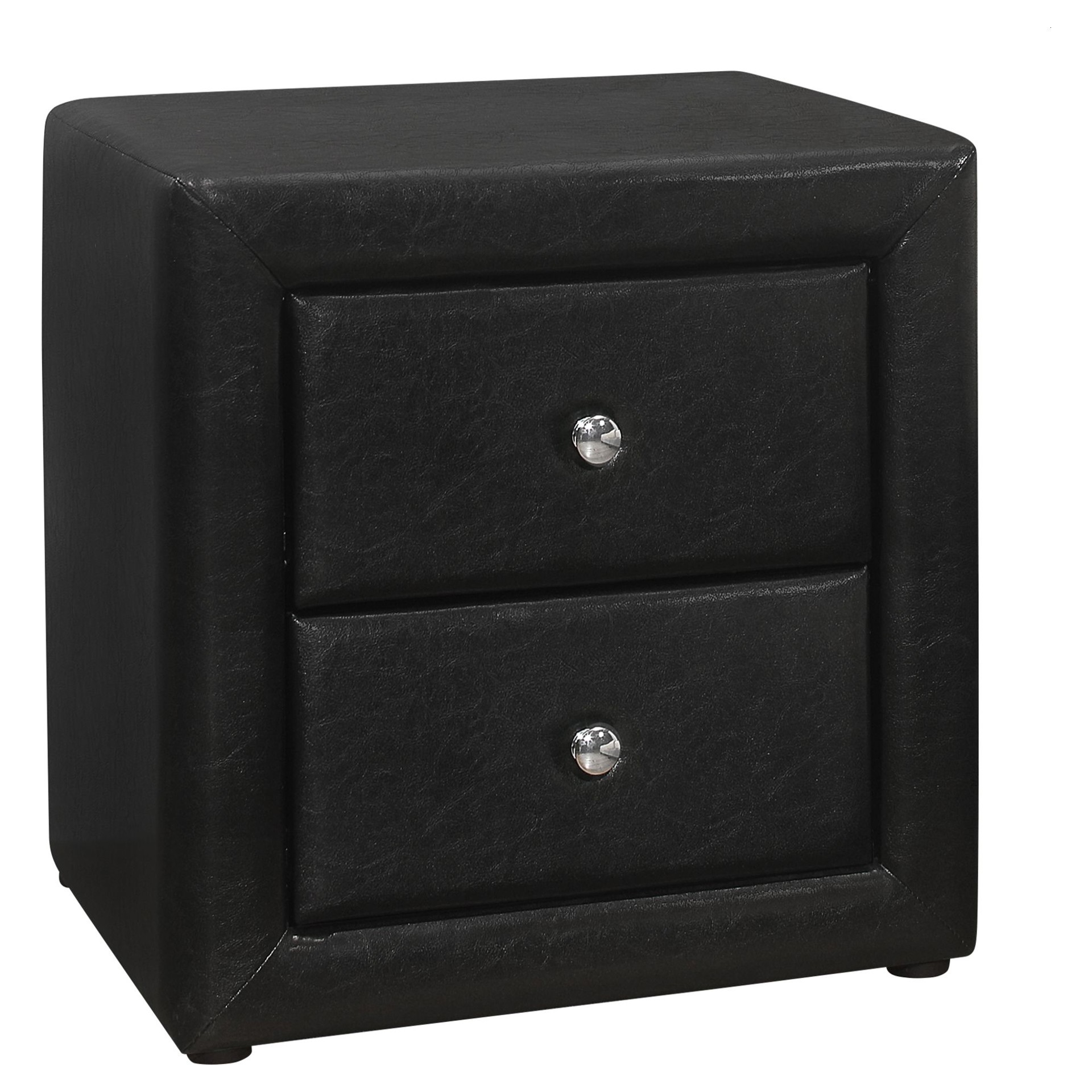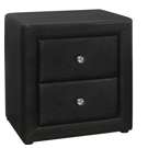 This nightstand features a foam-padded plywood frame, upholstered in black leather-look fabric.