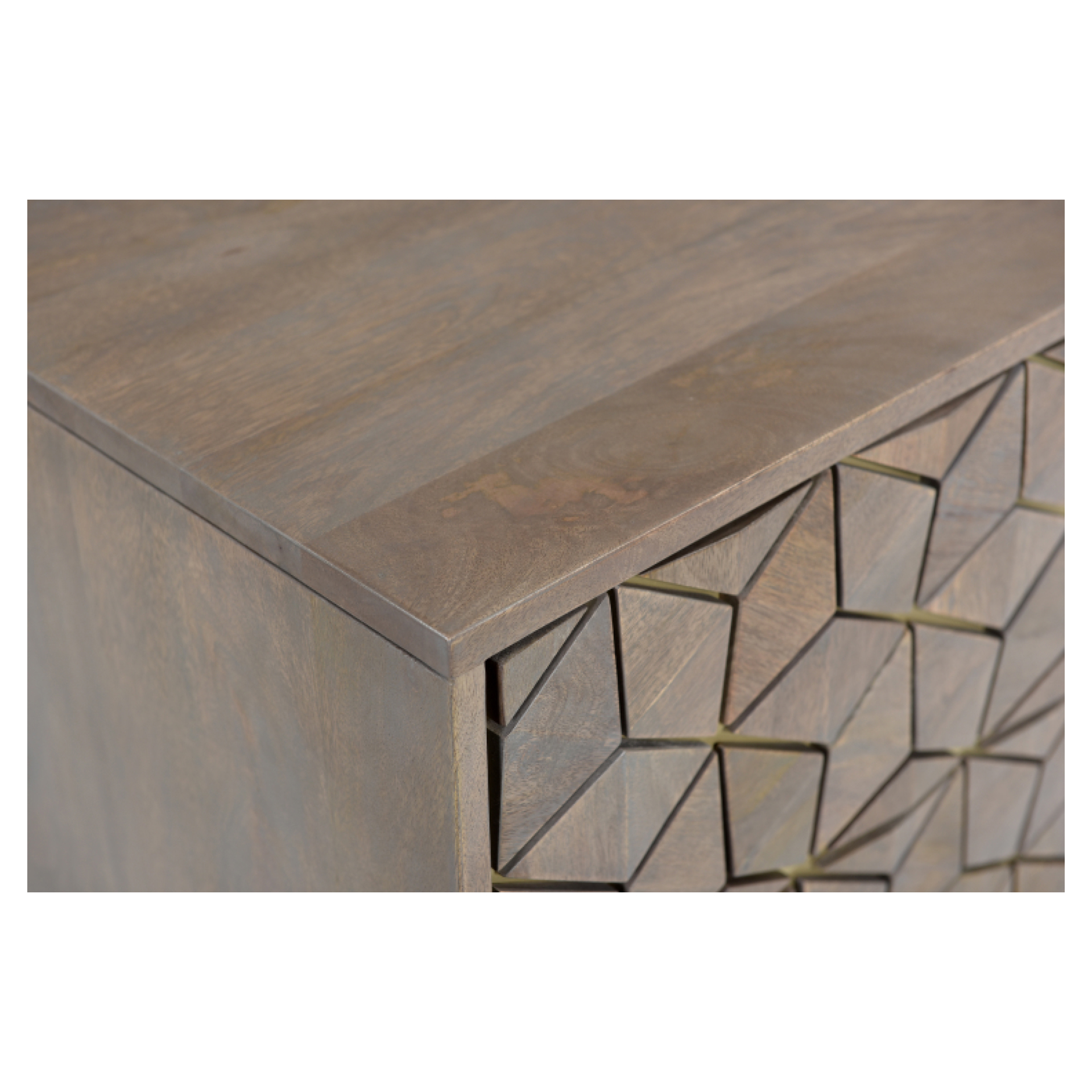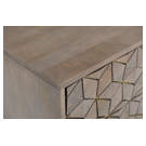The Corolla drawer chest is an art deco-inspired with a modern twist. Constructed with solid mango wood, this piece makes it resistant to major wear and tear. Its warm tone and intricate drawer fronts and brass detailing provides character and practicality into your bedroom space. Its ethically sourced wood material adds a unique touch of quality to the bedroom.