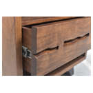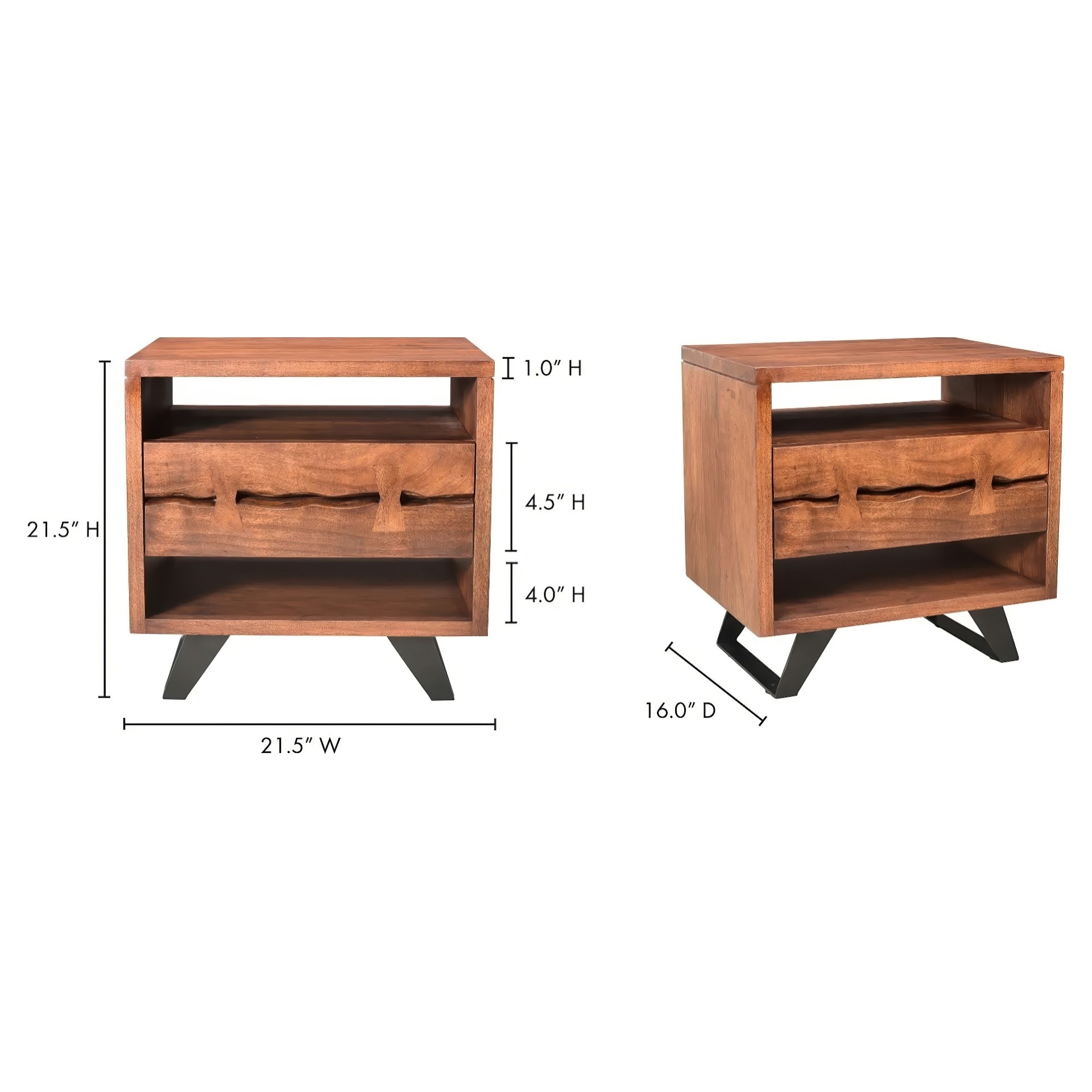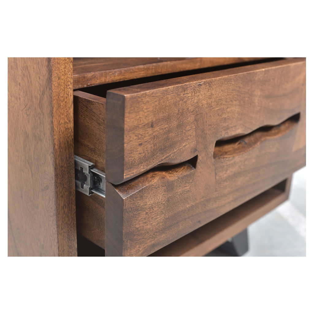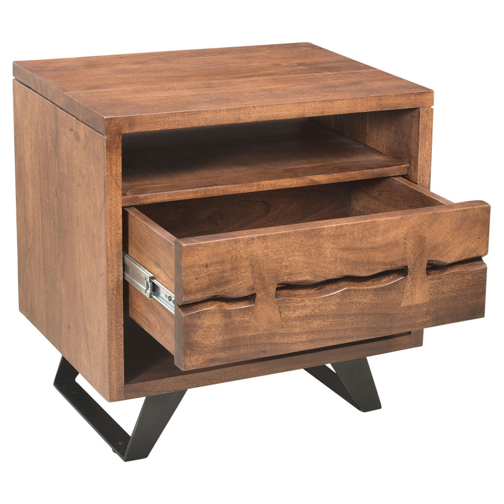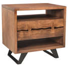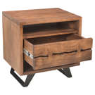 The Madagascar Nightstand is constructed with solid acacia wood on an angular, steel legs to achieve that rustic, industrial look.
