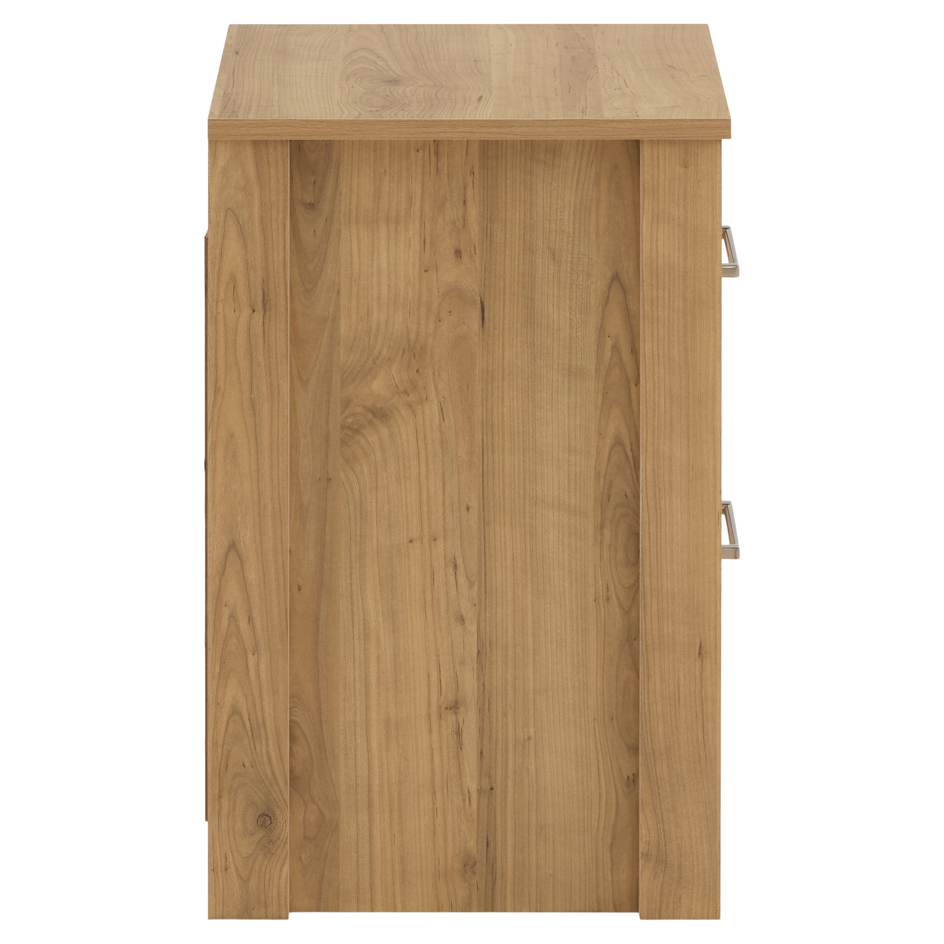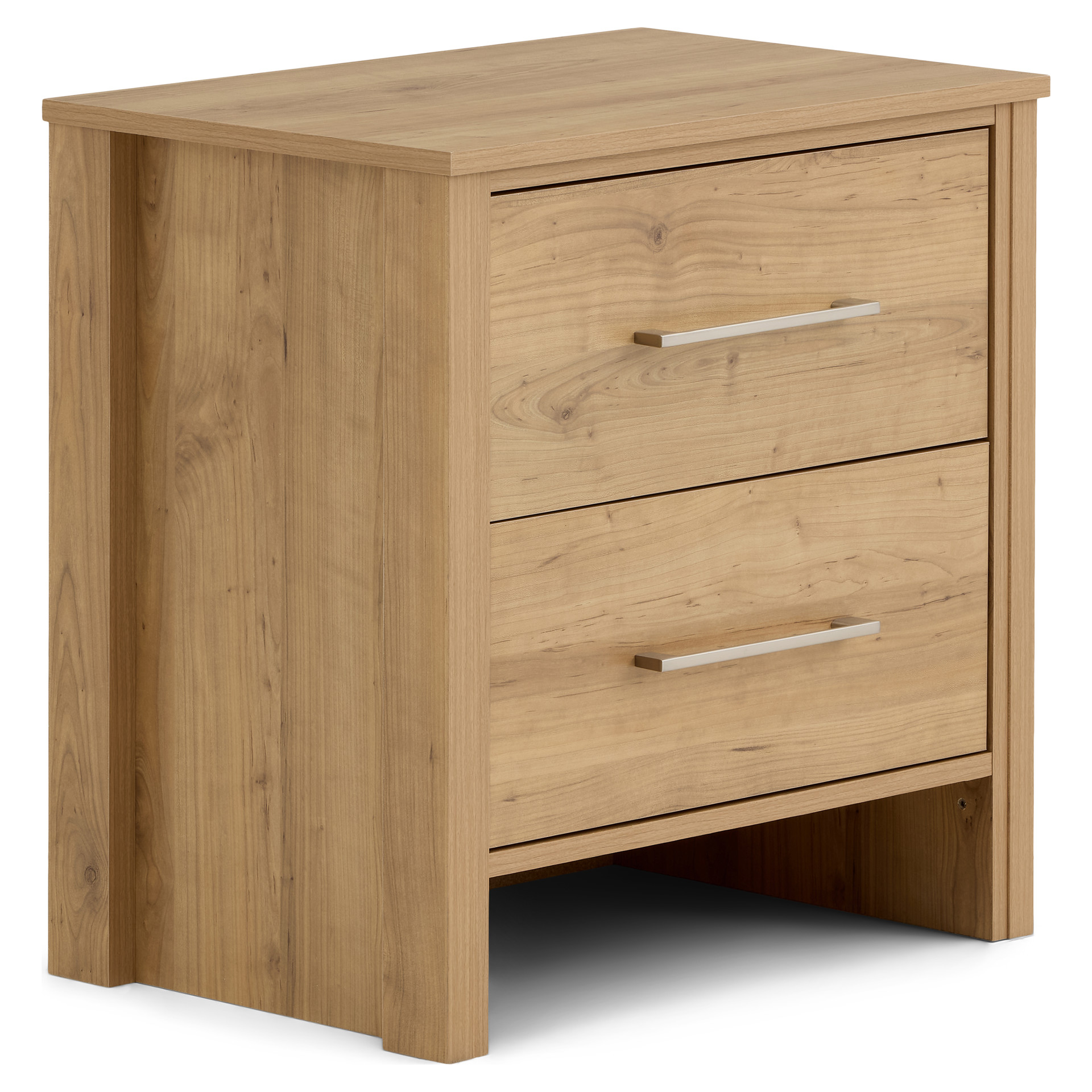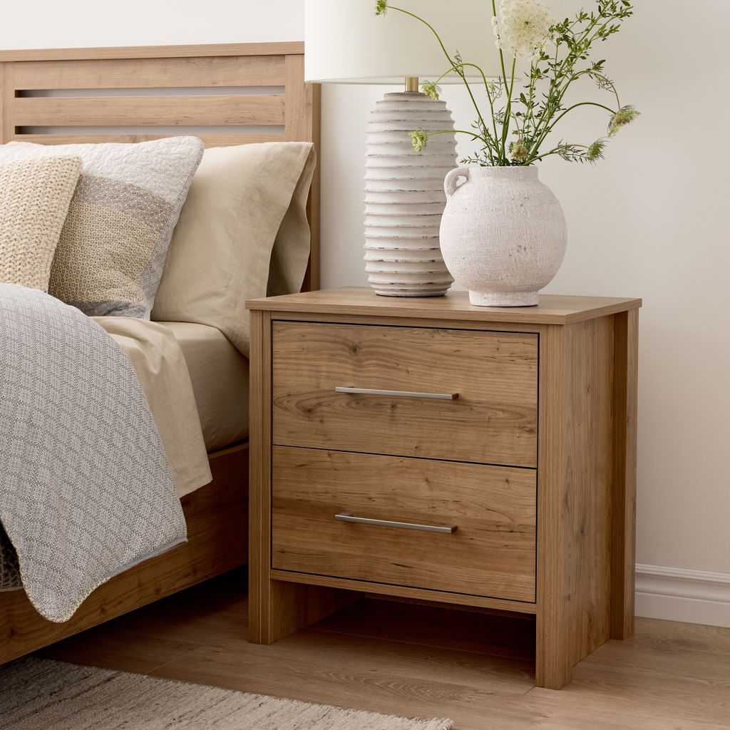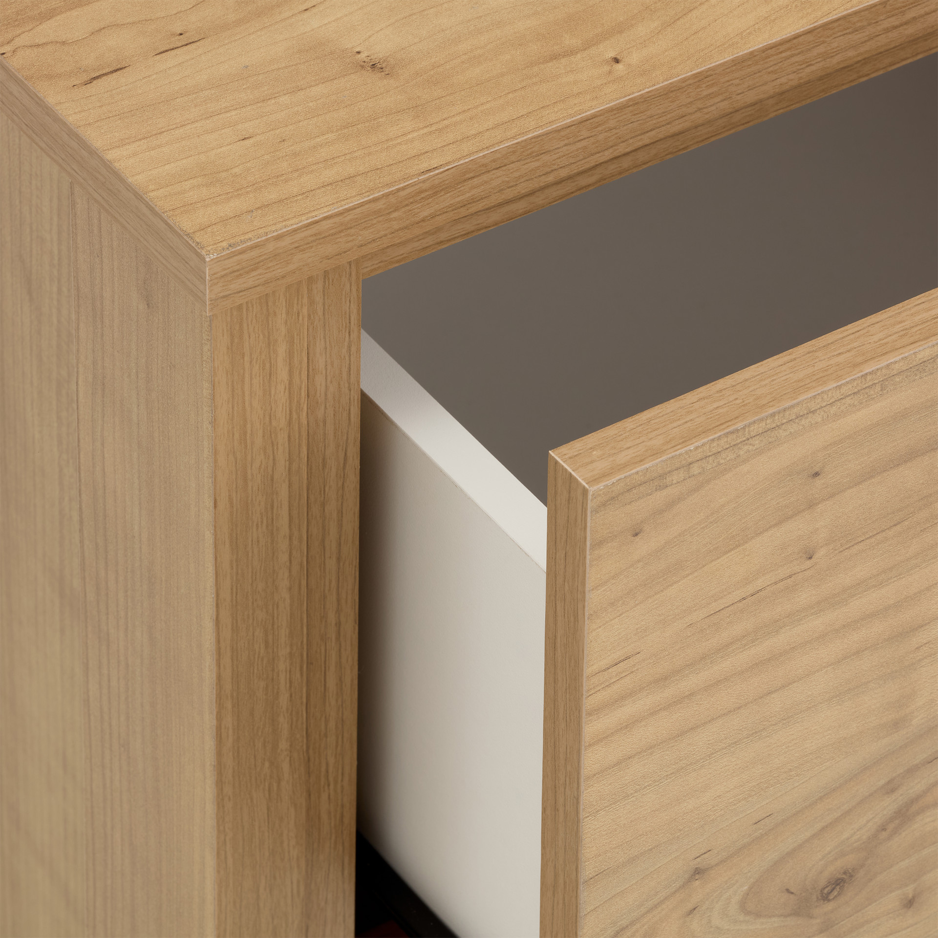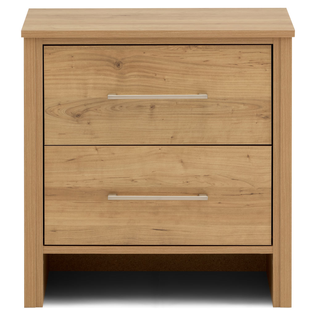 This nightstand combines functionality and elegance with its two spacious drawers designed to hold all your essentials. Its warm wood-look finish blends naturally with your décor, creating a soothing atmosphere in your bedroom.