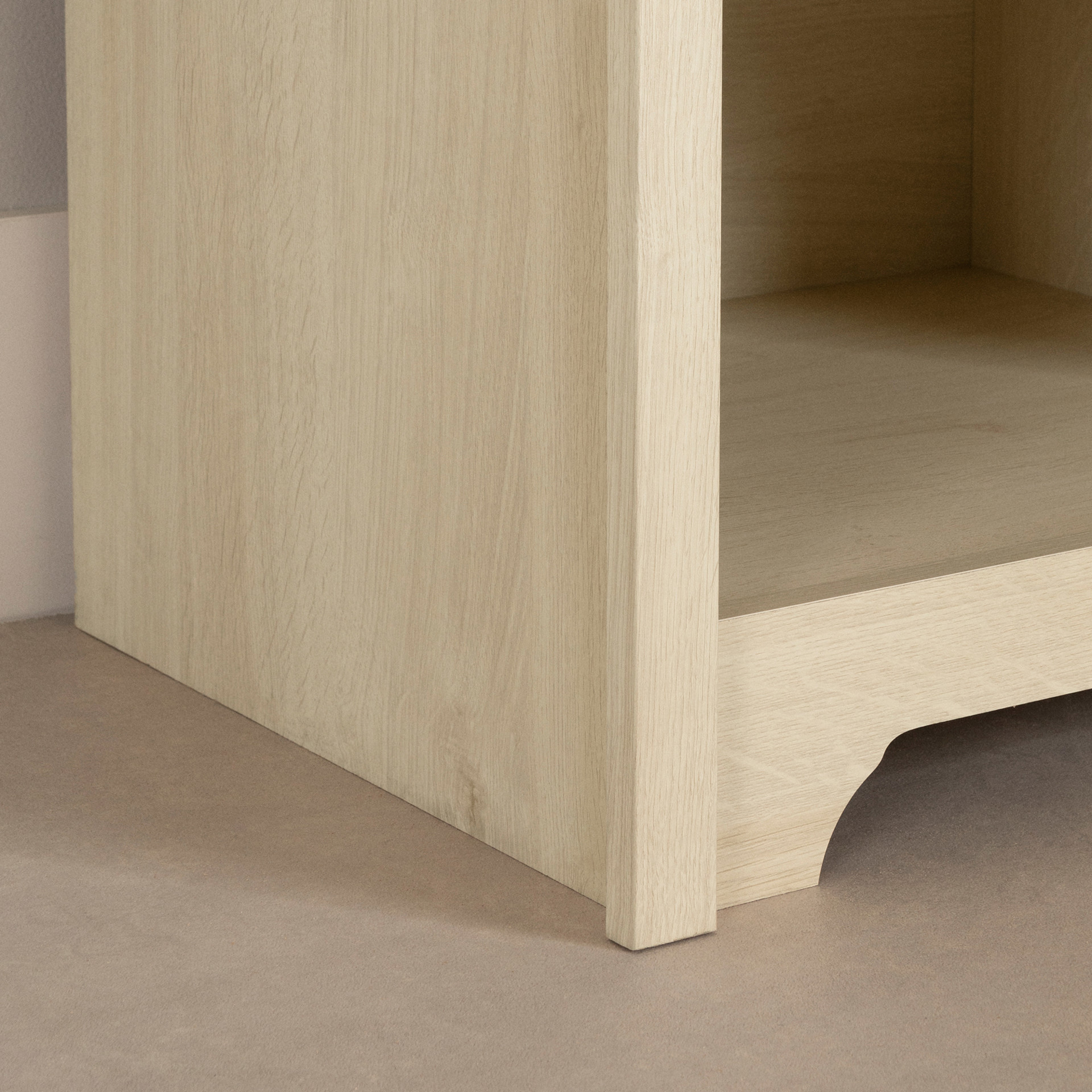 This nightstand with a cutout kickplate will give your bedroom a contemporary and distinguished look. In order to maximize bedside storage it features an open storage space and a drawer decorated with an elegant metal handle. With a sturdy table top suitable for a lamp, cell phone and books, the bedroom cabinet meets all your storage needs.