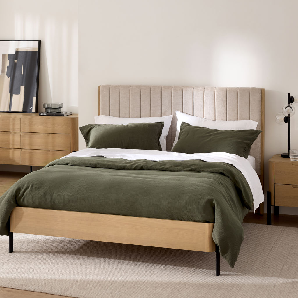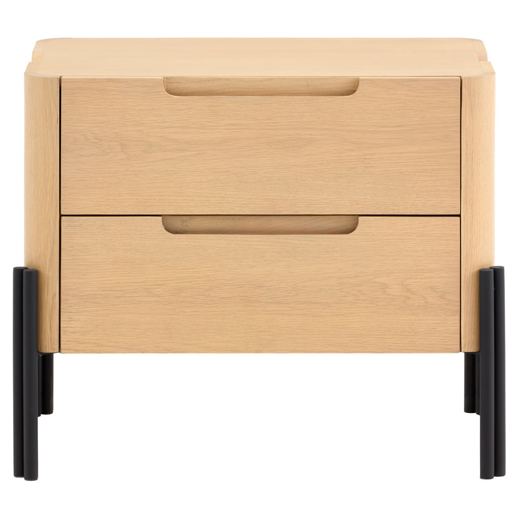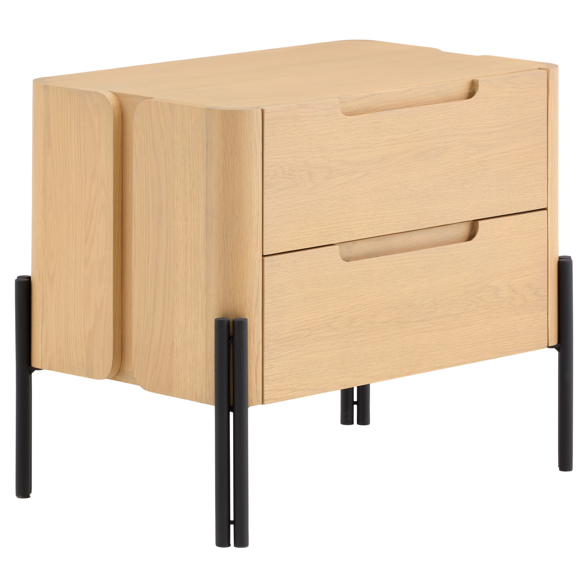 The Nori bedroom collection is beautifully styled in black-stained white oak. It's the perfect marriage of simplicity and style. All Nori pieces, including the beds, have black powder-coated steel legs that extend over the wood, giving it a modern, chic look. The complete collection includes a nightstand, a bed and a dresser.