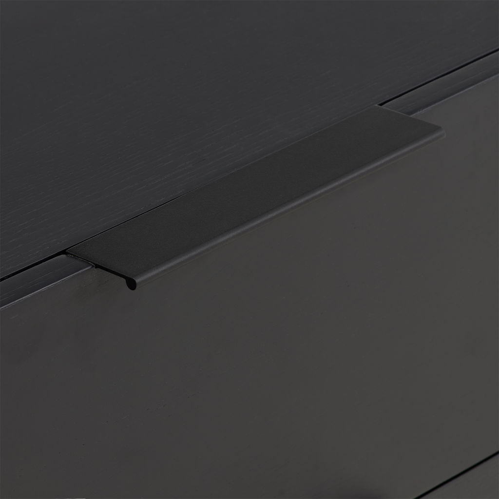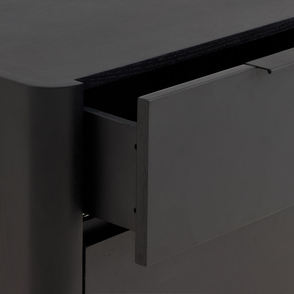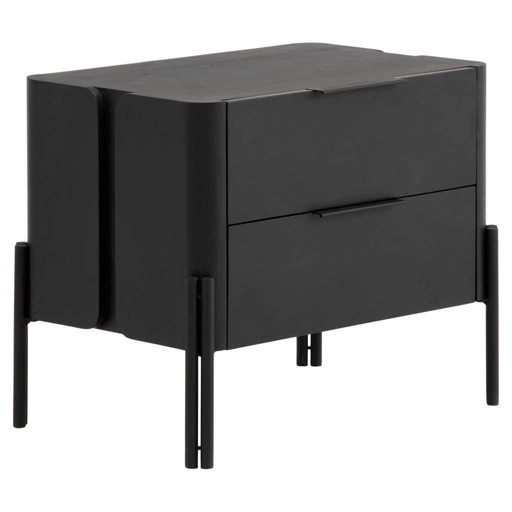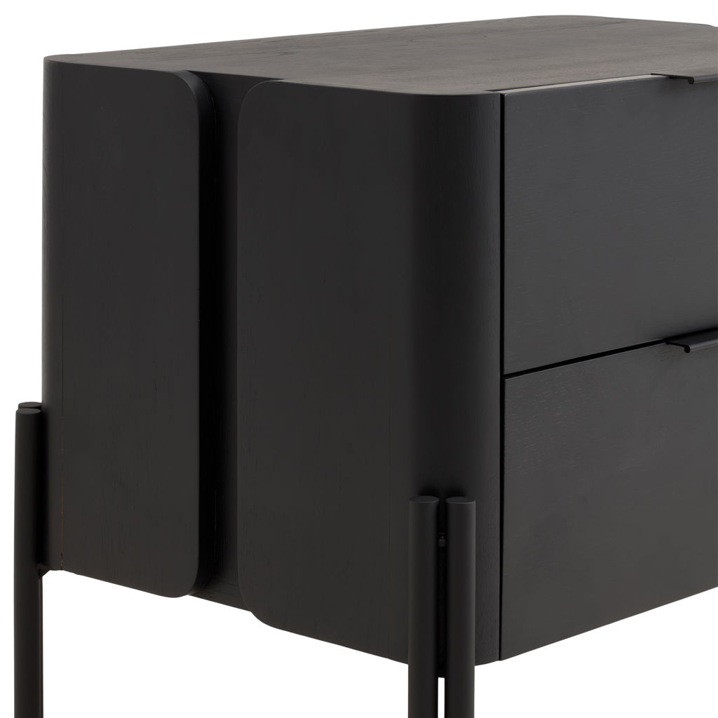 The Nori bedroom collection is styled in black-stained white oak. It's the perfect marriage of simplicity and style. All Nori pieces, including the beds, have black powder-coated steel legs that extend over the wood, giving it a modern, chic look. The complete collection includes a nightstand, bed and chest of drawers.