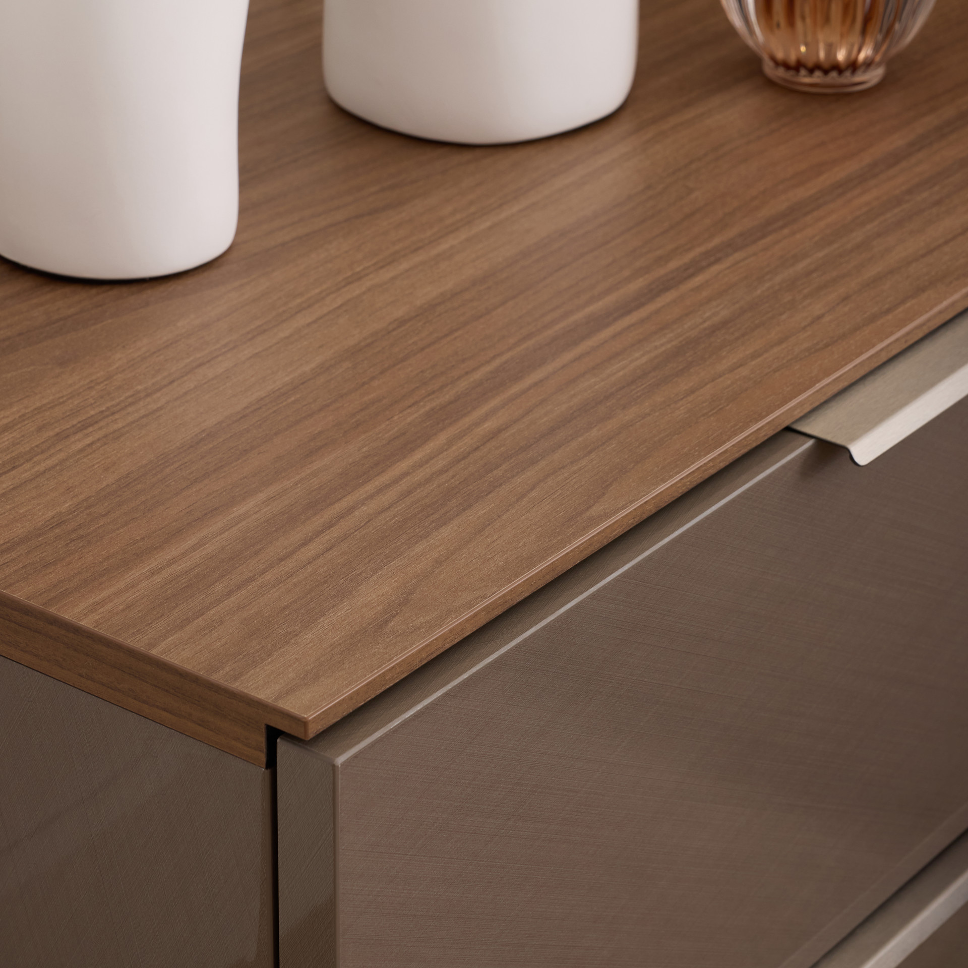 Designed and crafted in Italy from high-quality laminate, the dresser is sublimated by subtle accents of walnut-colored natural wood and brushed metal that add warmth and character to the ensemble.