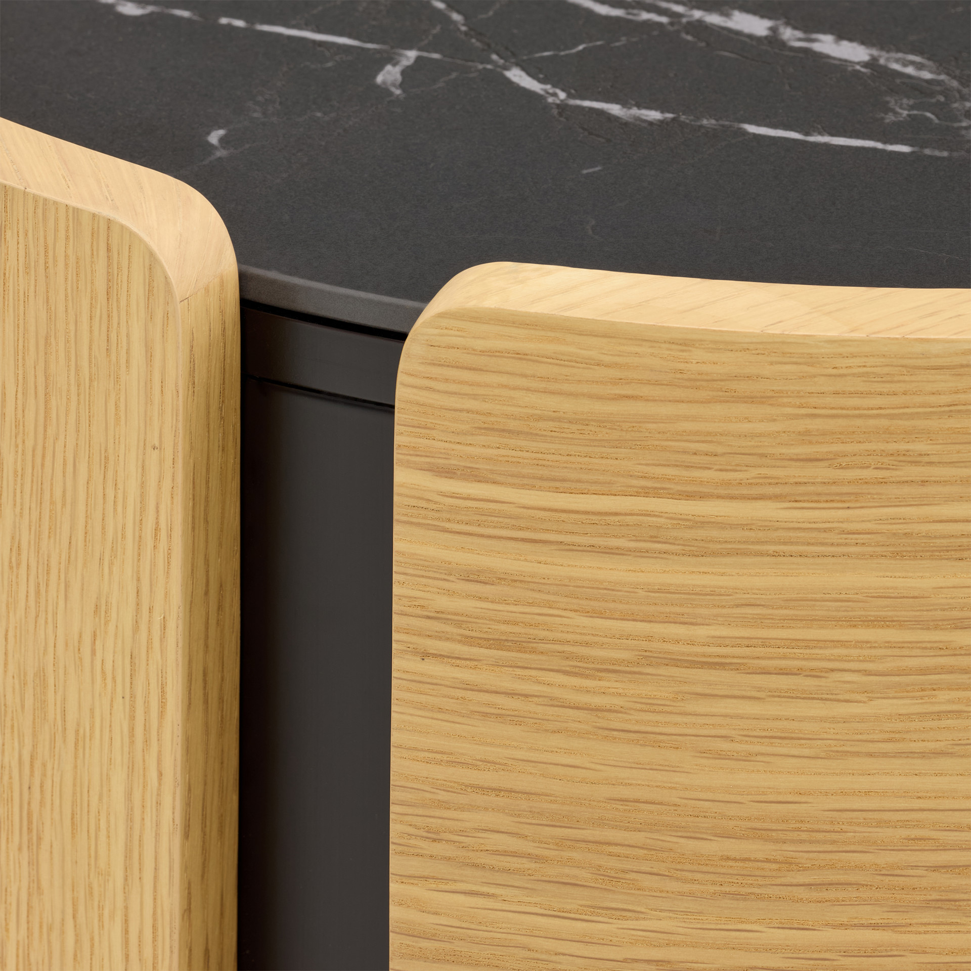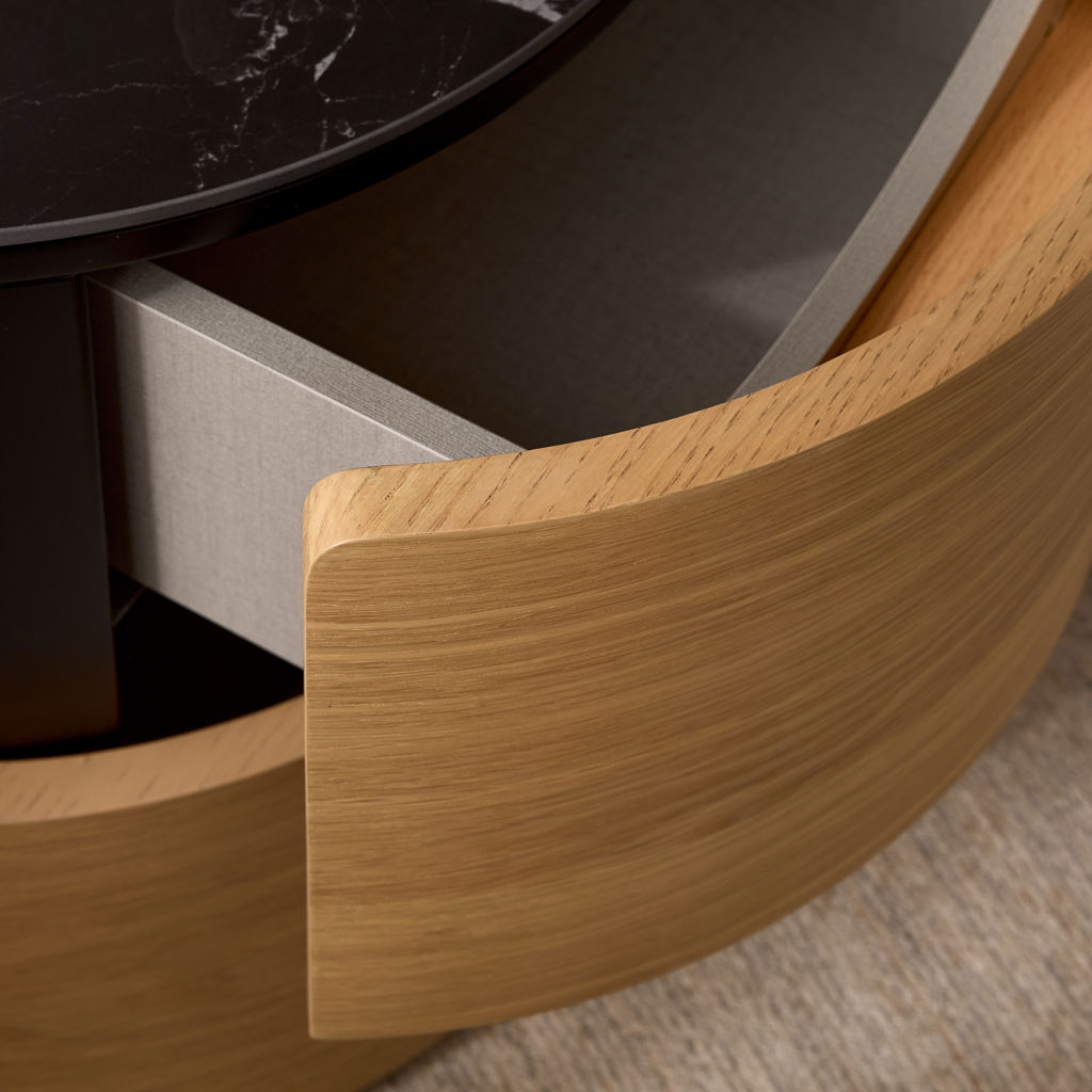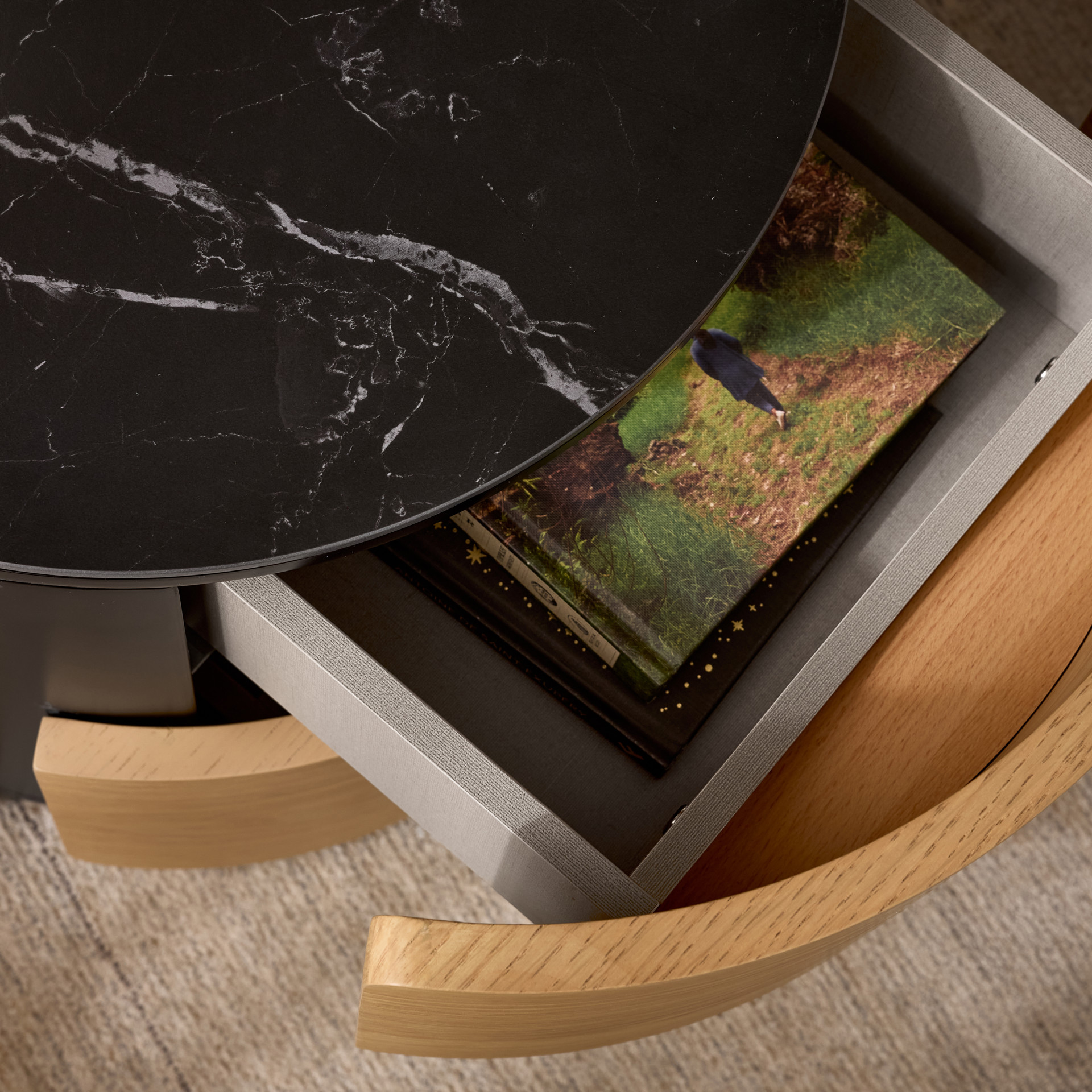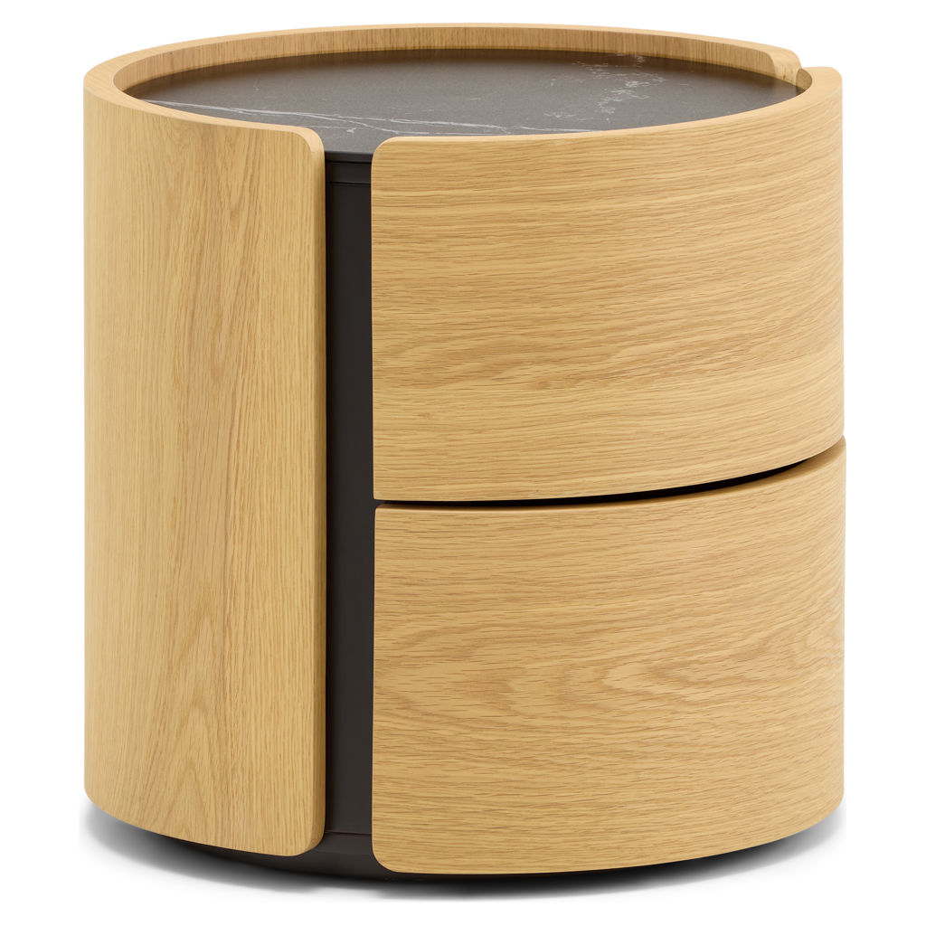 Its rounded light oak wood design creates a soft and soothing atmosphere, while the sintered stone top in a black marble finish stylishly holds your lamps, frames, or decorative objects. With this nightstand, every detail of your bedroom exudes order, harmony, and a touch of modernity.
