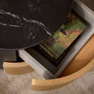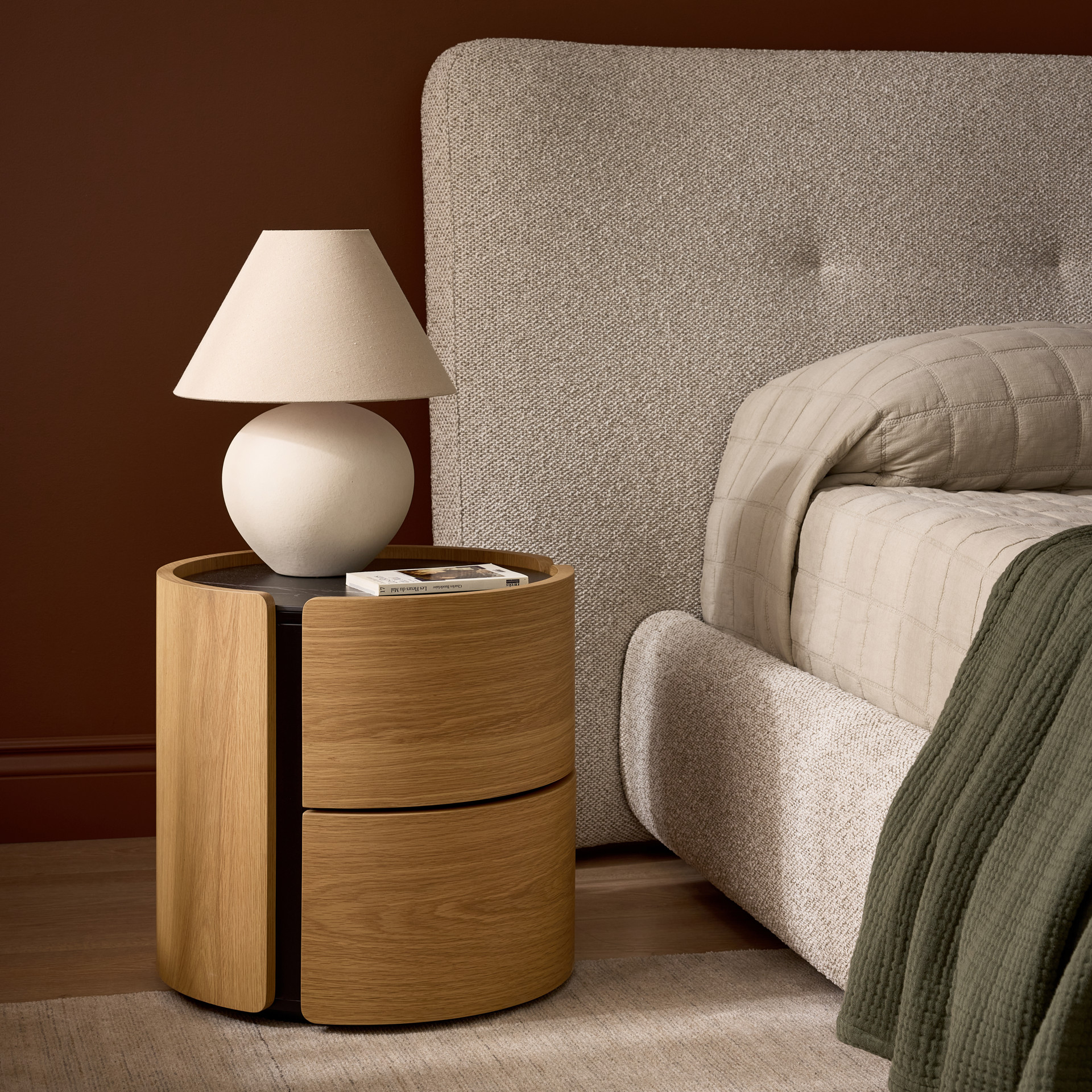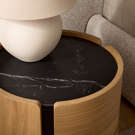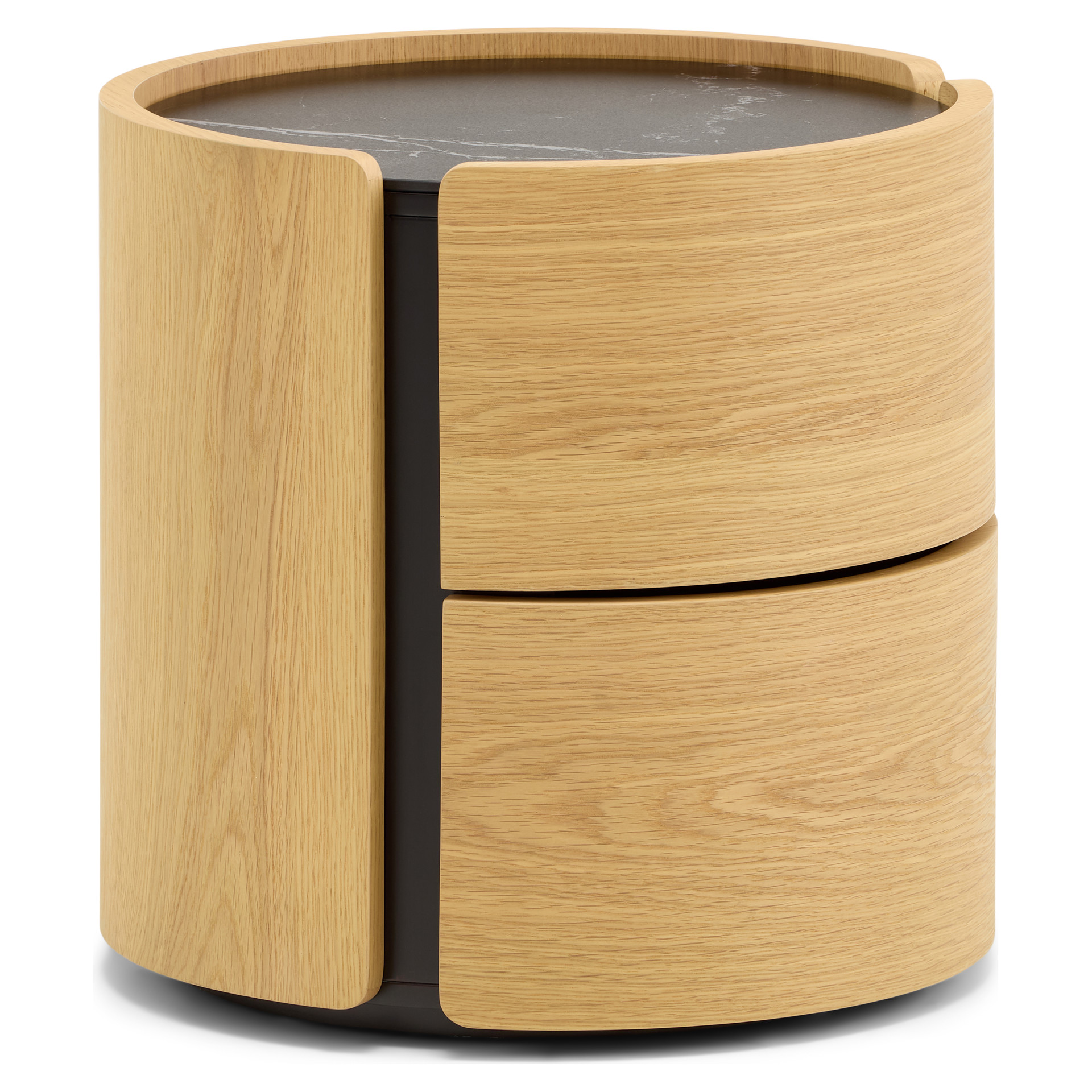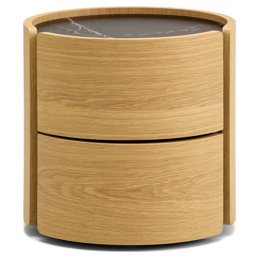 Its rounded light oak wood design creates a soft and soothing atmosphere, while the sintered stone top in a black marble finish stylishly holds your lamps, frames, or decorative objects. With this nightstand, every detail of your bedroom exudes order, harmony, and a touch of modernity.