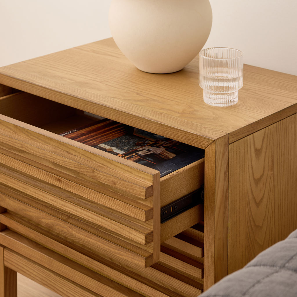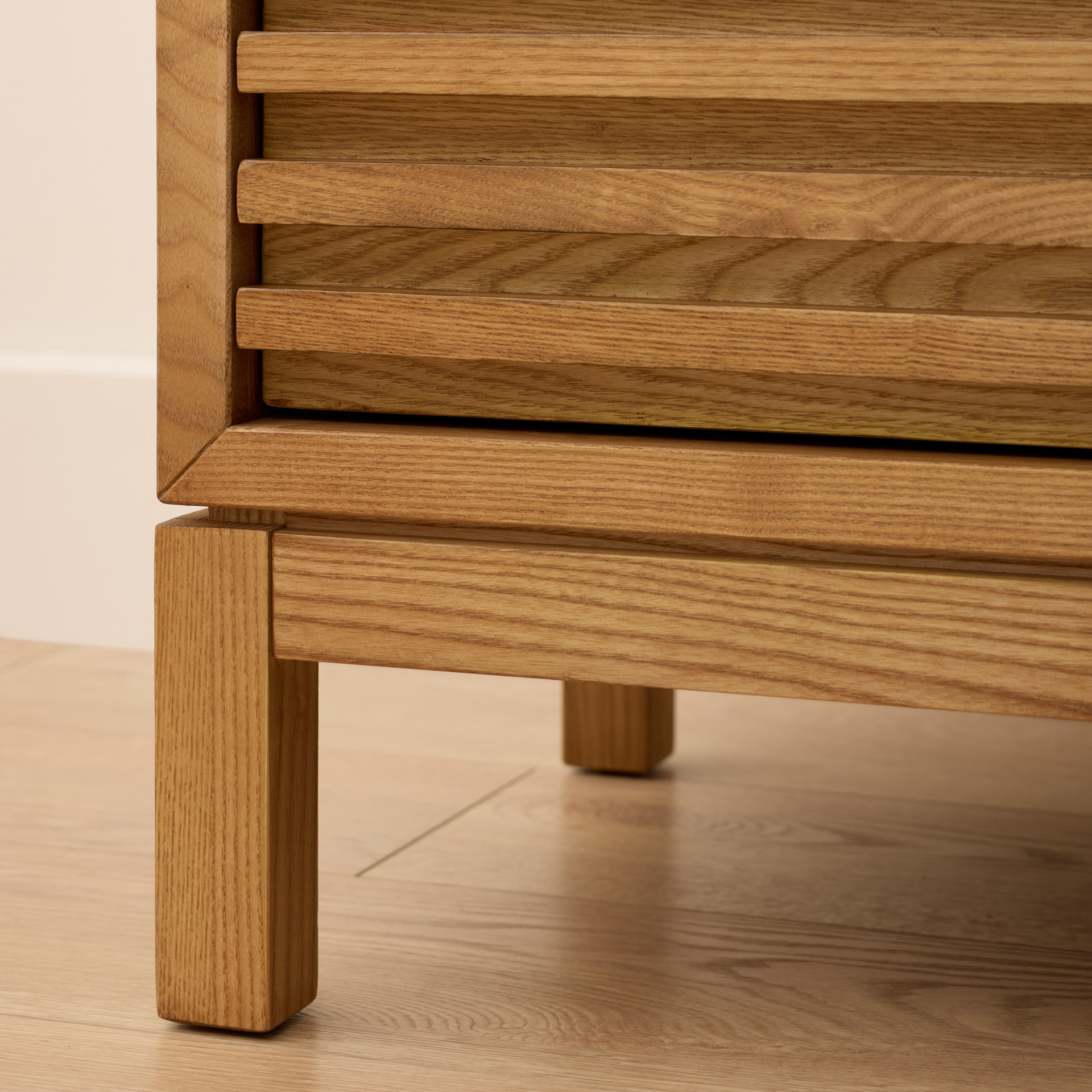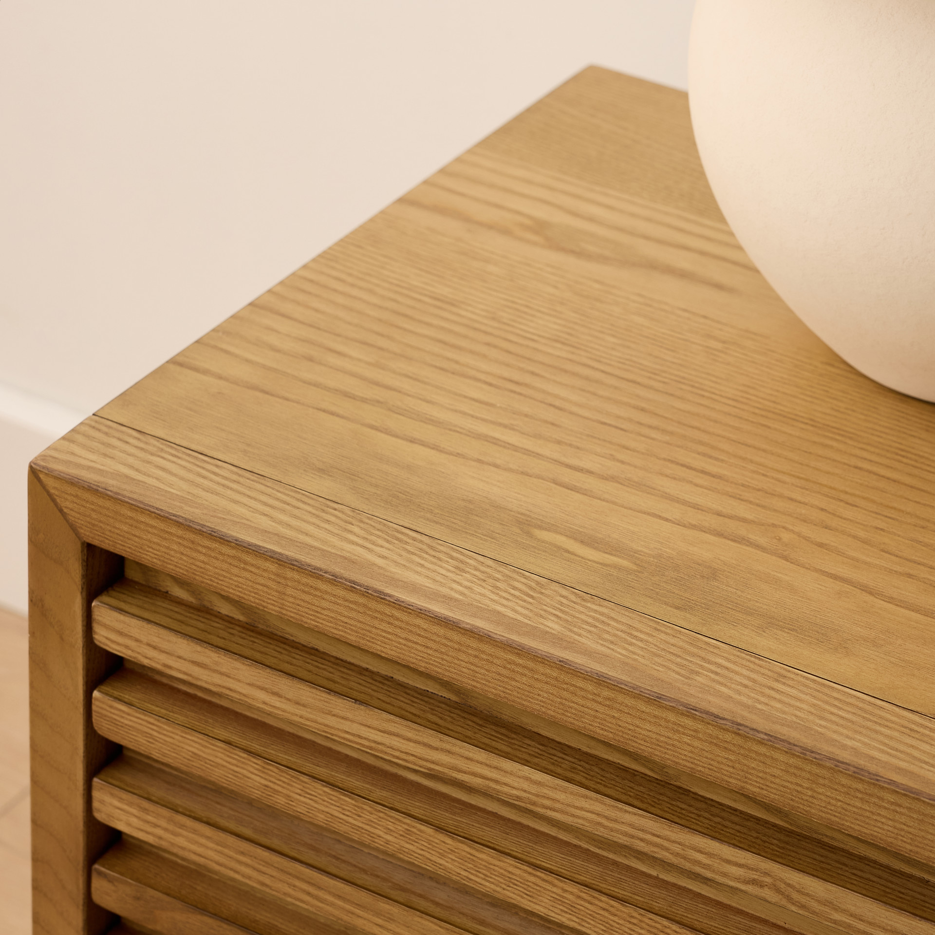 • Slatted fronts are made entirely of solid Ash with Ash wood veneer panel surfaces