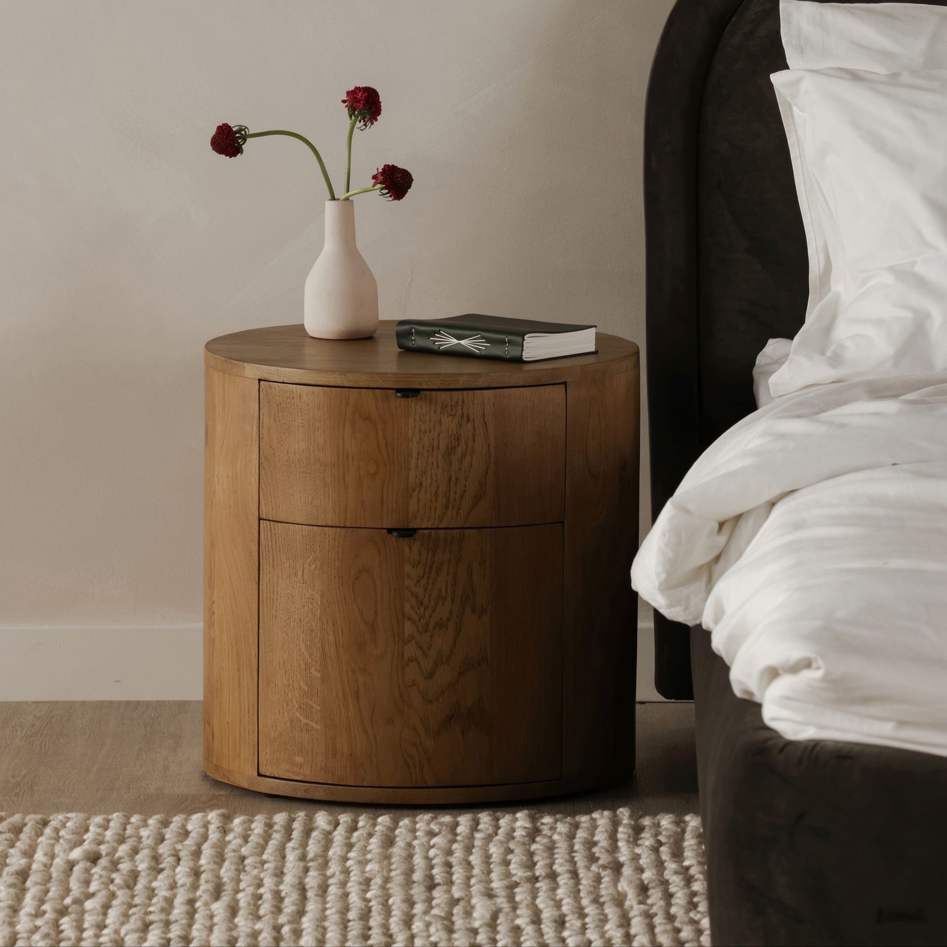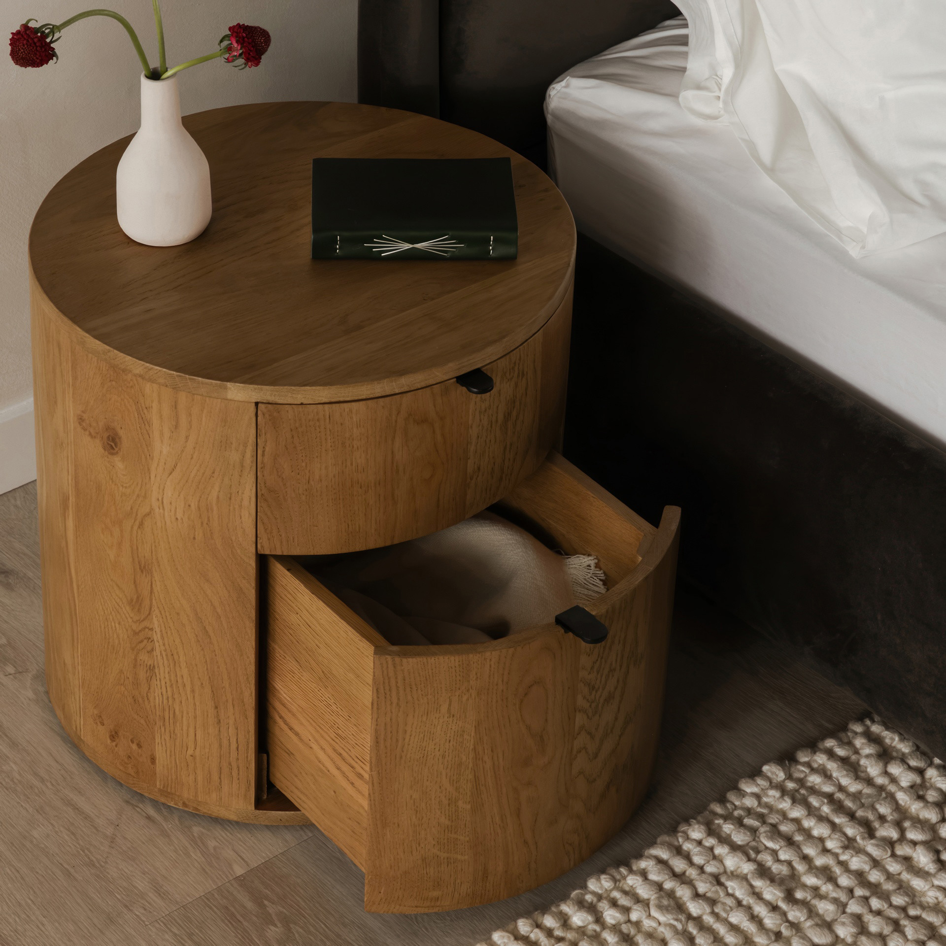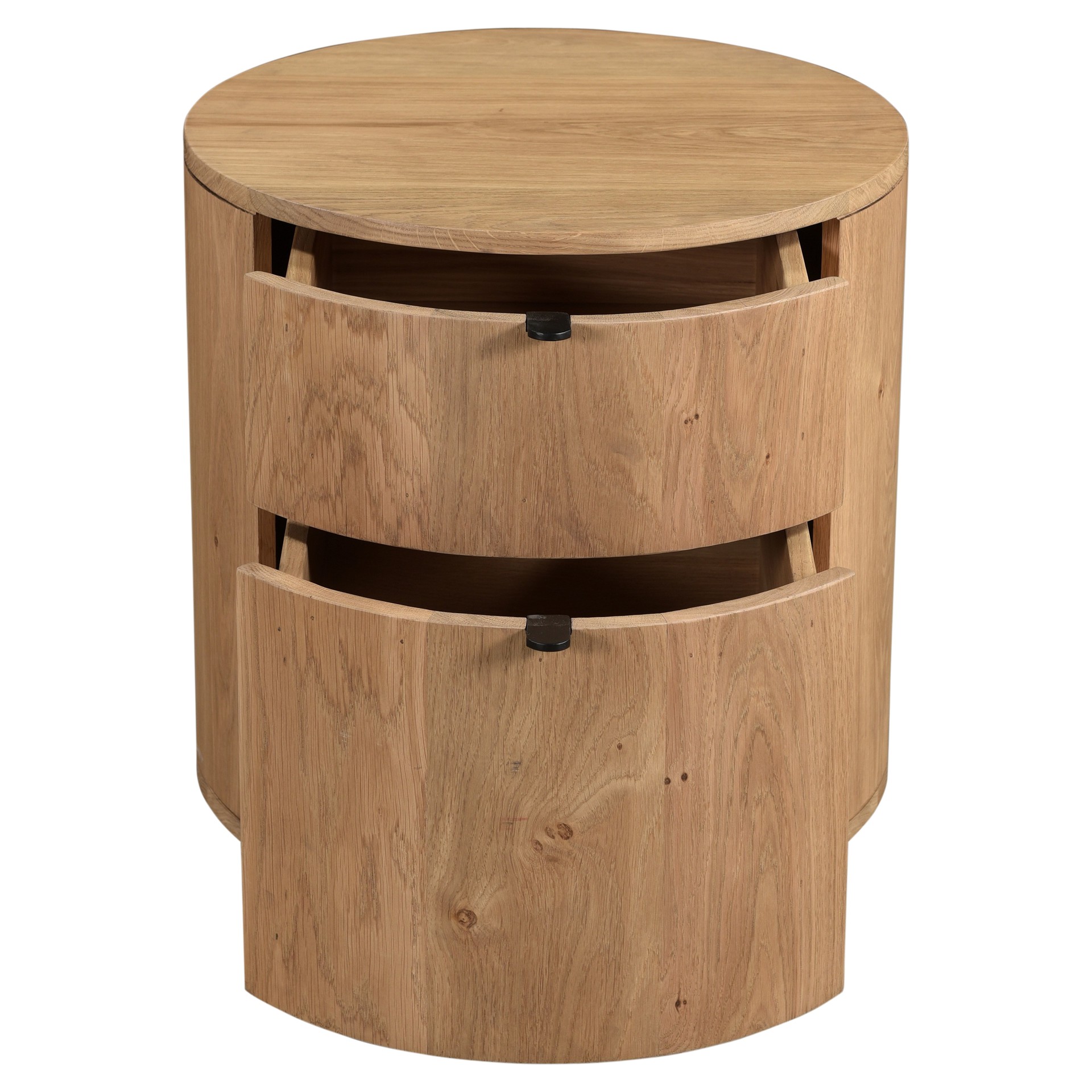 Full of natural appeal in solid oak, the Theo two drawer nightstand features a curved, minimalist design.