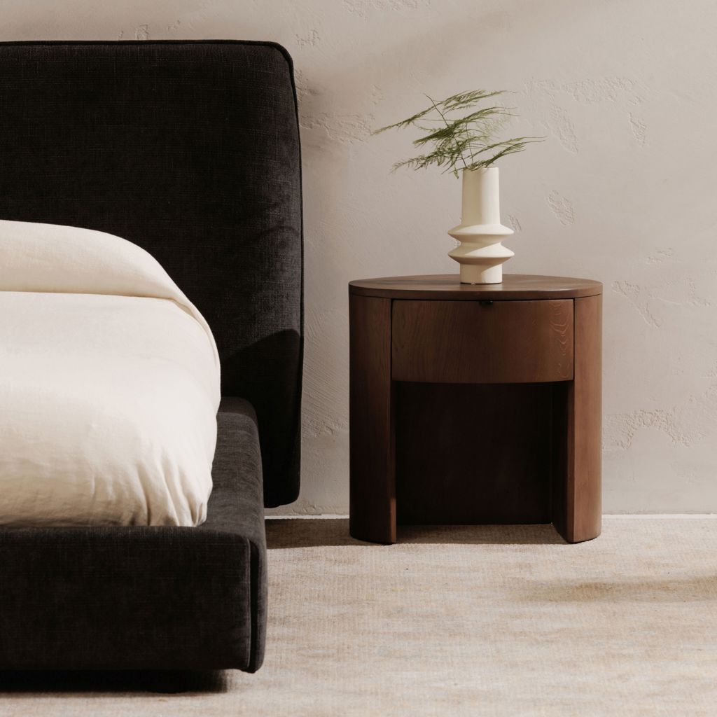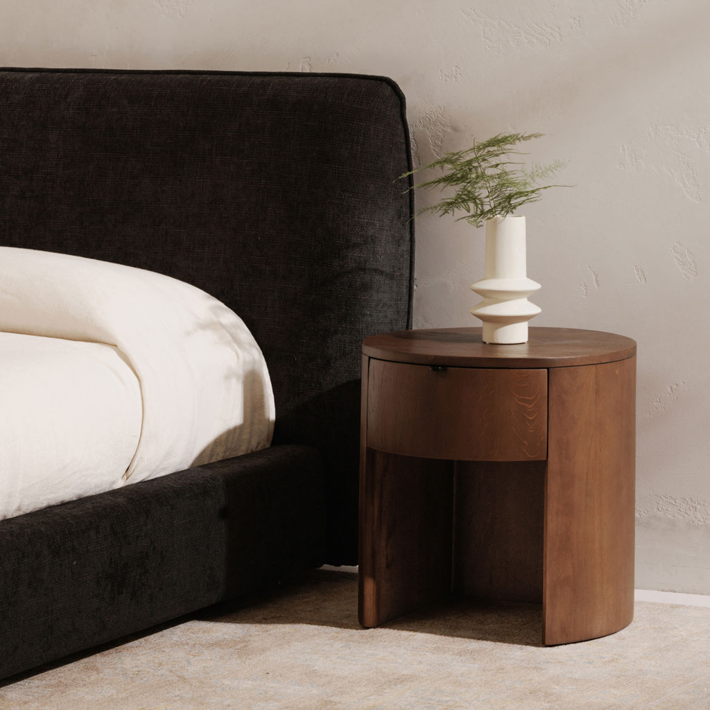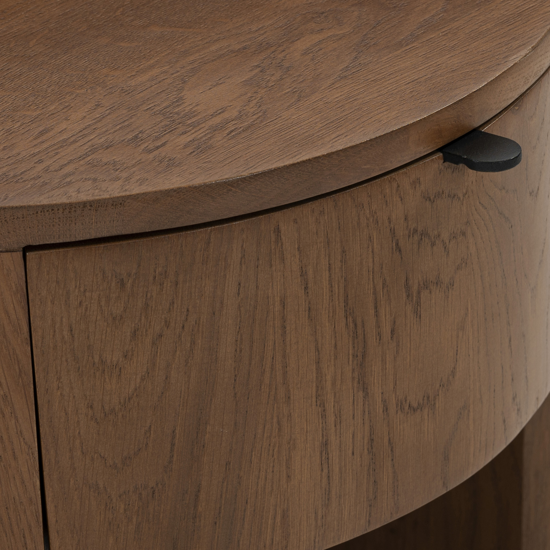 Full of natural appeal in solid oak, the Theo one drawer nightstand features a curved, minimalist design.