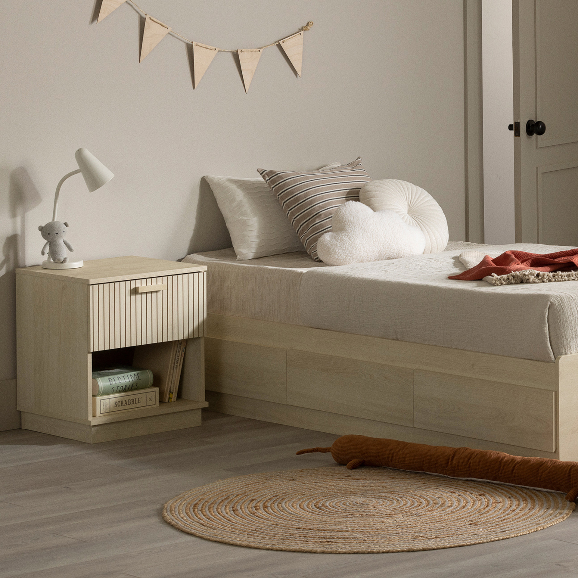 Placed next to the bed, this nightstand adds everyday functionality to the room. Along with a spacious top surface, ideal for a lamp or decorative items that reflect your child’s interests, it features a drawer on metal slides and an open storage compartment. Use the extra storage for bedtime essentials: a nightlight, books, glasses, and toys will all have their place.