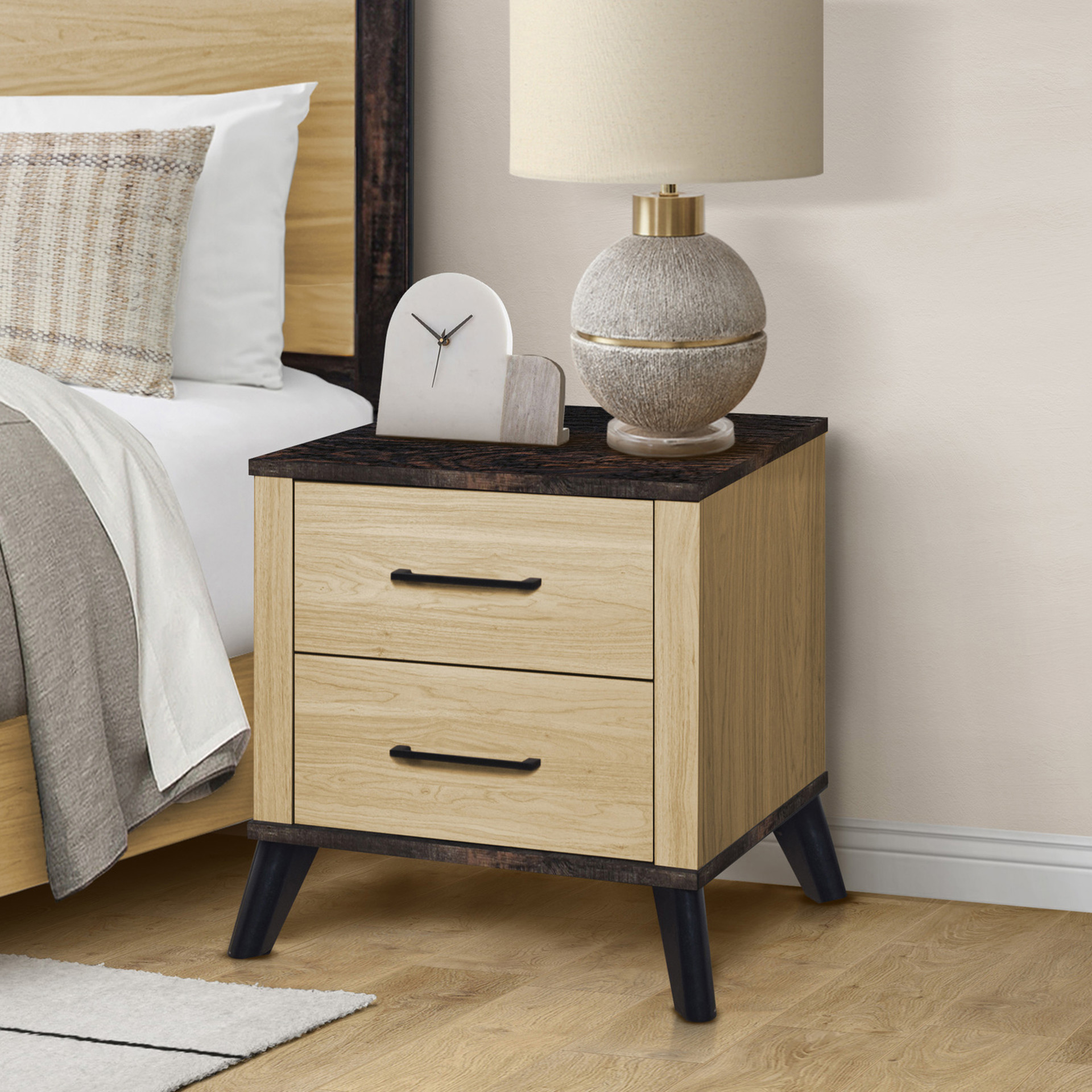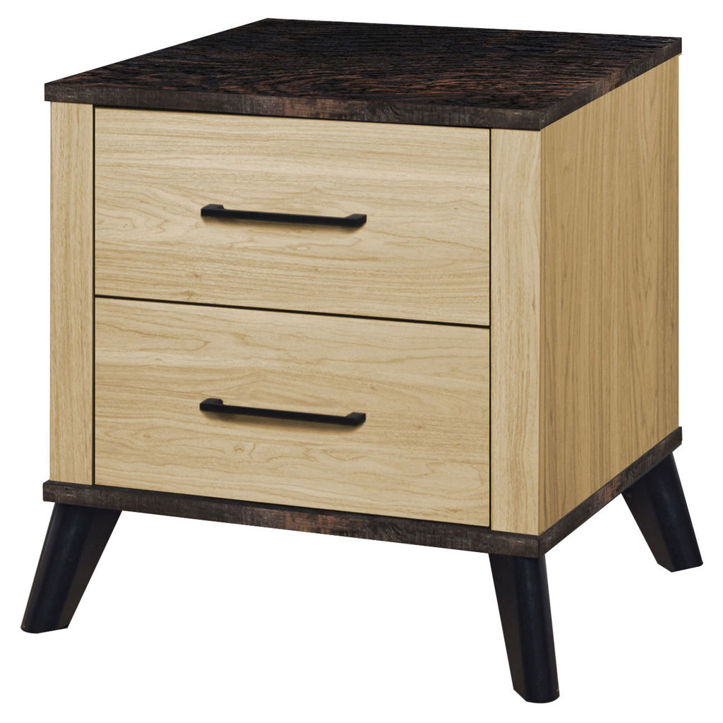 Combine functionality and modern style with this stunning two-drawer nightstand. Featuring a light oak laminate finish with a rich black laminate top, it delivers clean sophistication and everyday practicality.