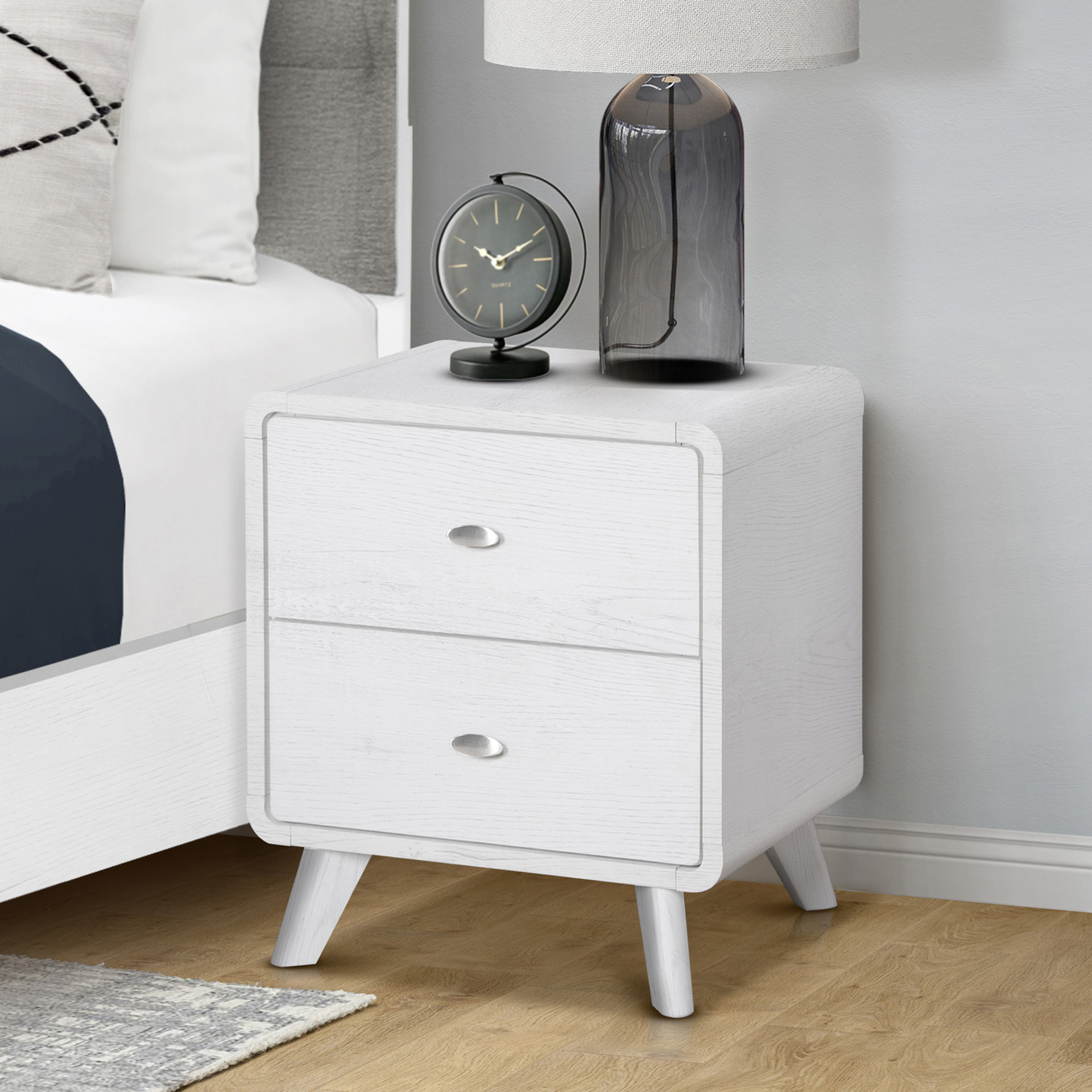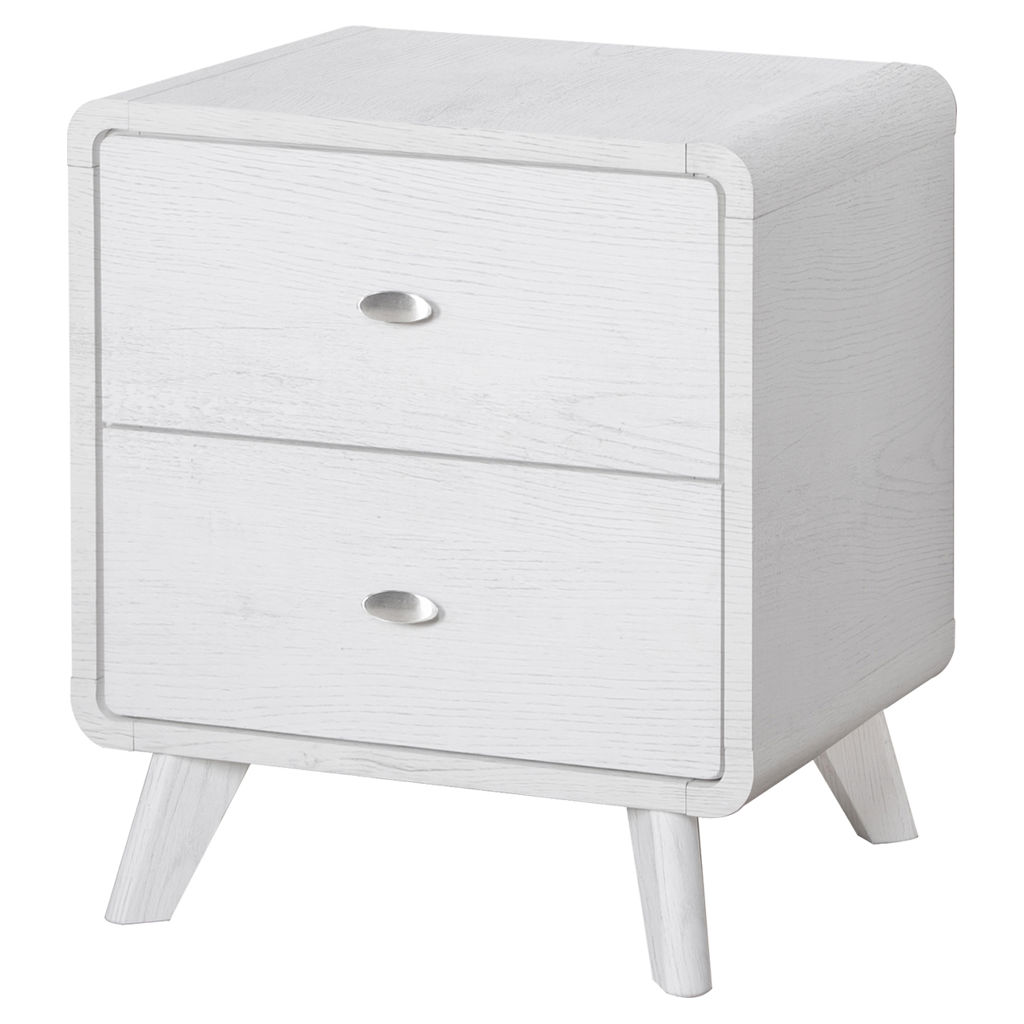 Add charm and functionality beside your bed with this chic two-drawer nightstand, featuring a fresh white oak laminate finish on all sides. Thoughtfully crafted with an engineered wood frame and solid wood legs, this nightstand not only makes a stylish statement but is built to stand the test of time.