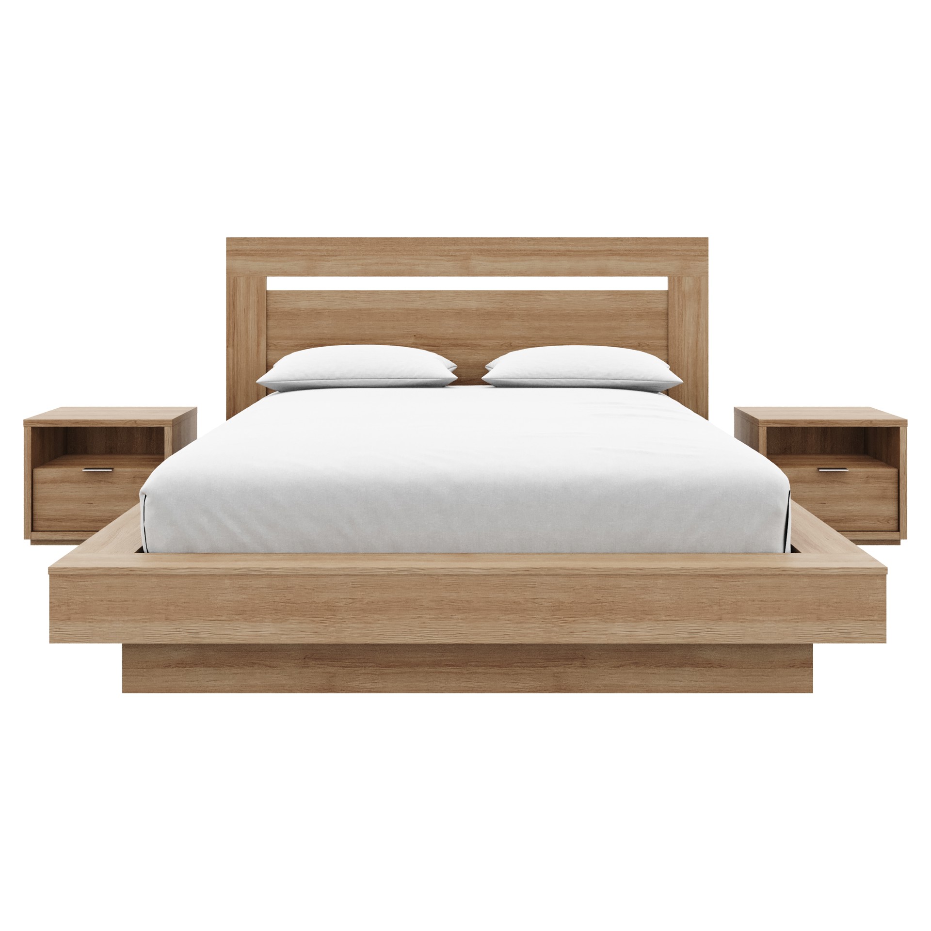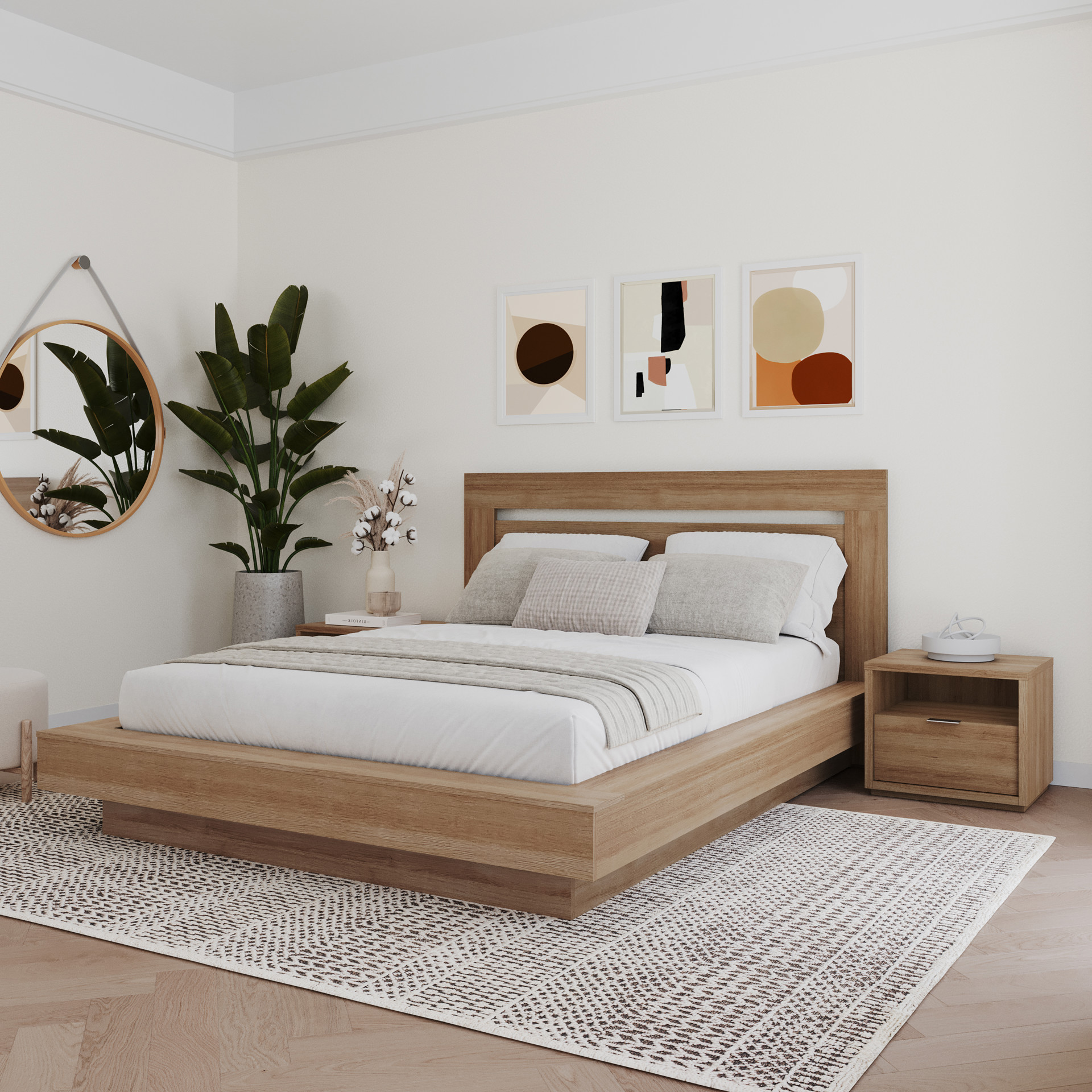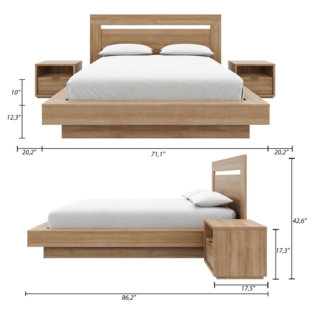 Elevate the sophistication of your bedroom with our brown oak platform bed, a sleek yet sophisticated piece meticulously crafted from premium engineered wood. Its minimalist design brings a modern, contemporary touch to your resting space. The central supports and concealed plinth base create a unique floating effect, giving your bedroom a distinctive look.