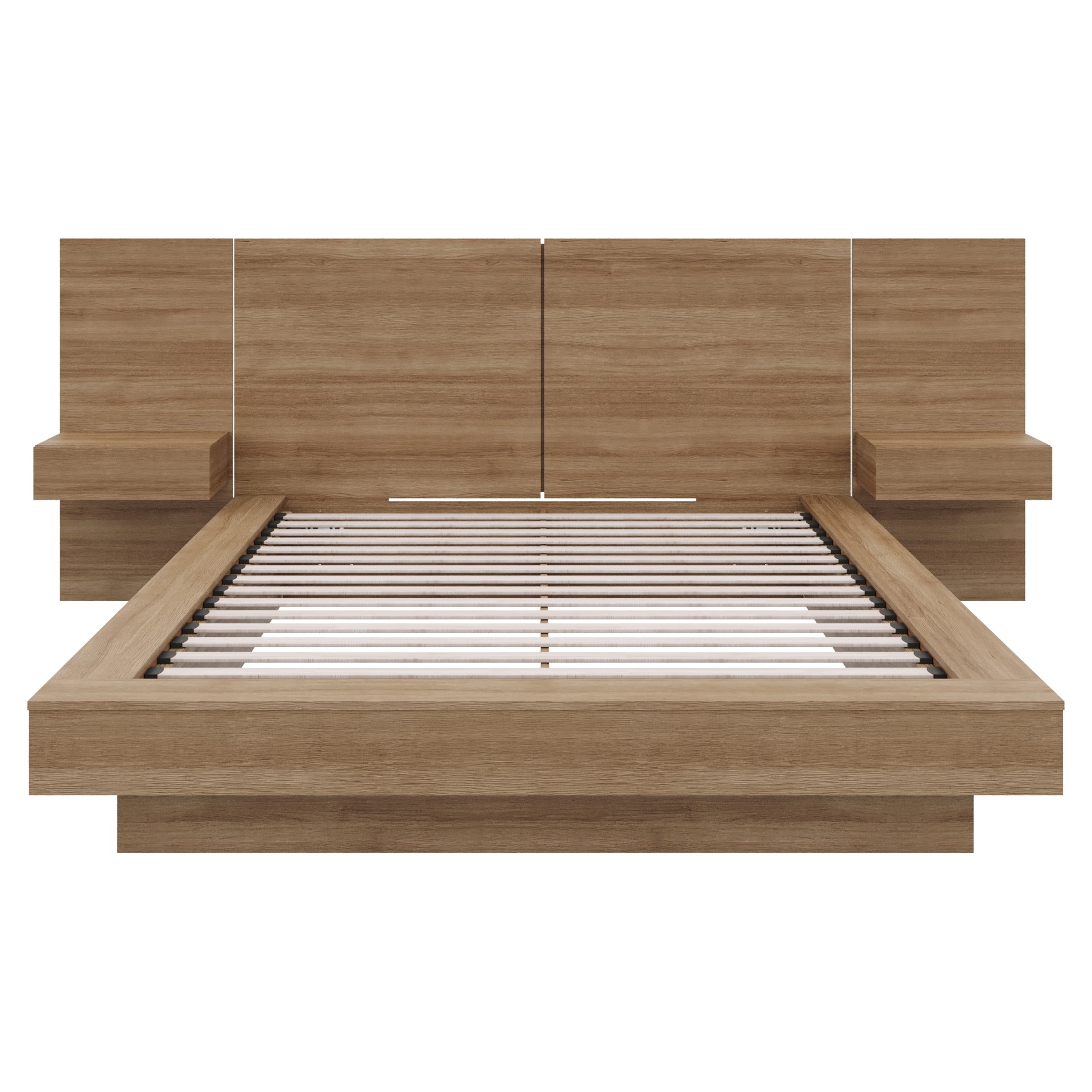The extra-large bedside panels not only offer a modern aesthetic, but also serve as practical surfaces for your books or charging devices. The central supports and concealed plinth base create a unique floating effect, giving your bedroom a distinctive look.