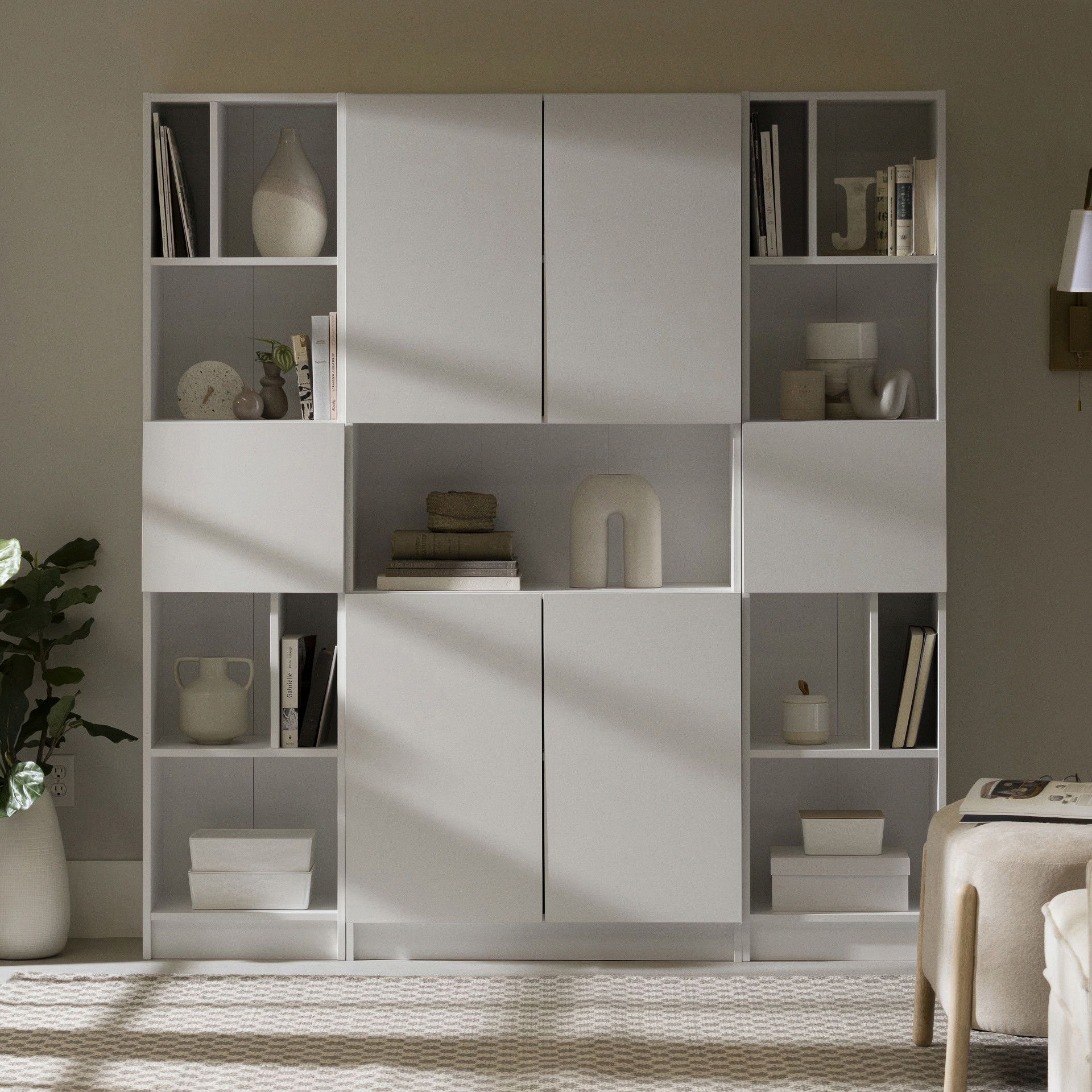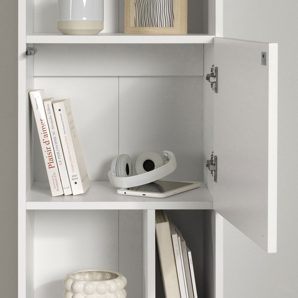 CLOSED STORAGE: In the center of the bookcase is a closed storage compartment. The door opens with a gentle push. Conceal cables, chargers and toys to keep your living room tidy.