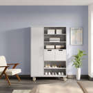 The off white finish and the brush nickel handles pair seamlessly with any room's decor while offering five shelf spaces and two drawers.