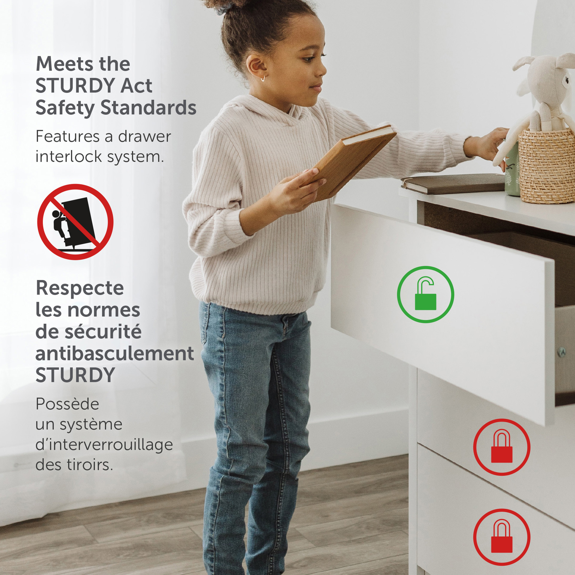 Your family’s well-being is important to us. That’s why our clothing storage furniture complies with the anti-tip safety standards required by the STURDY Act (Stop Tip-overs of Unstable, Risky Dressers on Youth) and includes a drawer interlock system that allows only one row of drawers to open at a time.