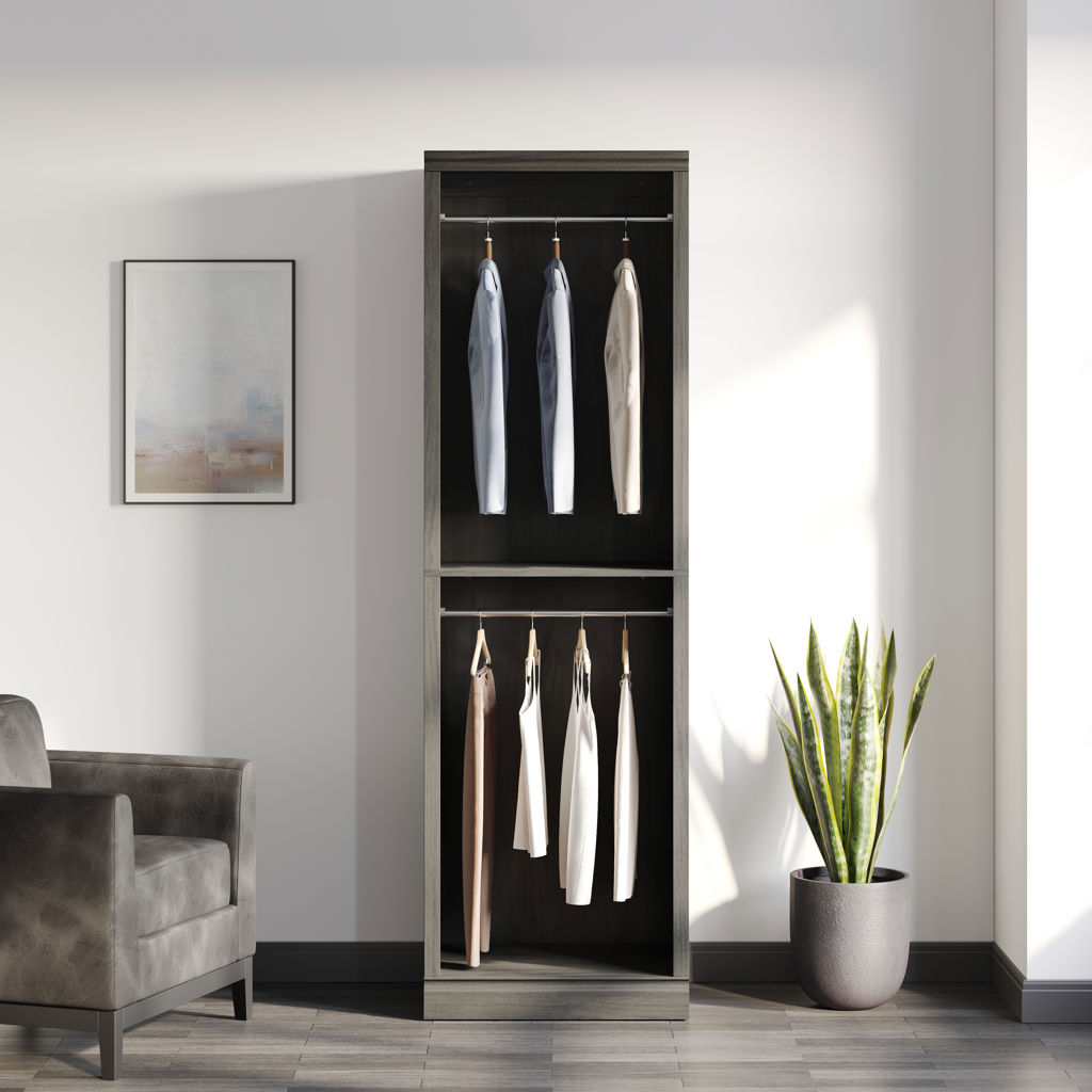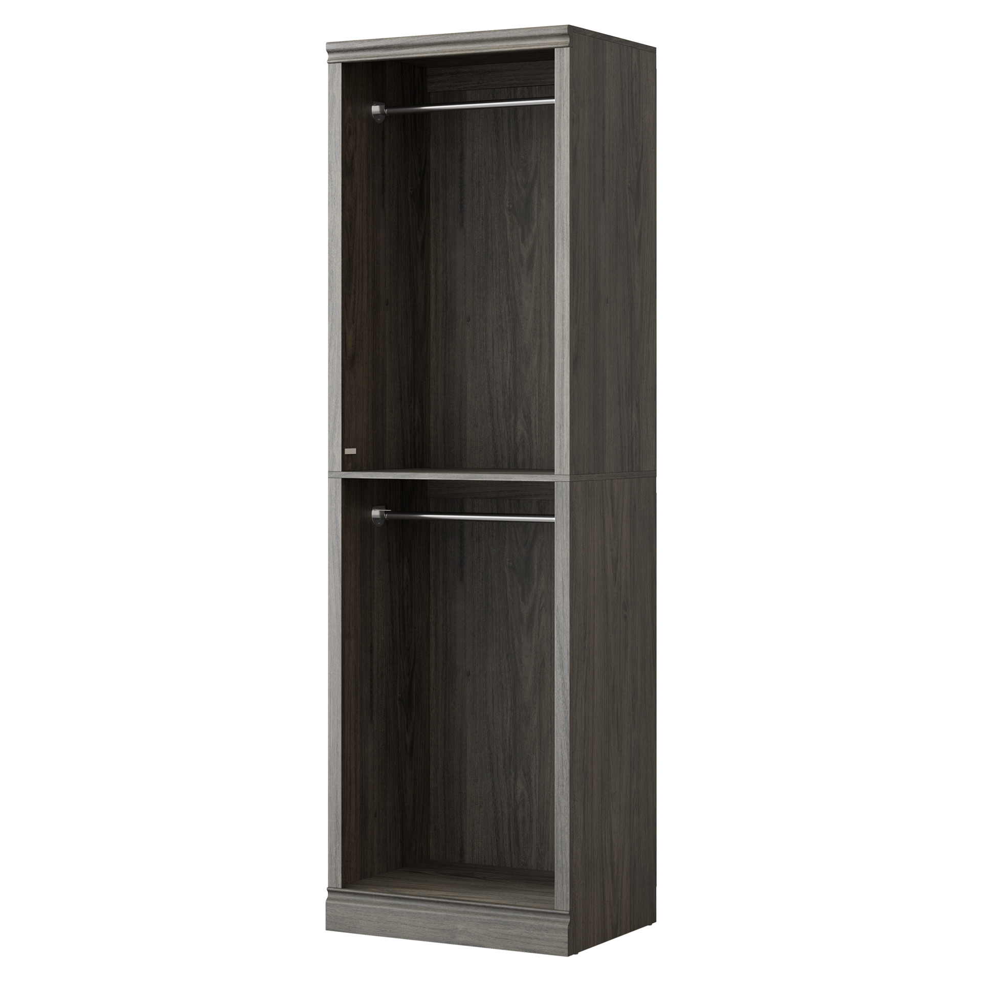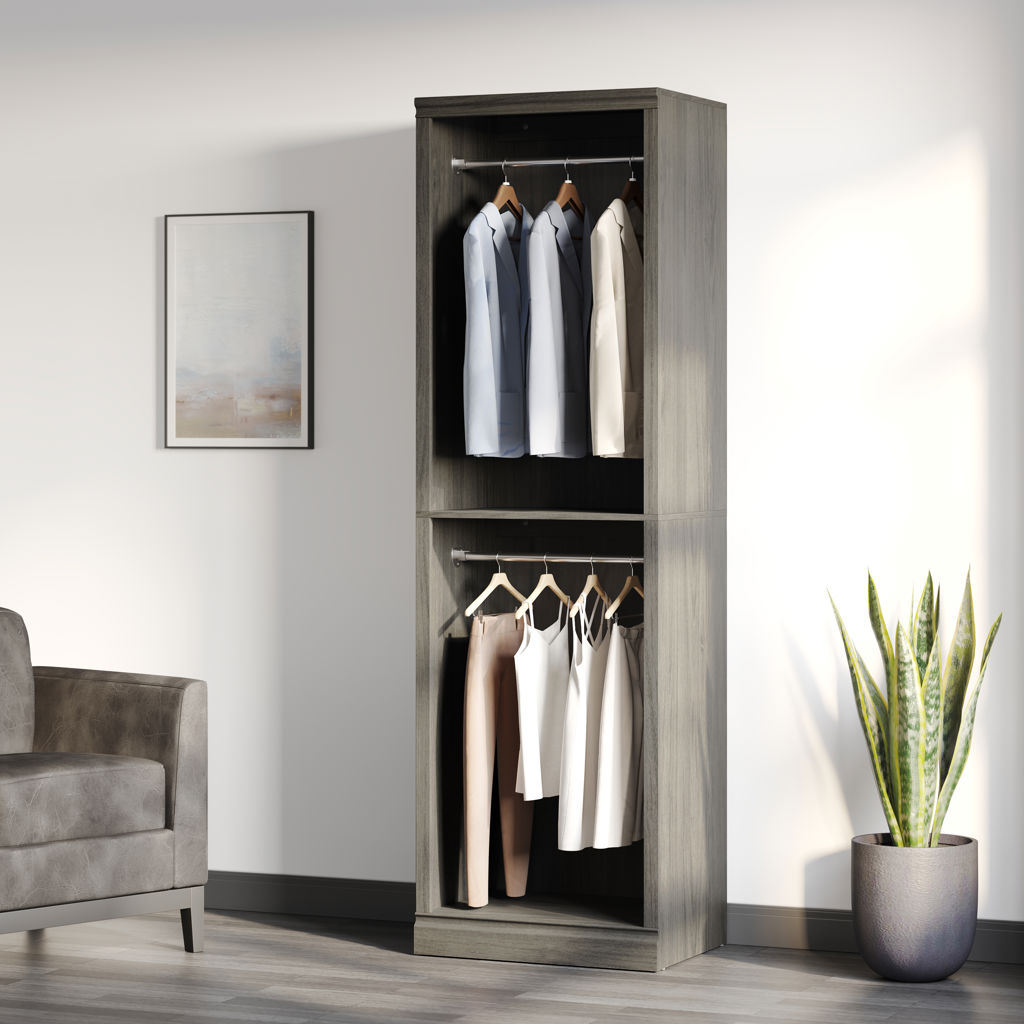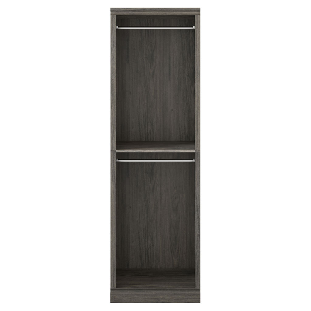 Enjoy seamless access to everything. Your favorite clothes hang from the brushed nickel pole. Find your favorite pair of boots hidden on the shelf or grab your stylish luggage from the shelf before a trip. Expand your organizational skills by selecting additional pieces from the Scott Living Nolan closet system. Line-they're interchangeable and can easily increase your storage capacity.