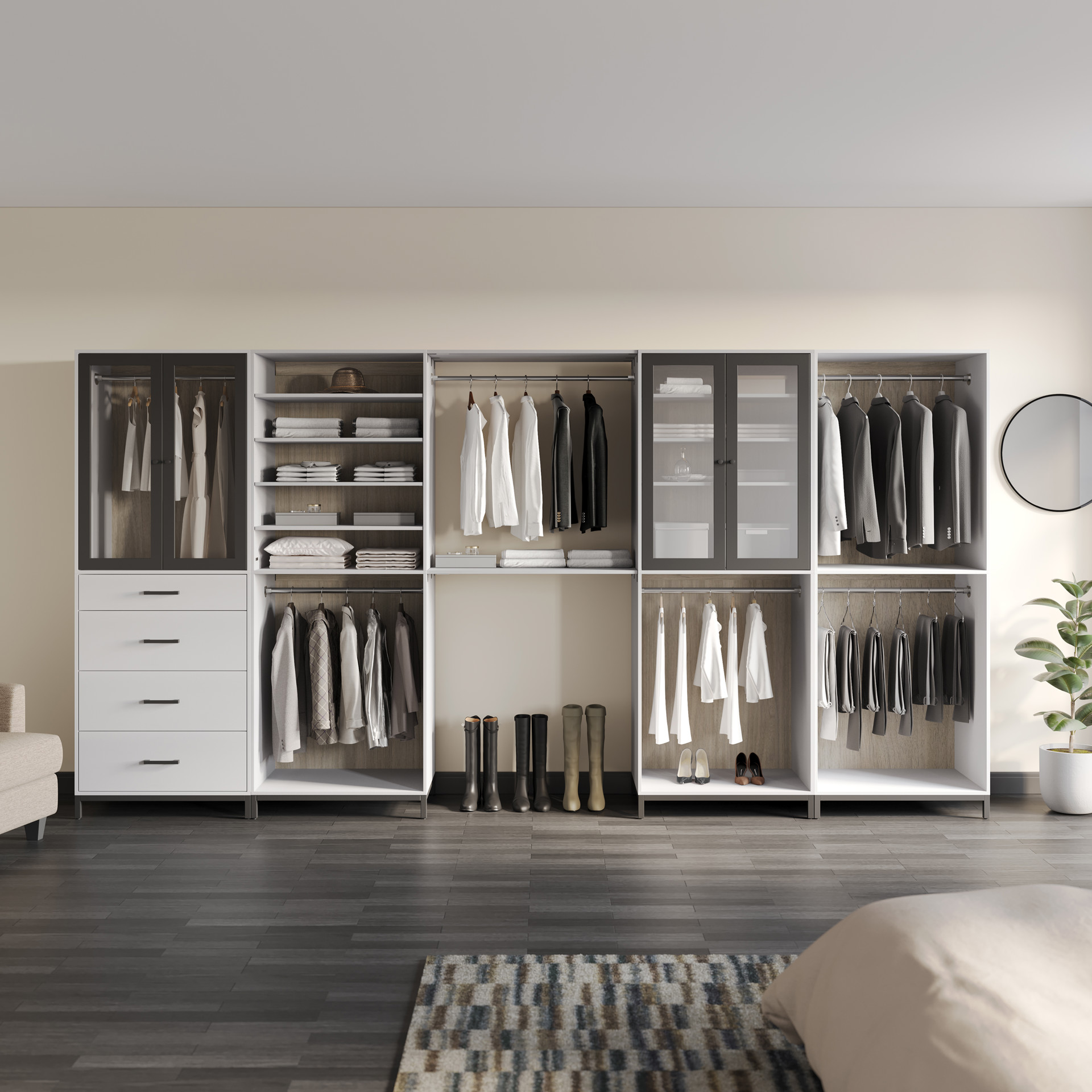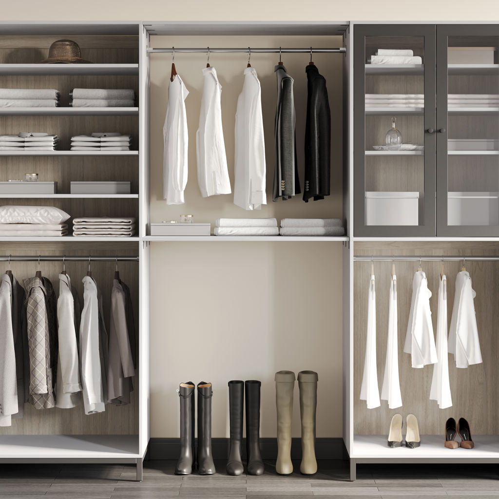 This closet's light grey finish, clear glass door and matte black handles add clean lines and neutral tones to any closet space.