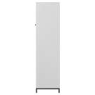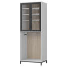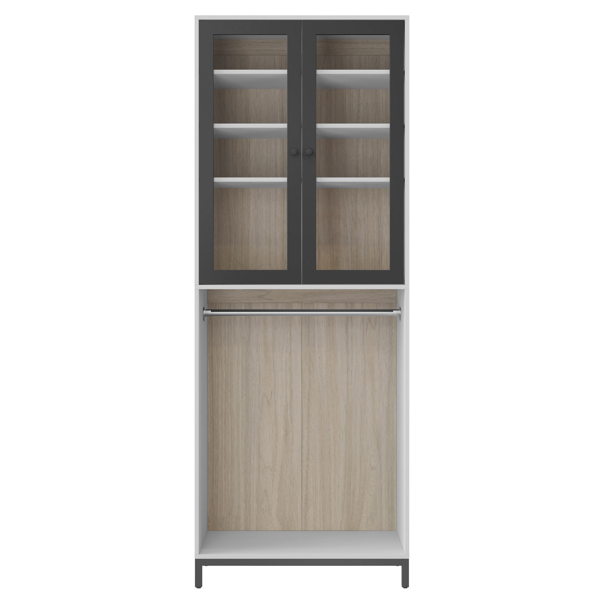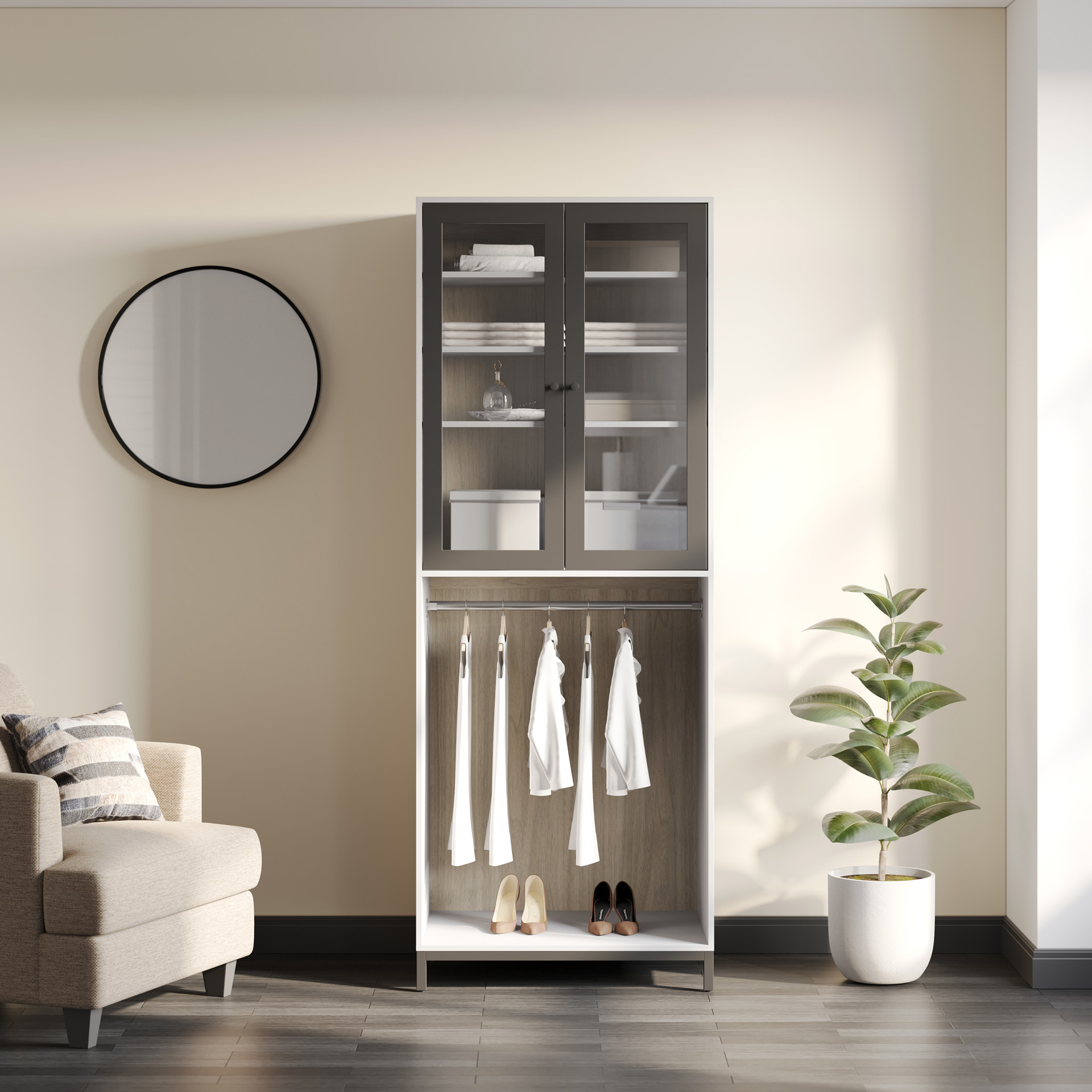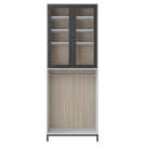 Finished in light grey, it offers a compact, elegant design. Meanwhile, the glass doors, framed in matte black, let you see inside the cabinet, where you can easily hang objects against the walnut-finished panel. When you close the doors, the closed European hinges ensure smooth, easy door closure.