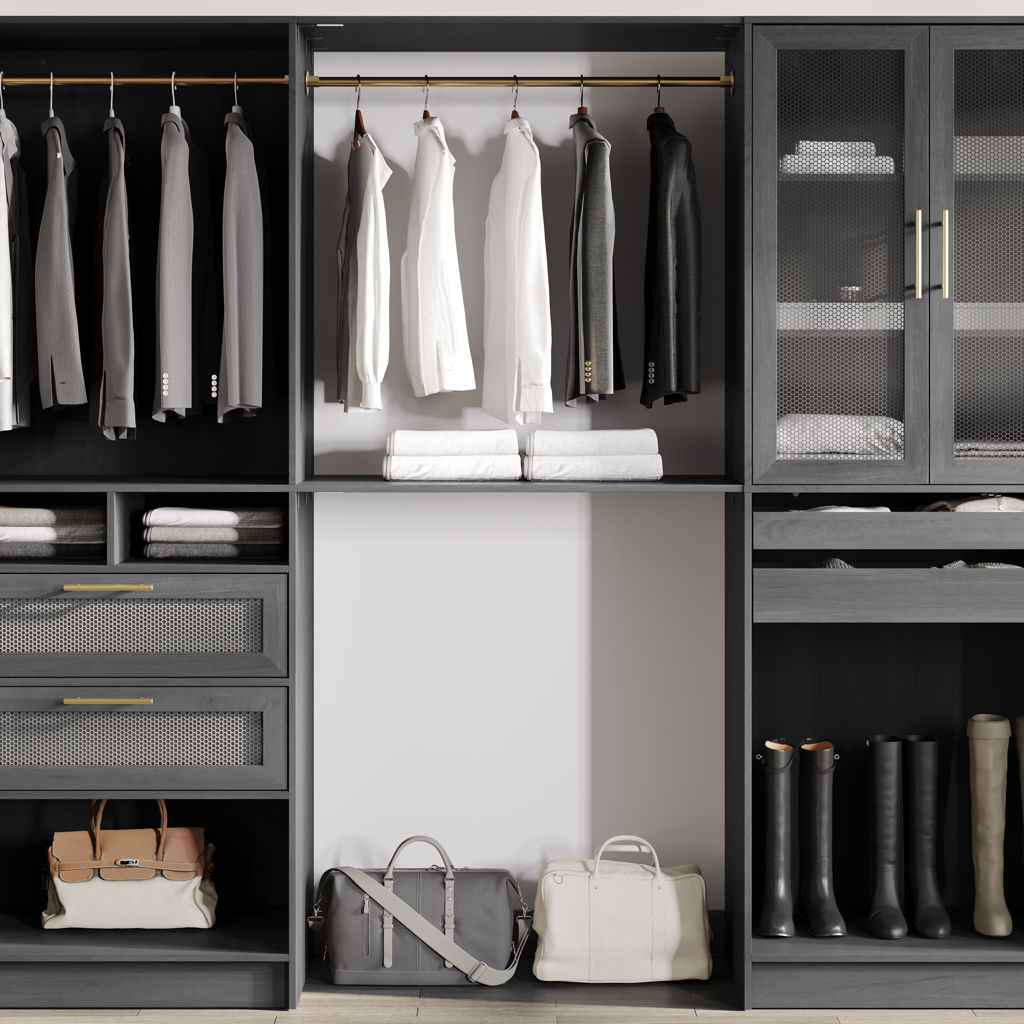 • A dark pearwood finish warms up any modern closet space.