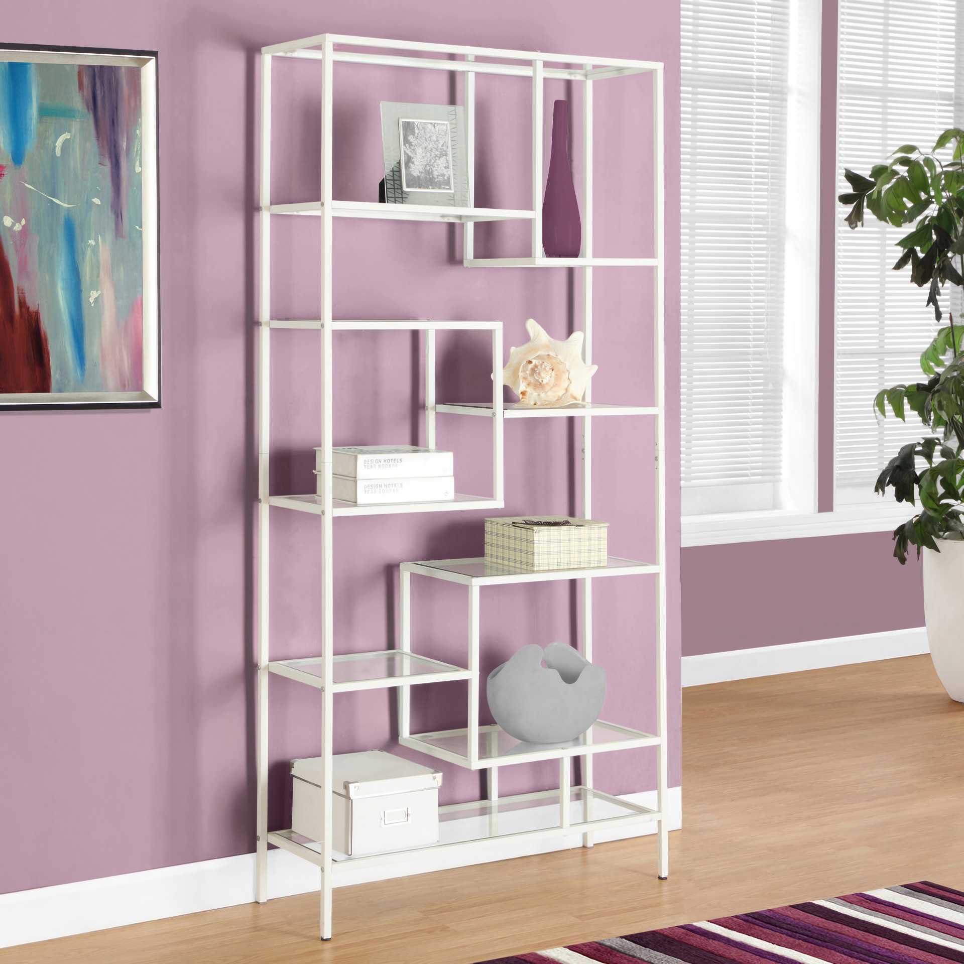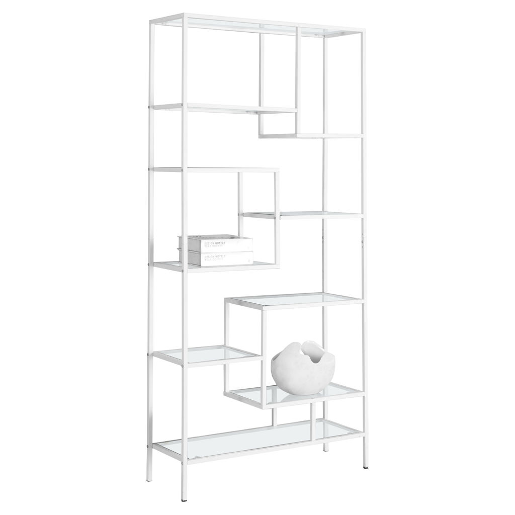 Maximize the space in your room; this shelf is ultra-practical. The white metal bookcase sits perfectly against the wall; 9 tempered glass shelves are ideal for books, plants, picture frames and more.