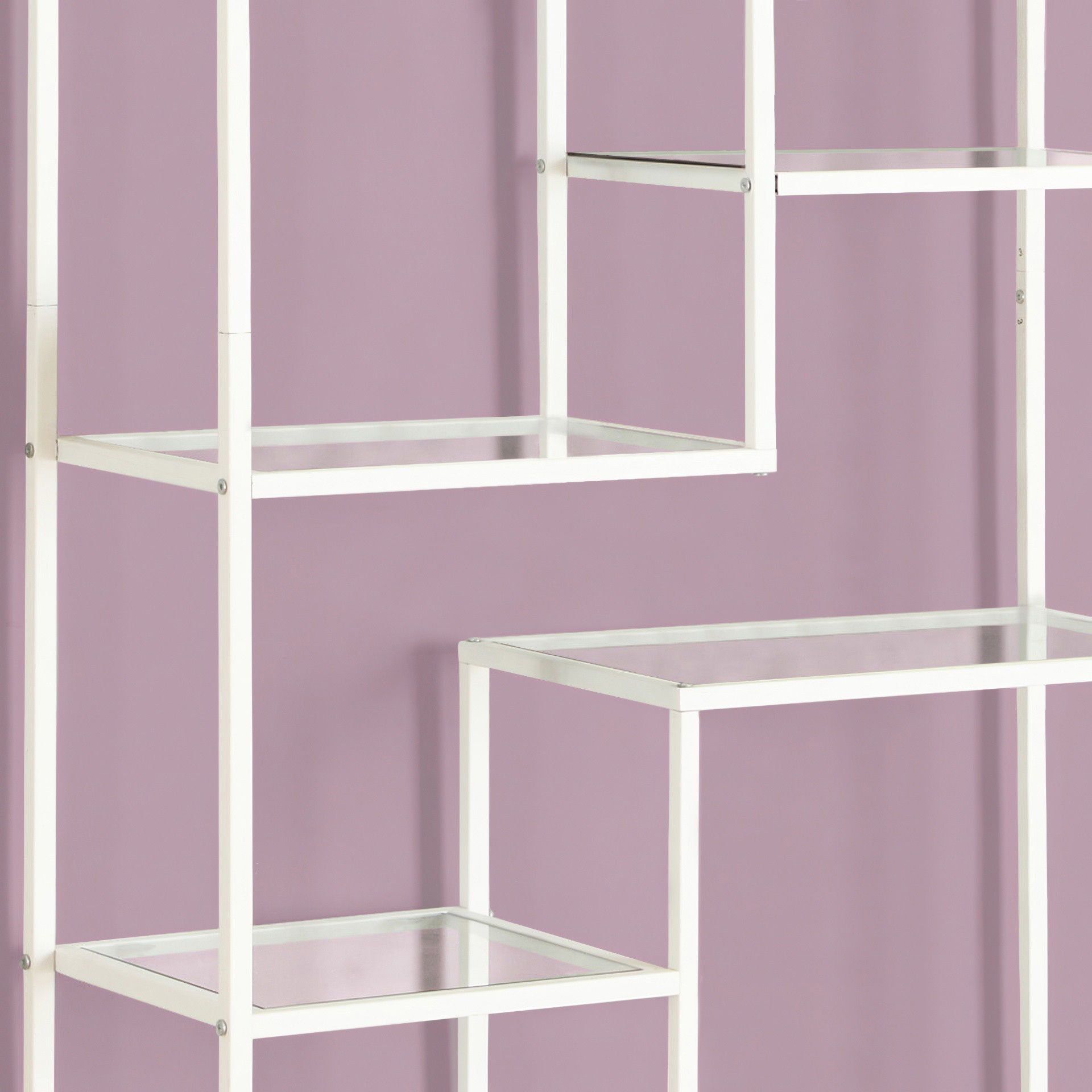 With this modern white metal unit, you'll certainly make full use of the space available with nine sturdy tempered glass shelves. With high-end structural integrity, this shelf has everything you need.