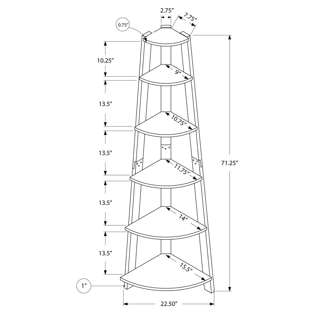 Maximize the space in the corner of your room; this shelf is ultra-practical. The bookcase fits perfectly in the corner; 5 shelves constructed of thick panels are ideal for books and other decorative items.
