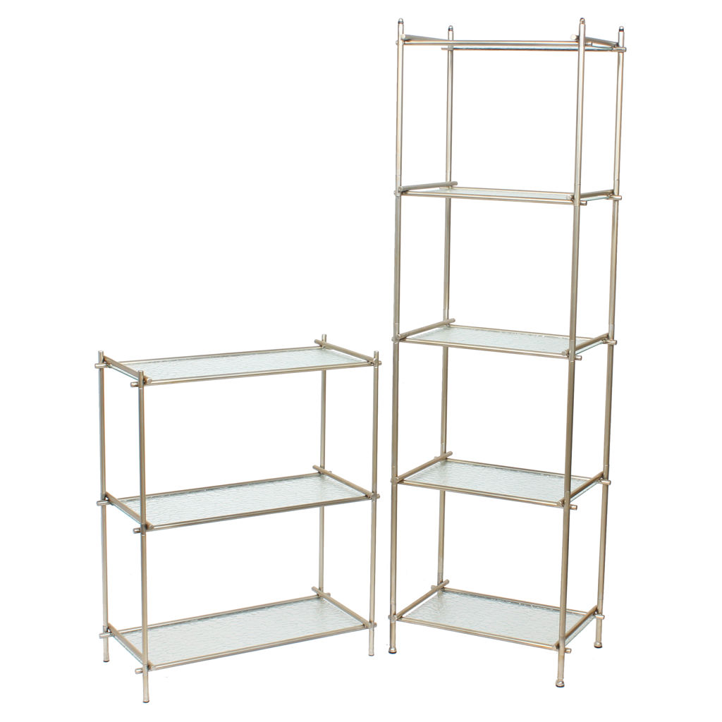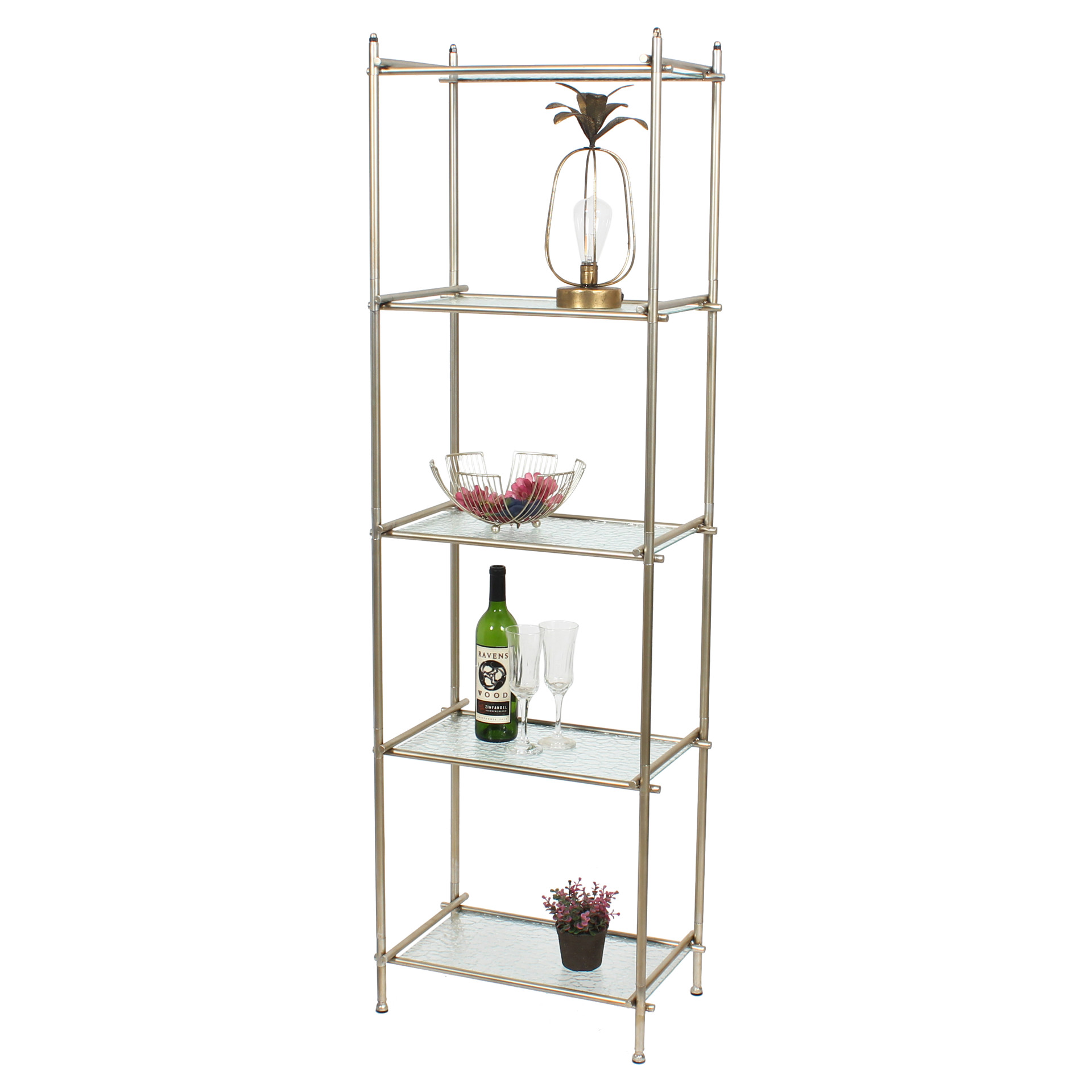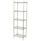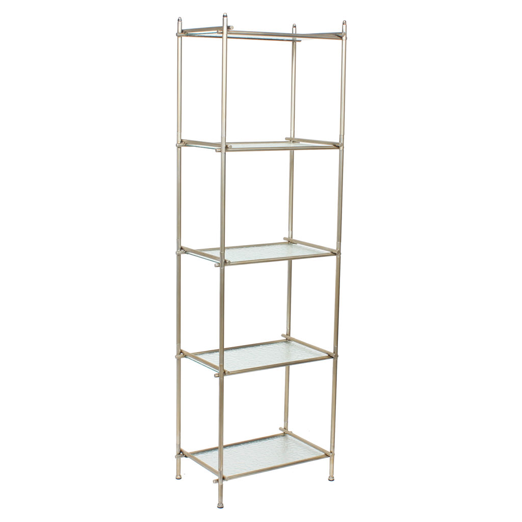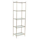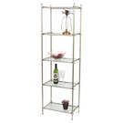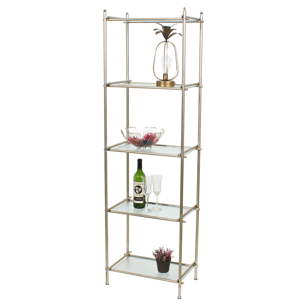 This understated shelving unit will be a functional and stylish addition to your living space. The open design and subtle colours will allow your books, photos, plants, and decorative accessories to take centre stage. Or perhaps use it as a liquor display shelf to serve your friends and family. Whatever your purpose, this shelf will suit any aesthetic decor, from farmhouse chic to cottage, vintage to modern and contemporary. Five levels to hold and display items. Textured glass shelves that will give your space a light and airy feel. Metal frame overlaps at each corner for visual interest. Frame is finished in a soft, satin gold to complement the glass shelves.