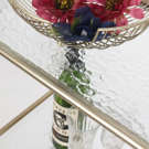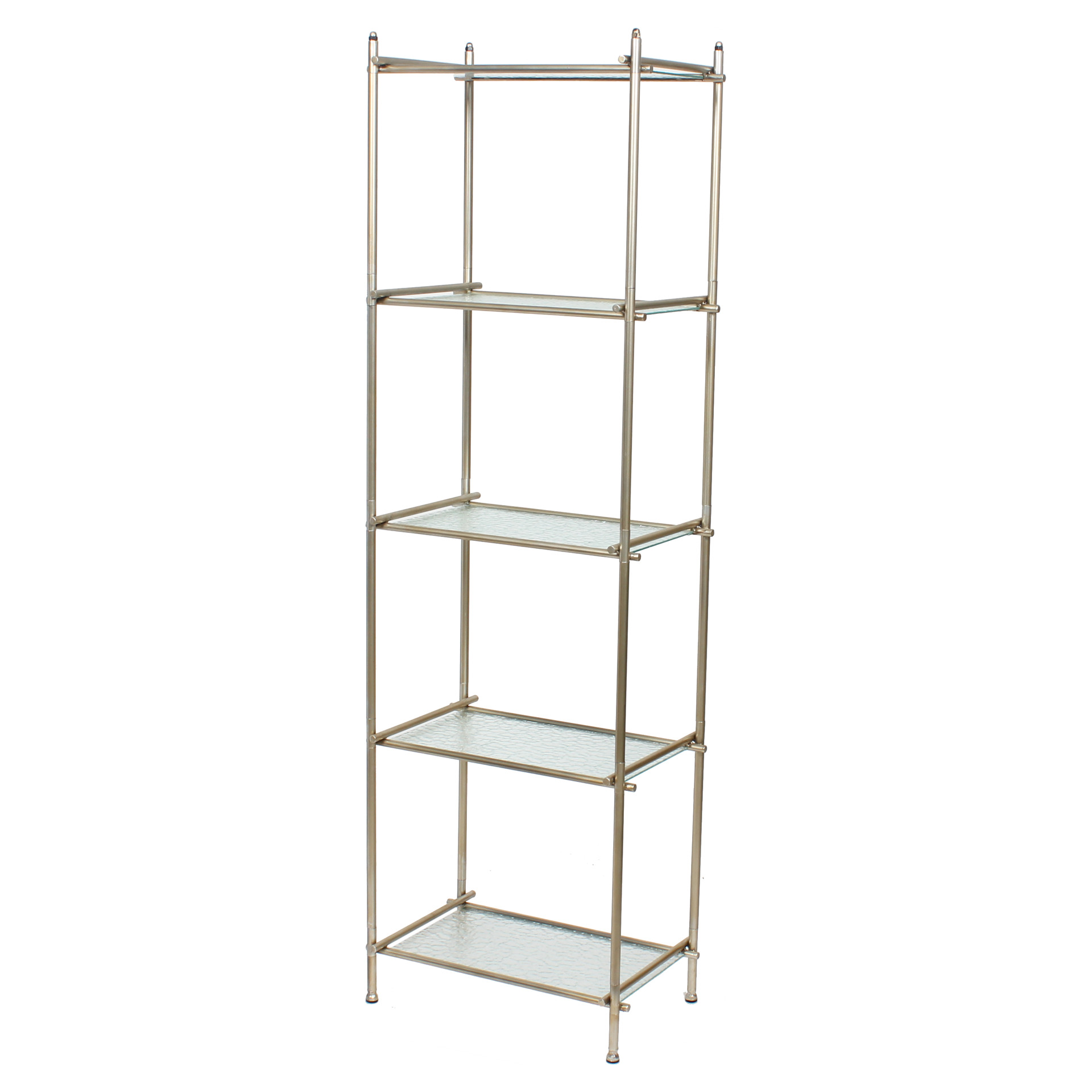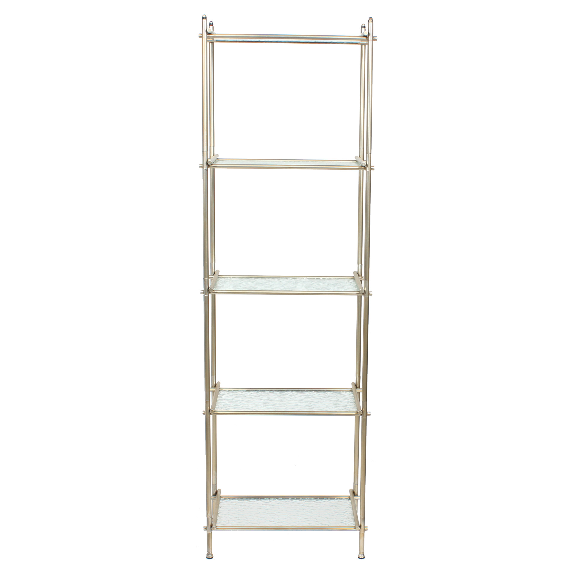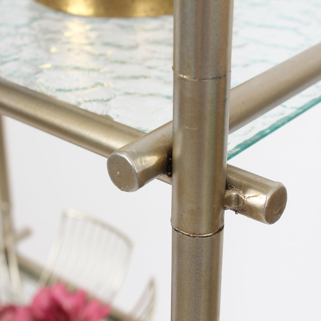 This understated shelving unit will be a functional and stylish addition to your living space. The open design and subtle colours will allow your books, photos, plants, and decorative accessories to take centre stage. Or perhaps use it as a liquor display shelf to serve your friends and family. Whatever your purpose, this shelf will suit any aesthetic decor, from farmhouse chic to cottage, vintage to modern and contemporary. Five levels to hold and display items. Textured glass shelves that will give your space a light and airy feel. Metal frame overlaps at each corner for visual interest. Frame is finished in a soft, satin gold to complement the glass shelves.