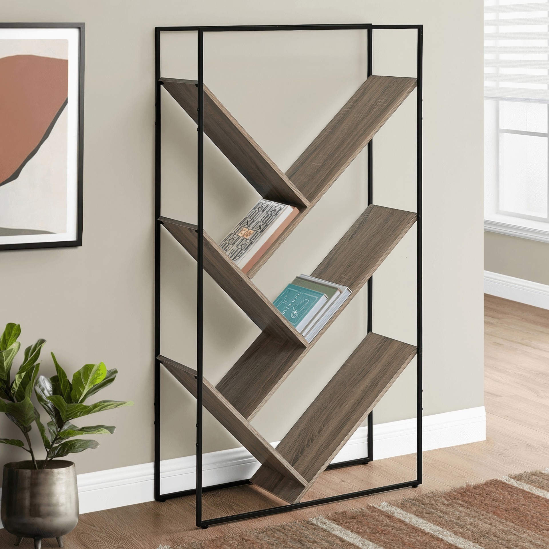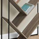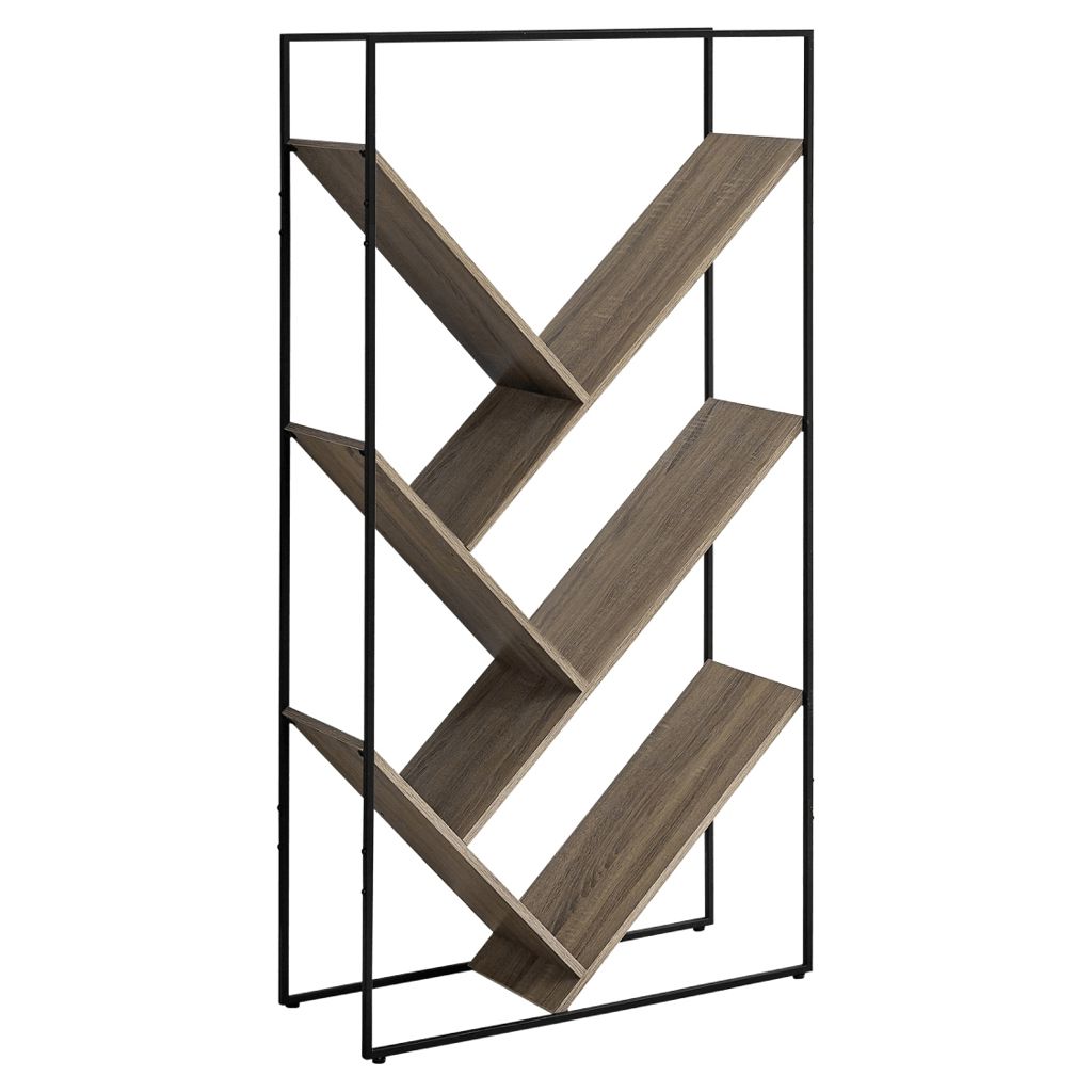 Look at storage from a different angle with this unique bookcase. Slanted shelves in a dark taupe wood-look finish with a wood-grain texture create eye-catching geometric angles that form V-shaped display areas in different sizes.