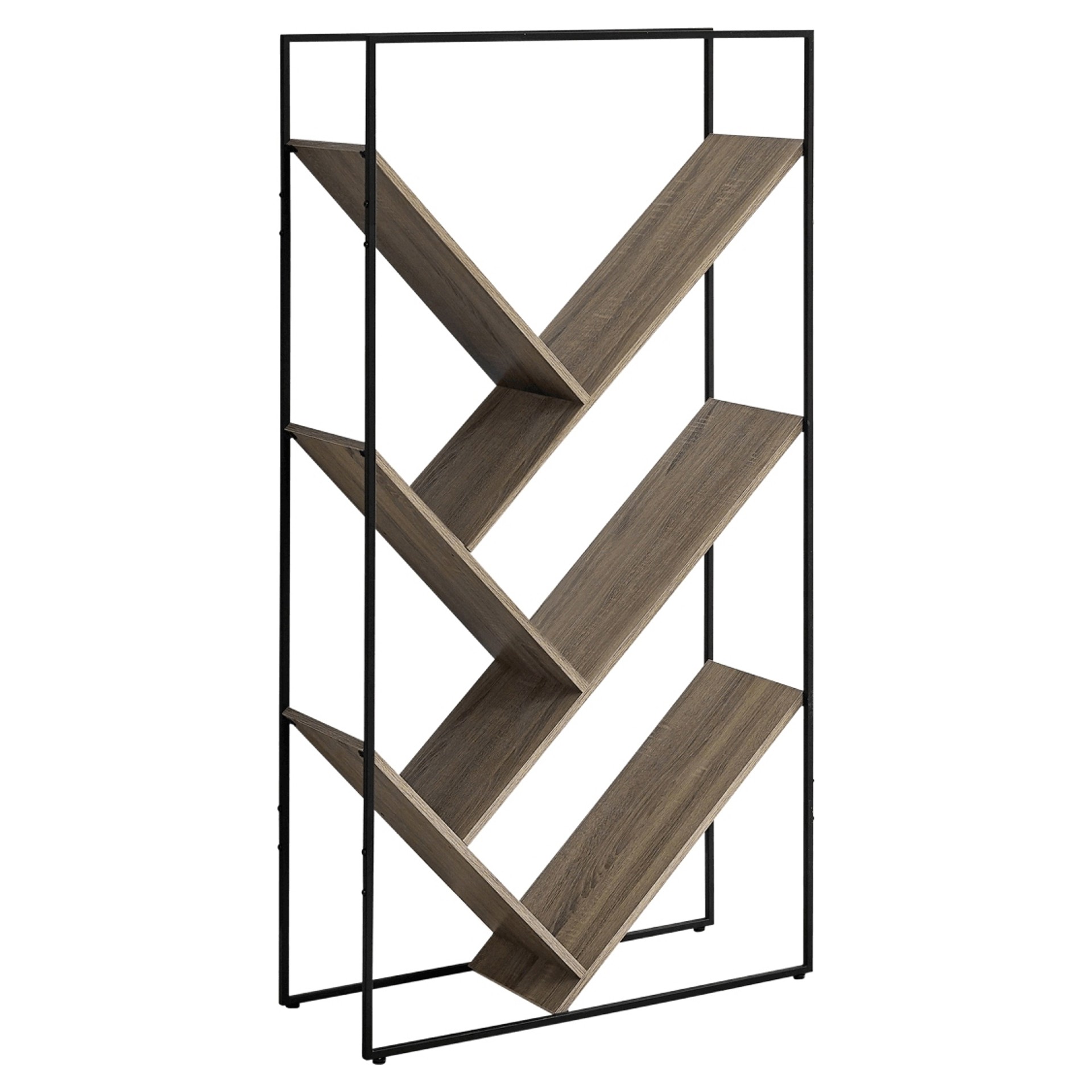 5-tier bookshelf with slanted shelves that form V-shaped storage areas of multiple sizes. Open shelves are finished on all sides in a dark taupe wood-look finish with a wood-grain texture. Slim black metal frame.