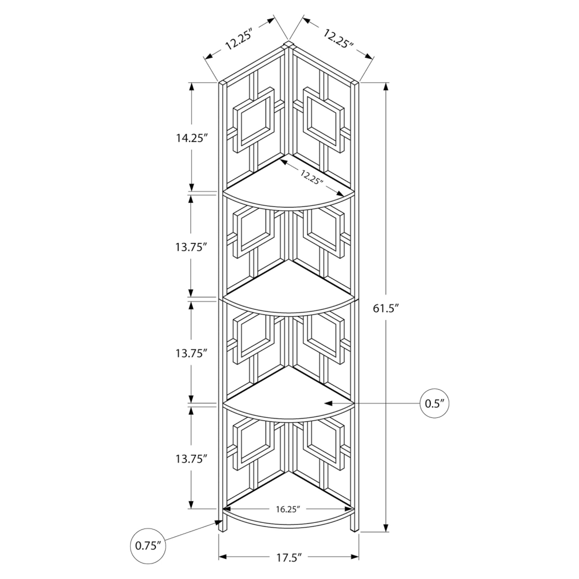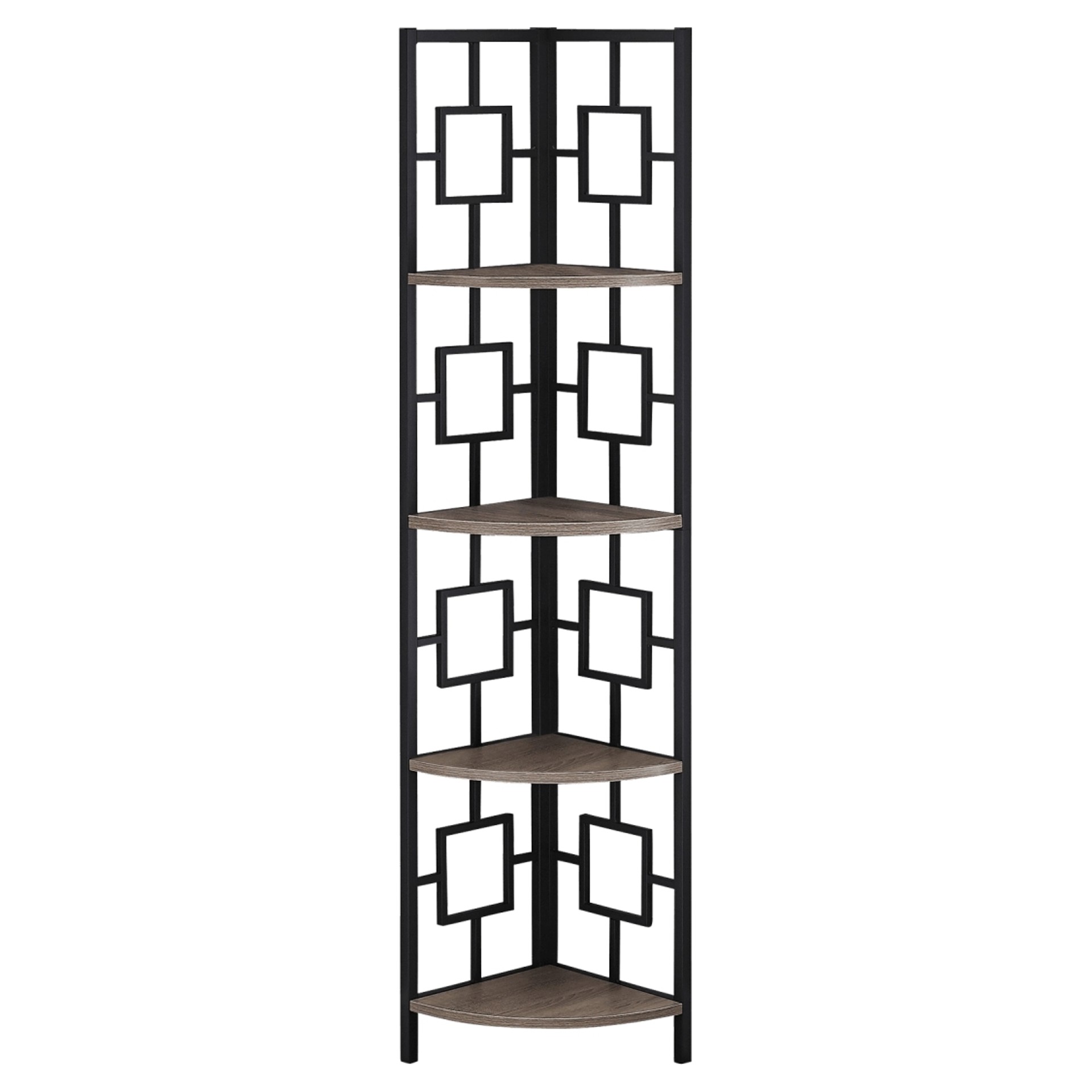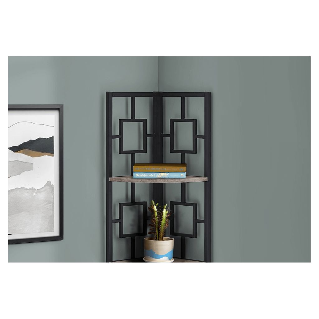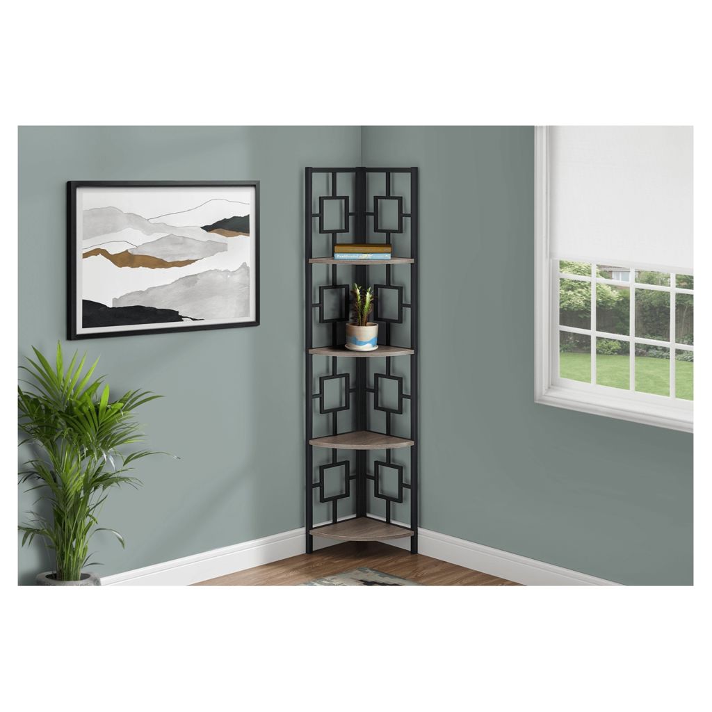 Including 4 solid dark taupe wood-look display shelves, this corner display unit features a three-leg black metal frame and a square transitional design that will add modern flair wherever you choose to place it. This corner bookcase is sure to impress.