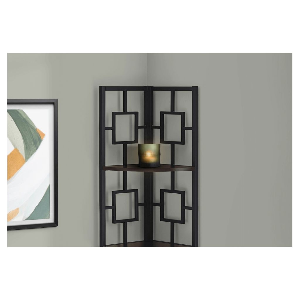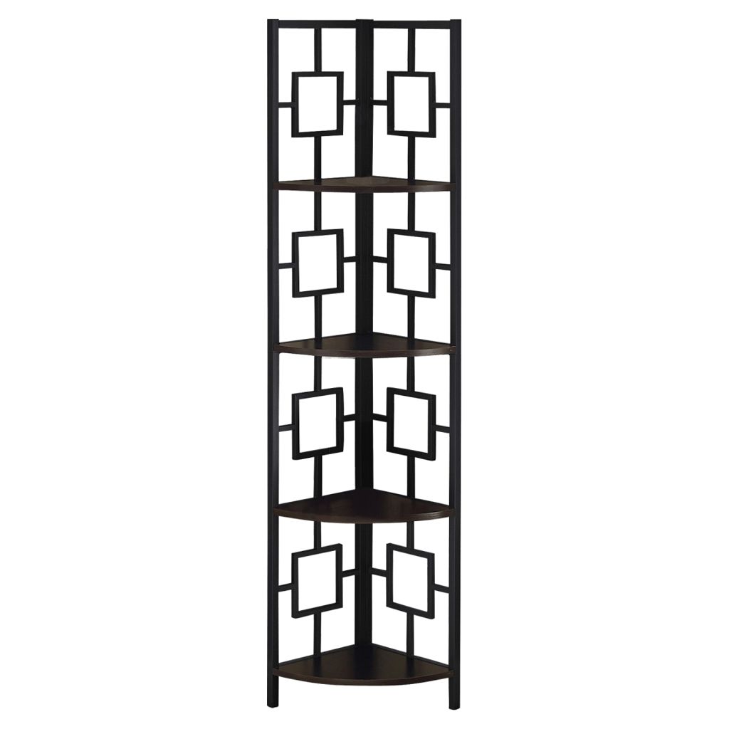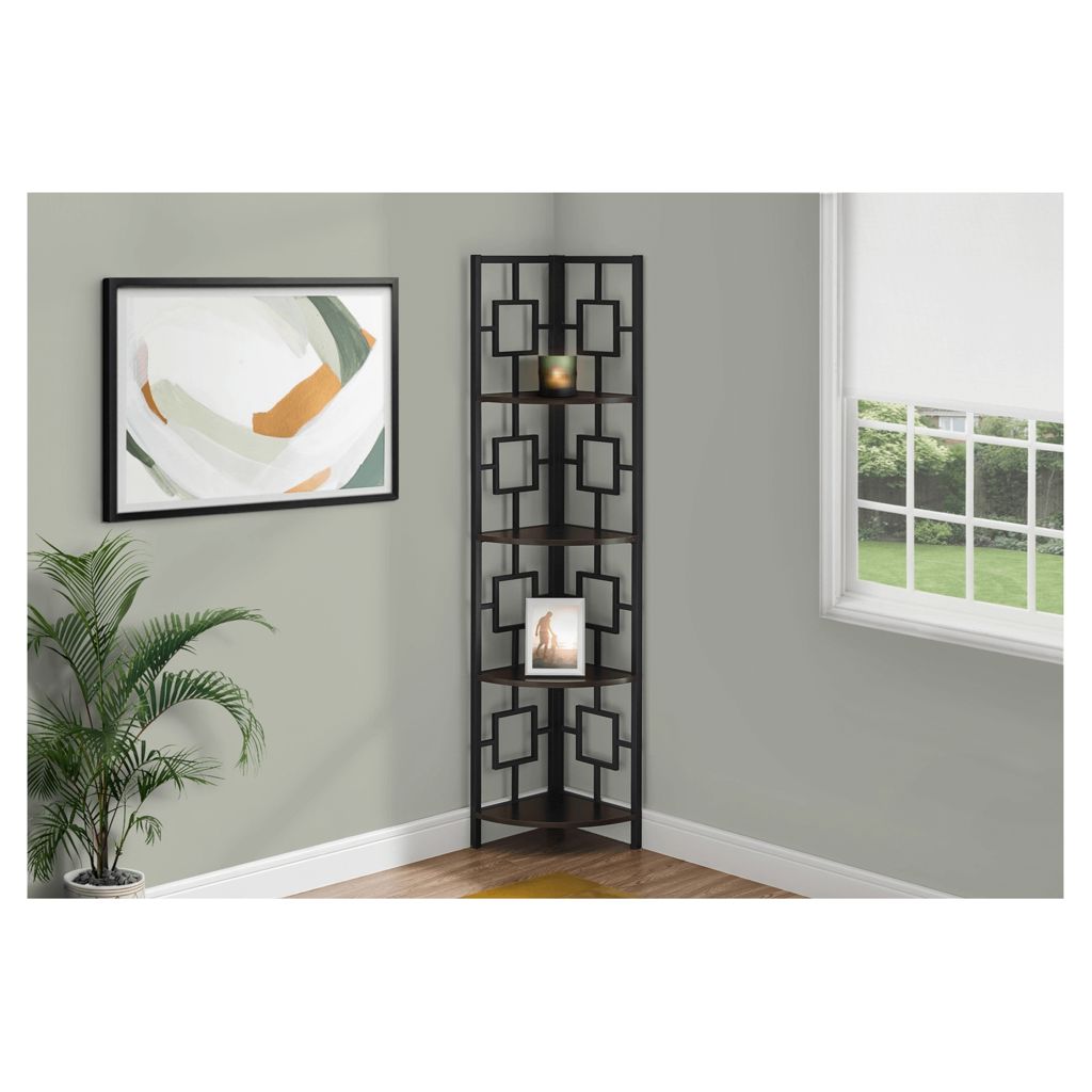 Including 4 solid espresso wood-look display shelves, this corner display unit features a three-leg black metal frame and a square transitional design that will add modern flair wherever you choose to place it. This corner bookcase is sure to impress.