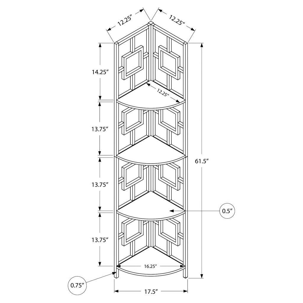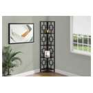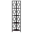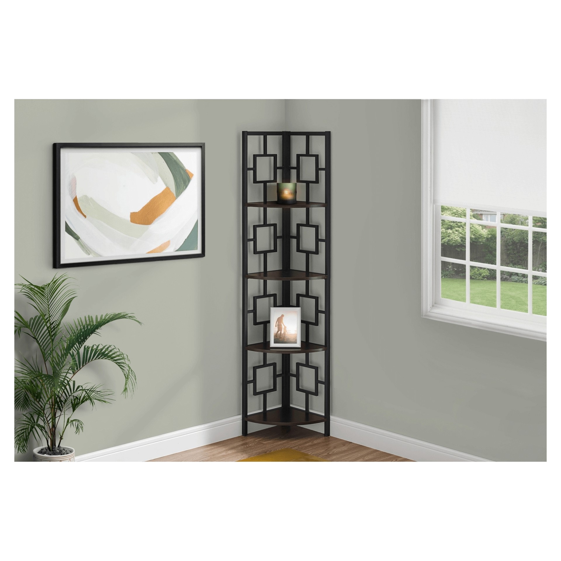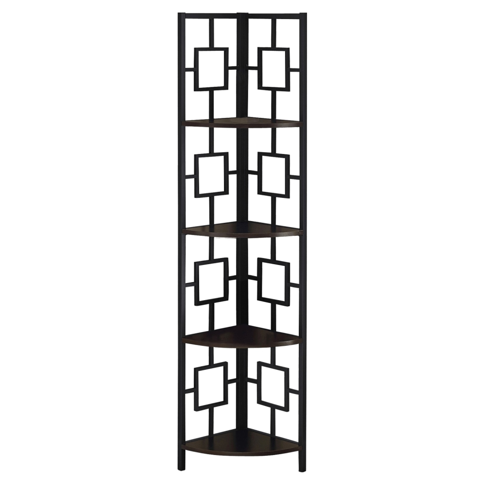 Including 4 solid espresso wood-look display shelves, this corner display unit features a three-leg black metal frame and a square transitional design that will add modern flair wherever you choose to place it. This corner bookcase is sure to impress.