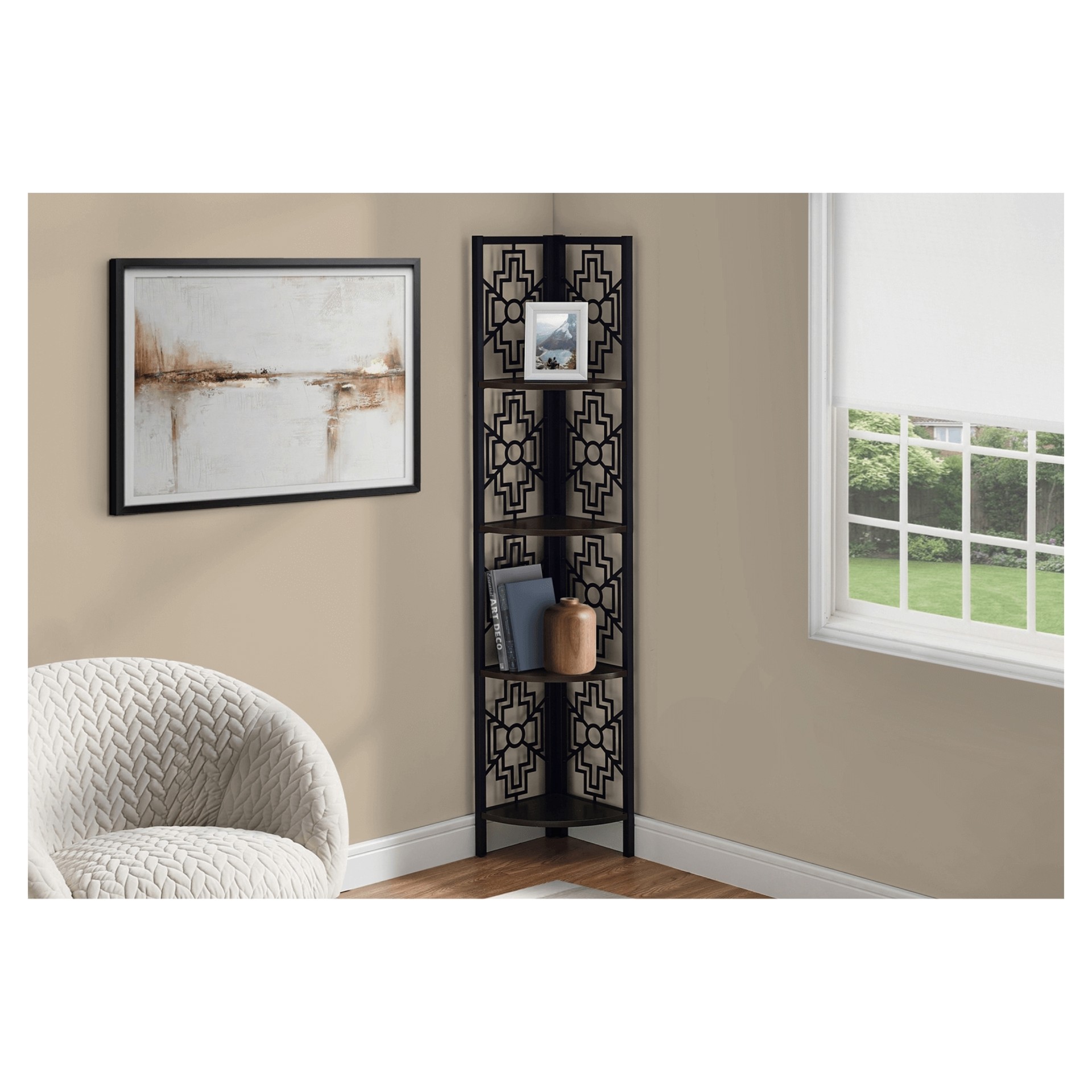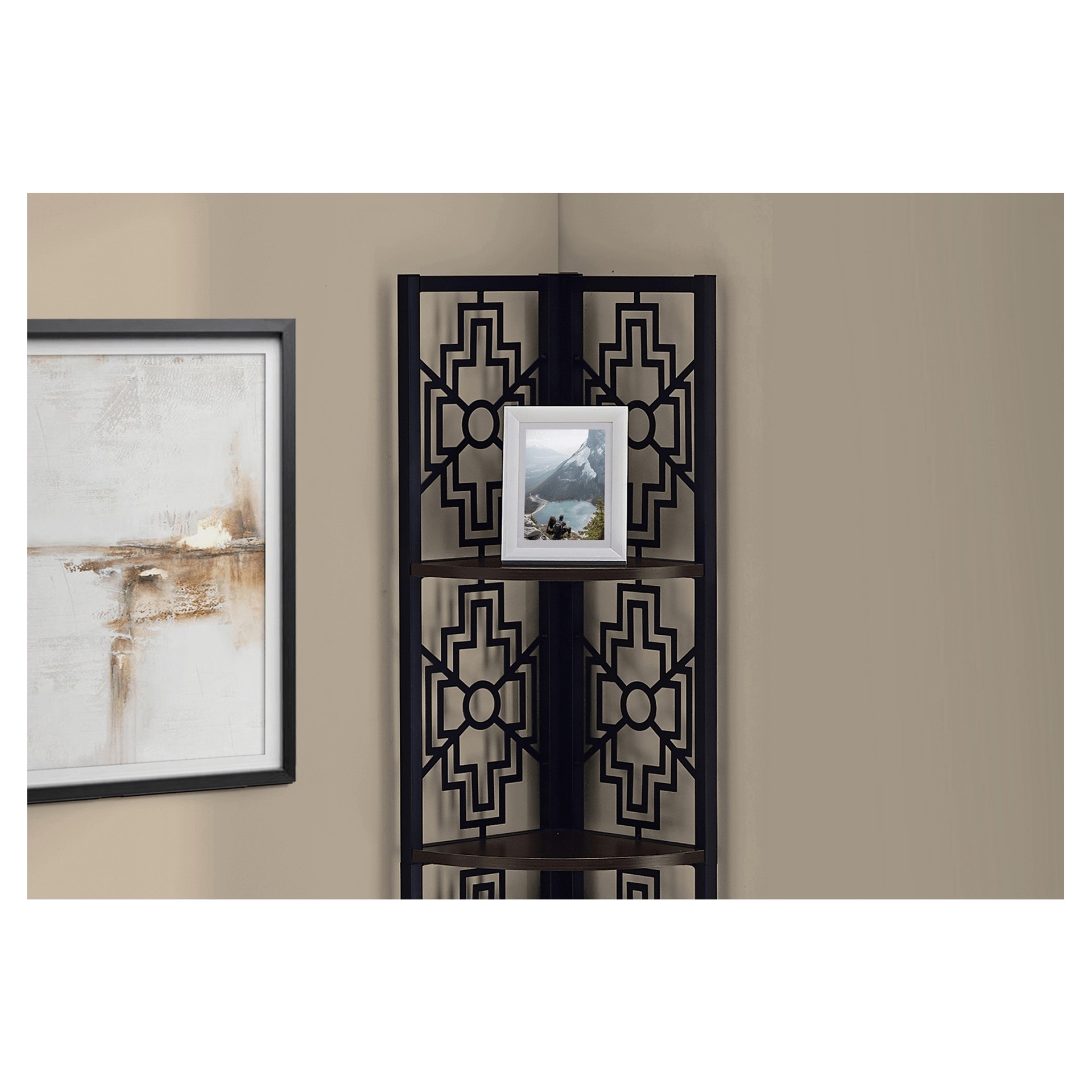 Let this stylish corner cabinet conquer the clutter in your small home, apartment or condo by providing 4 solid dark brown display shelves that are perfect for photo frames, plants, other decorative items and even kitchen accessories. Perfect for decluttering, this black metal corner cabinet features a transitional design that will elevate the look of your living room, bedroom, kitchen or office.
