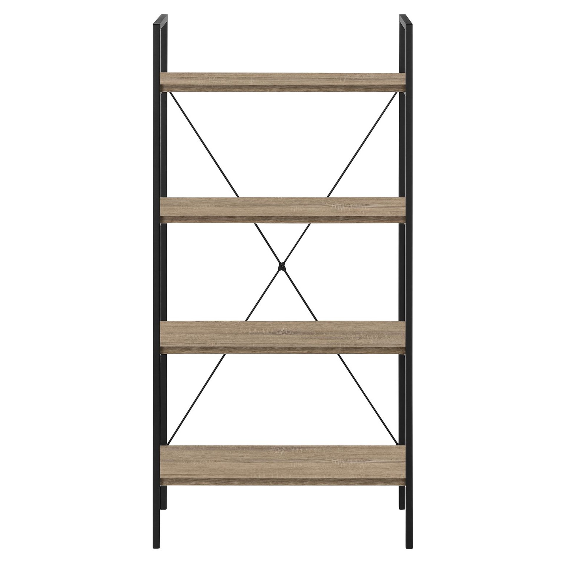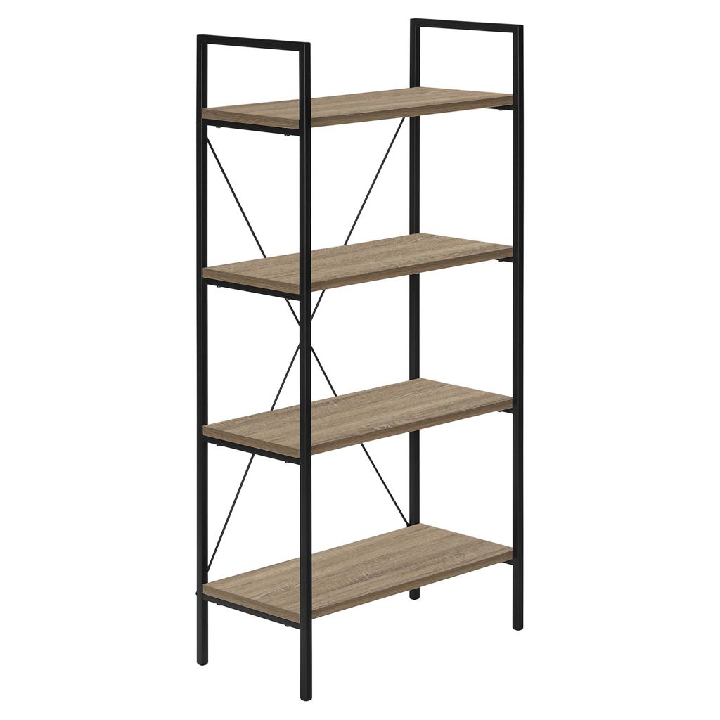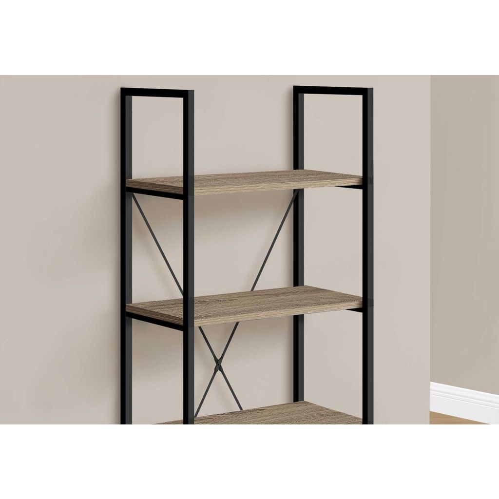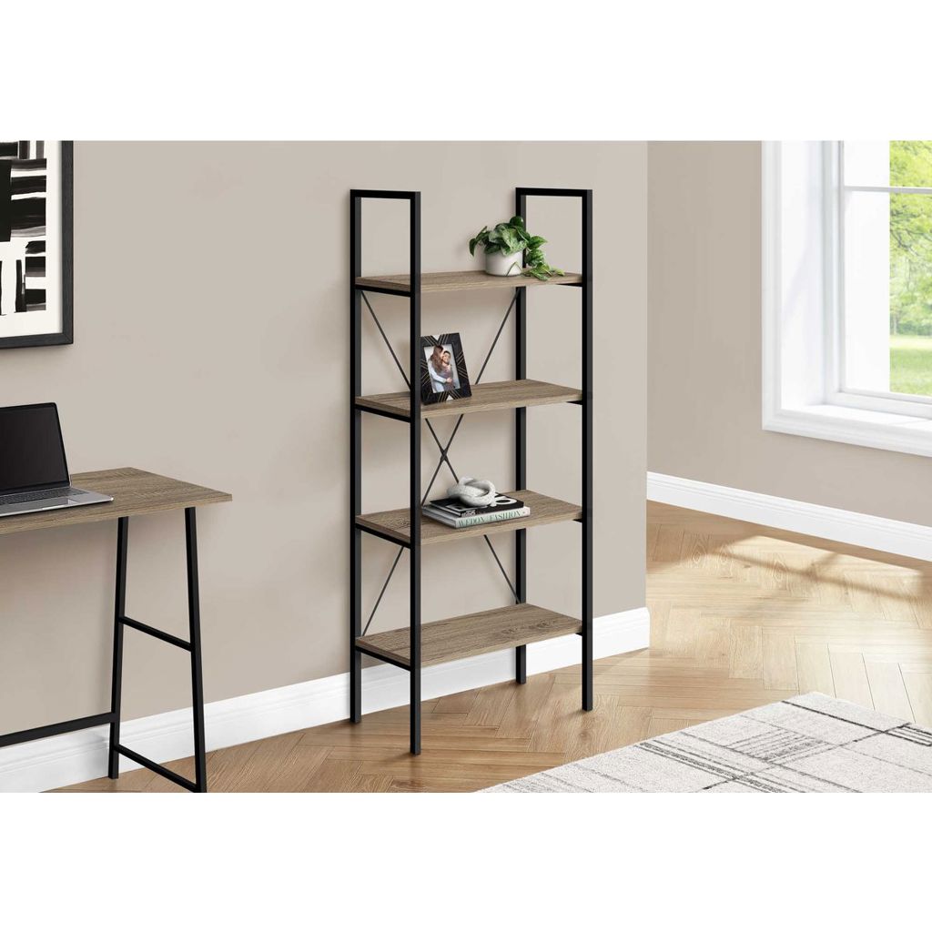 • This bookcase, finished in a dark taupe wood-look laminate, has a space-saving design and 4 shelves for maximum versatility.